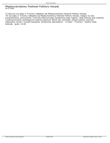 Gmina Tarnowiec Międzynarodowy Festiwal Folkloru Karpat 09.07.2008. 13 lipca po raz piąty w Trzcinicy odbędzie się Międzynarodowy Festiwal Folkloru Karpat, Po raz piąty w Trzcinicy odbędzie się Międzynarodowy Festiwal Folkloru Karpat, mający na celu prezentowanie, promowanie i ochronę historycznego dziedzictwa tego regionu. Ideą imprezy jest ocalenie i podtrzymywanie zanikających tradycji ludowych takich jak rzemiosło, sztuka ludowa, kuchnia regionalna, stroje i muzyka karpacka. Serdecznie zapraszamy - 13 lipca - Trzcinica - stadion obok kościoła - godz. 13.00 http://tarnowiec.home.pl/strona Kreator PDF Utworzono 8 March, 2017, 01:05