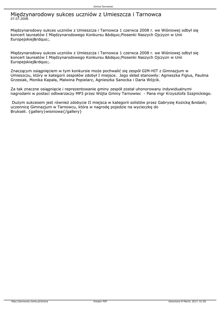 Międzynarodowy sukces uczniów z Umieszcza i Tarnowca 1 czerwca 2008 r. we Wiśniowej odbył się