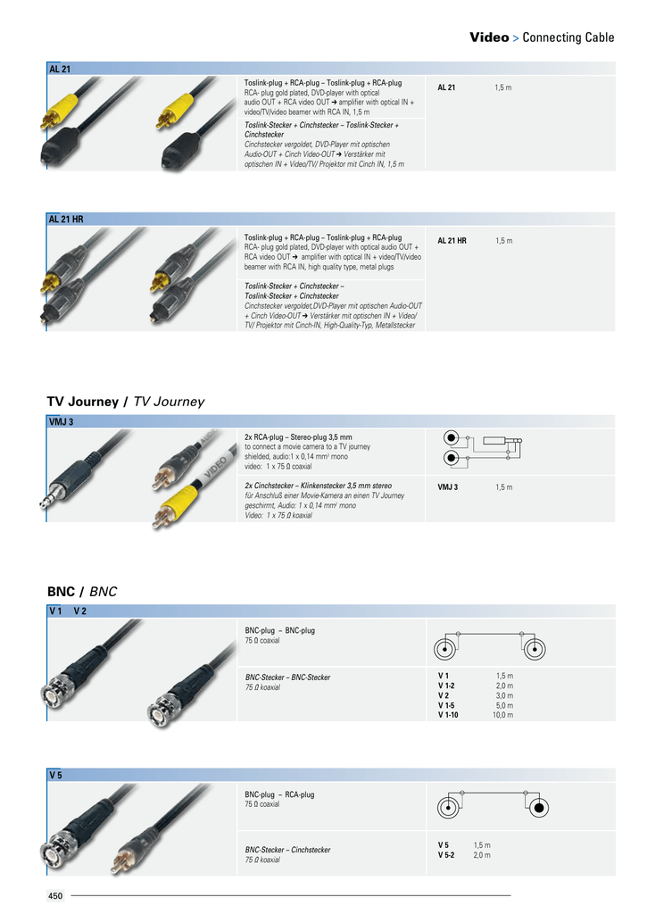 Video > Connecting Cable AL 21 Toslink-plug + RCA-plug – Toslink-plug + RCA-plug RCA- plug gold plated, DVD-player with optical audio OUT + RCA video OUT ➔ amplifier with optical IN + video/TV/video beamer with RCA IN, 1,5 m AL 21 1,5 m AL 21 HR 1,5 m VMJ 3 1,5 m V 1 V 1-2 V 2 V 1-5 V 1-10 1,5 m 2,0 m 3,0 m 5,0 m 10,0 m Toslink-Stecker + Cinchstecker – Toslink-Stecker + Cinchstecker Cinchstecker vergoldet, DVD-Player mit optischen Audio-OUT + Cinch Video-OUT ➔ Verstärker mit optischen IN + Video/TV/ Projektor mit Cinch IN, 1,5 m AL 21 HR Toslink-plug + RCA-plug – Toslink-plug + RCA-plug RCA- plug gold plated, DVD-player with optical audio OUT + RCA video OUT ➔ amplifier with optical IN + video/TV/video beamer with RCA IN, high quality type, metal plugs Toslink-Stecker + Cinchstecker – Toslink-Stecker + Cinchstecker Cinchstecker vergoldet,DVD-Player mit optischen Audio-OUT + Cinch Video-OUT ➔ Verstärker mit optischen IN + Video/ TV/ Projektor mit Cinch-IN, High-Quality-Typ, Metallstecker TV Journey / TV Journey VMJ 3 2x RCA-plug – Stereo-plug 3,5 mm to connect a movie camera to a TV journey shielded, audio:1 x 0,14 mm2 mono video: 1 x 75 Ω coaxial 2x Cinchstecker – Klinkenstecker 3,5 mm stereo für Anschluß einer Movie-Kamera an einen TV Journey geschirmt, Audio: 1 x 0,14 mm2 mono Video: 1 x 75 Ω koaxial BNC / BNC V1 V 2 BNC-plug – BNC-plug 75 Ω coaxial BNC-Stecker – BNC-Stecker 75 Ω koaxial V 5 BNC-plug – RCA-plug 75 Ω coaxial BNC-Stecker – Cinchstecker 75 Ω koaxial 450 V 5 V 5-2 1,5 m 2,0 m
