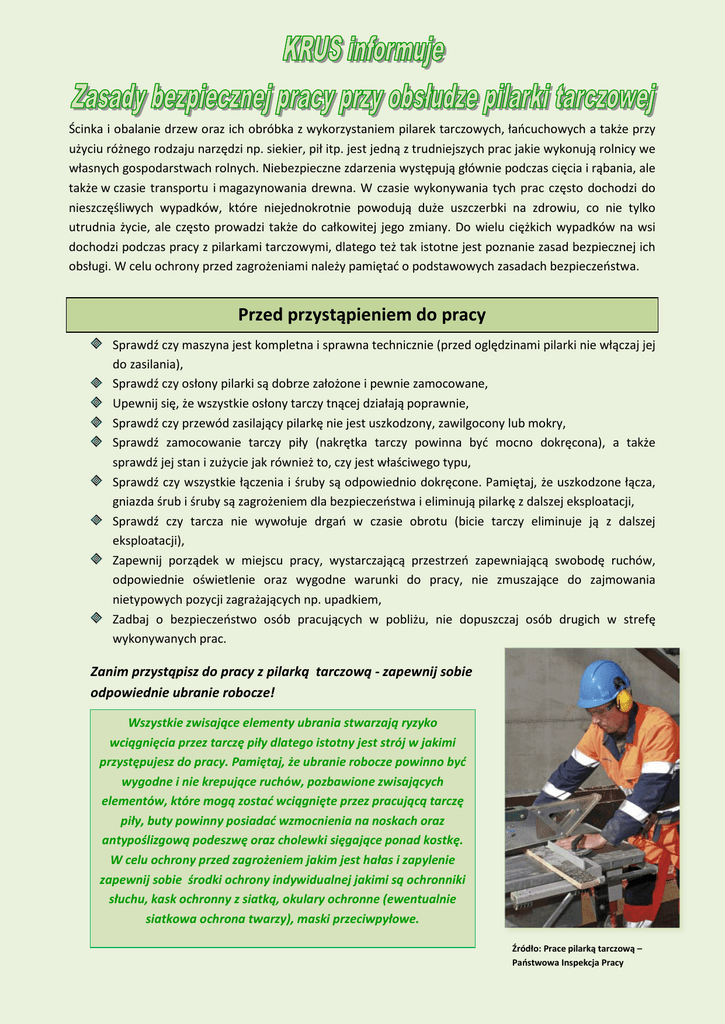 Ścinka i obalanie drzew oraz ich obróbka z wykorzystaniem pilarek tarczowych, łańcuchowych a także przy użyciu różnego rodzaju narzędzi np. siekier, pił itp. jest jedną z trudniejszych prac jakie wykonują rolnicy we własnych gospodarstwach rolnych. Niebezpieczne zdarzenia występują głównie podczas cięcia i rąbania, ale także w czasie transportu i magazynowania drewna. W czasie wykonywania tych prac często dochodzi do nieszczęśliwych wypadków, które niejednokrotnie powodują duże uszczerbki na zdrowiu, co nie tylko utrudnia życie, ale często prowadzi także do całkowitej jego zmiany. Do wielu ciężkich wypadków na wsi dochodzi podczas pracy z pilarkami tarczowymi, dlatego też tak istotne jest poznanie zasad bezpiecznej ich obsługi. W celu ochrony przed zagrożeniami należy pamiętać o podstawowych zasadach bezpieczeństwa. Przed przystąpieniem do pracy Sprawdź czy maszyna jest kompletna i sprawna technicznie (przed oględzinami pilarki nie włączaj jej do zasilania), Sprawdź czy osłony pilarki są dobrze założone i pewnie zamocowane, Upewnij się, że wszystkie osłony tarczy tnącej działają poprawnie, Sprawdź czy przewód zasilający pilarkę nie jest uszkodzony, zawilgocony lub mokry, Sprawdź zamocowanie tarczy piły (nakrętka tarczy powinna być mocno dokręcona), a także sprawdź jej stan i zużycie jak również to, czy jest właściwego typu, Sprawdź czy wszystkie łączenia i śruby są odpowiednio dokręcone. Pamiętaj, że uszkodzone łącza, gniazda śrub i śruby są zagrożeniem dla bezpieczeństwa i eliminują pilarkę z dalszej eksploatacji, Sprawdź czy tarcza nie wywołuje drgań w czasie obrotu (bicie tarczy eliminuje ją z dalszej eksploatacji), Zapewnij porządek w miejscu pracy, wystarczającą przestrzeń zapewniającą swobodę ruchów, odpowiednie oświetlenie oraz wygodne warunki do pracy, nie zmuszające do zajmowania nietypowych pozycji zagrażających np. upadkiem, Zadbaj o bezpieczeństwo osób pracujących w pobliżu, nie dopuszczaj osób drugich w strefę wykonywanych prac. Zanim przystąpisz do pracy z pilarką tarczową - zapewnij sobie odpowiednie ubranie robocze! Wszystkie zwisające elementy ubrania stwarzają ryzyko wciągnięcia przez tarczę piły dlatego istotny jest strój w jakimi przystępujesz do pracy. Pamiętaj, że ubranie robocze powinno być wygodne i nie krepujące ruchów, pozbawione zwisających elementów, które mogą zostać wciągnięte przez pracującą tarczę piły, buty powinny posiadać wzmocnienia na noskach oraz antypoślizgową podeszwę oraz cholewki sięgające ponad kostkę. W celu ochrony przed zagrożeniem jakim jest hałas i zapylenie zapewnij sobie środki ochrony indywidualnej jakimi są ochronniki słuchu, kask ochronny z siatką, okulary ochronne (ewentualnie siatkowa ochrona twarzy), maski przeciwpyłowe. Źródło: Prace pilarką tarczową – Państwowa Inspekcja Pracy Czynności w trakcie pracy Podczas eksploatacji nie wyłączaj zabezpieczeń i nie wykonuj ich obejść, Nie wystawiaj pilarki na działanie deszczu lub wody, Nie stosuj nadmiernej siły docisku pilarki w trakcie piłowania, W razie zakleszczenia się piły tarczowej natychmiast zwolnij wyłącznik, Nigdy nie powoduj zatrzymania tarczy w sztuczny sposób np. o materiał czy podłoże, Nie przeciążaj pilarki, gdy korpus jest gorący zrób przerwę w pracy, Pilarka musi być zawsze uruchomiona zanim tarcza dotknie piłowanego materiału, Koncentruj się na swojej pracy, w przypadku kiedy coś cię dekoncentruje lub jesteś zmęczony przerwij pracę, Przy cięciu małych elementów, a także w końcowej fazie cięcia wzdłużnego, materiał może być przesuwany tylko i wyłącznie za pomocą popychaczy (bezpieczny popychacz powinien mieć długość minimum 40 cm i być wykonany z drewna, sklejki lub tworzywa sztucznego), W momencie cięcia, palce lewej dłoni powinny być ułożone równolegle do tarczy piły, Czynności po zakończeniu pracy Wyłącz maszynę i zabezpiecz ją przed uruchomieniem przez nieupoważnione osoby, Uprzątnij miejsce pracy, Dokonaj wizualnych oględzin stanu technicznego maszyny, w przypadku stwierdzenia uszkodzeń lub innych zagrożeń związanych z bezpieczeństwem eksploatacji, przed ich usunięciem nie przystępuj do pracy, Zapewnij pilarce właściwe warunki przechowywania, chroniące przed zabrudzeniem, uszkodzeniem czy zawilgoceniem. Pamiętaj, że wszelkie prace nastawcze i wymianę narzędzi należy wykonywać tylko i wyłącznie przy wyłączonej maszynie! Kupując pilarkę zwróć uwagę na to czy sprzęt posiada: Dwie osłony tarczy piły (nad i pod stołem) – chroniące przed dotknięciem do tarczy piły oraz innych części ruchomych. Osłona górna i dolna powinny mieć zamocowanie umożliwiające regulację ich położenia, w zależności od wielkości tarczy piły i grubości przecinanego materiału, Osłony napędu (pasków klinowych lub pasa płaskiego, kół pasowych), Klin rozszczepiający za tarczą piły, chroniący przed zakleszczeniem piły i odrzutem przecinanego materiału, Wyłącznik napędu znajdujący się w zasięgu ręki. klin rozszczepiający osłona górna piły (kaptur) osłona piły pod stołem wyłącznik W 2015 roku Kasa Rolniczego Ubezpieczenia Społecznego w województwie podlaskim, odnotowała 156 wypadków spowodowanych pochwyceniem lub uderzeniem przez części ruchome maszyn i urządzeń, co stanowi 11,2% wszystkich odnotowanych wypadków. Ponad połowę wypadków w tej grupie, stanowiły wypadki związane z obsługą pilarek tarczowych i innych maszyn stolarskich! Wypadki te najczęściej spowodowane były niewłaściwym zachowaniem się rolnika oraz brakiem lub niewłaściwymi osłonami i zabezpieczeniami. Agnieszka Chacińska-Dąbrowska Inspektor OR KRUS w Białymstoku
