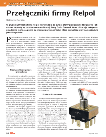 56 prze≥πczniki düwigniowe i obrotowe Prze³¹czniki firmy Relpol Waldemar Gemiñski W grudniu 2003 roku firma Relpol wprowadzi≥a do swojej oferty prze≥πczniki düwigniowe i obrotowe. Aparaty sπ produkowane na licencji firmy Carlo Gavazzi. Wraz z licencjπ zakupiono urzπdzenia technologiczne do montaøu prze≥πcznikÛw, ktÛre pozwalajπ utrzymaÊ poøπdanπ jakoúÊ wyrobÛw. rze≥πczniki przeznaczone sπ do zastosowania w uk≥adach profesjonalnych, m.in. w urzπdzeniach i instalacjach przemys≥owych, elektronicznych i telekomunikacyjnych, w urzπdzeniach pomiarowych, medycznych, transportowych oraz w maszynach. Ze wzglÍdu na sposÛb prze≥πczania dzieli siÍ je na kilka grup: ï düwigniowe (ze wzglÍdu na kszta≥t i ruch düwigni mogπ to byÊ prze≥πczniki z düwigniπ przechylnπ, z düwigniπ ≥opatkowπ oraz z düwigniπ ko≥yskowπ), ï przyciskowe, ï obrotowe. P Prze≥πczniki düwigniowe i przyciskowe Te prze≥πczniki sπ najczÍúciej montowane na czo≥owych panelach urzπdzeÒ. Funkcje i inne w≥aúciwoúci prze≥πcznikÛw sπ tak dobrane, aby spe≥nia≥y rÛøne wymagania zwiπzane z elementami rozmieszczanymi na panelu. W zaleønoúci od typu prze≥πcznikÛw, ich zdolnoúÊ do ≥πczenia prπdÛw maksymalnych przy napiÍciach znamionowych zawiera siÍ w przedziale od 20 mA do 20 A. W zaleønoúci od wartoúci ≥πczonych prπdÛw naleøy dobieraÊ prze≥πczniki ze stykami z odpowiednich materia≥Ûw (srebra, stopu srebra, miedzi pokrytej srebrem lub z≥otem, mosiπdzu pokrytego z≥otem). Miedziane lub mosiÍøne wyprowadzenia stykÛw (koÒcÛwki do przy≥πczania obwodÛw zewnÍtrznych) sπ pokryte srebrem lub z≥otem. Zapewnia to ich dobrπ lutownoúÊ (w przypadku montaøu na p≥ytkach obwodÛw drukowanych lub przylutowywania przewodÛw) oraz dobre po≥πczenie elektryczne w przypadku zastosowania wersji z zaciskami úrubowymi i po≥πczeniami konektorowymi stanowiπcymi zakoÒczenie wyprowadzeÒ stykÛw prze≥πcznikÛw. 56 Prze≥πczniki sπ produkowane jako dwui trÛjpozycyjne, w odmianach jedno-, dwu-, trÛj- i czteropolowej. Sπ montowane w urzπdzeniach przy uøyciu nakrÍtek mocujπcych lub przylutowywane do p≥ytek drukowanych (niekiedy z zastosowaniem usztywniajπcych wspornikÛw). Trwa≥oúÊ elektryczna prze≥πcznikÛw przy ich maksymalnym obciπøeniu wynosi od 20 tysiÍcy do 60 tysiÍcy cykli, a trwa≥oúÊ mechaniczna ñ od 40 tysiÍcy do 100 tysiÍcy cykli, w zaleønoúci od typu prze≥πcznika. W grupie prze≥πcznikÛw düwigniowych i przyciskowych sπ dostÍpne miniaturowe prze≥πczniki jedno- i dwupolowe düwigniowe (T) oraz przyciskowe (TP i MP), a takøe jedno-, dwu-, trÛj- i czteropolowe düwigniowe (M). Przy≥πczanie do obwodÛw elektrycznych jest realizowane przez przylutowanie przewodÛw lub przez bezpoúrednie przylutowanie do p≥ytek obwodÛw drukowanych. Oddzielnπ podgrupÍ stanowiπ standardowe prze≥πczniki mocy jedno-, dwu- i trÛjpolowe düwigniowe (S). Prze≥πczniki te posiadajπ certyfikaty: UR i CSA. wspÛ≥pracujπ ze sobπ úlizgowo. WspÛ≥praca stykÛw úlizgowych w prze≥πcznikach obrotowych zosta≥a tak zaprojektowana, aby zapewnia≥y one podwÛjne zamkniÍcie obwodu (takøe przerwanie), realizowane przez styki ruchome. Pierúcieniowy kszta≥t stykÛw ruchomych gwarantuje ich duøπ trwa≥oúÊ i pewny zestyk. RÛøne konfiguracje stykÛw sπ zwiπzane z ich funkcjami. Konfiguracja CC powoduje, øe styk ruchomy (zaleønie od doboru kπta) zapewnia wyprzedzajπce za≥πczenie kolejnego obwodu zanim nastπpi roz≥πczenie poprzedniego obwodu. Konfiguracja NC powoduje, iø kolejny obwÛd jest zamykany po wczeúniejszym otwarciu poprzedniego obwodu. Styki sπ wykonane ze srebra, srebra z pow≥okami z≥otymi, mosiπdzu pokrytego niklem i z≥otem, brπzu pokrytego niklem i z≥otem lub miedzi pokrytej niklem i z≥otem. Sπ stosowane dwa rodzaje pow≥ok z≥otych: ï ochronne gruboúci 0,2-0,3 µm, stanowiπce zabezpieczenie stykÛw przed korozjπ Prze≥πczniki obrotowe Prze≥πczniki obrotowe sπ przeznaczone przede wszystkim do rÛønego typu uk≥adÛw profesjonalnych oraz innych uk≥adÛw elektronicznych, w ktÛrych sπ za≥πczane obciπøenia sygna≥owe. W zaleønoúci od typu prze≥πcznika maksymalne prπdy ≥πczeniowe wynoszπ 0,1-1,0 A, maksymalna moc ≥πczeniowa - 3-110 VA, maksymalne napiÍcie ñ 120-230 V AC oraz 125 V DC. Trwa≥oúÊ elektryczna tych wy≥πcznikÛw wynosi 20 tysiÍcy prze≥πczeÒ, a mechaniczna ñ 50 tysiÍcy prze≥πczeÒ. Styki sta≥e sπ zamocowane na nieruchomych elementach noúnych prze≥πcznikÛw, elementy obrotowe prze≥πcznikÛw sπ zaú noúnikami stykÛw ruchomych. Same styki Prze≥πcznik düwigniowy styczeÒ 2004 prze≥πczniki düwigniowe i obrotowe M A L K E R powierzchniowπ (zabezpieczenie prze≥πcznikÛw magazynowanych), ï gruboúci kilku mikrometrÛw, nanoszone na styki pracujπce z duøπ czÍstotliwoúciπ przy niskich obciπøeniach. W tej grupie naleøy wyrÛøniÊ prze≥πczniki miniaturowe z trzonkami do za≥oøenia pokrÍt≥a (seria 5920 i 5940) oraz bez trzonka (seria 5940-N), do zmiany pozycji wkrÍtakiem. W zaleønoúci od typu i wersji prze≥πcznika liczba sekcji (integralny element wyposaøony w styki sta≥e i ruchome) wynosi od 1 do 3. W zaleønoúci od wersji prze≥πcznik moøe mieÊ w jednej sekcji od 1 do 6 pÛl i od 12 do 2 pozycji. Prze≥πczniki sπ przystosowane do montaøu w obwodach p≥ytek drukowanych. Innπ grupÍ stanowiπ, wiÍksze od prze≥πcznikÛw miniaturowych, profesjonalne prze≥πczniki obrotowe. Wszystkie majπ trzpieÒ do zamocowania pokrÍt≥a. Sπ przystosowane do montaøu w p≥ytkach drukowanych (typ 5922-C i 5950-C) oraz do montaøu na panelach urzπdzeÒ przy uøyciu nakrÍtek mocujπcych (typ 5922 i 5950). Prze≥πczniki typu 5922 i 5950 mogπ mieÊ od jednej do szeúciu sekcji, a kaøda sekcja ñ od jednego do szeúciu pÛl 