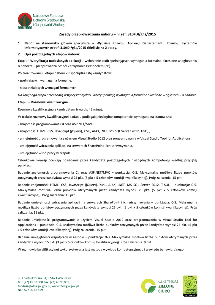 Zasady przeprowadzenia naboru – nr ref. 310/DI/gł.s/2015 1. Nabór na stanowisko główny specjalista w Wydziale Rozwoju Aplikacji Departamentu Rozwoju Systemów Informatycznych nr ref. 310/DI/gł.s/2015 dzieli się na 2 etapy. 2. Opis poszczególnych etapów naboru: Etap I – Weryfikacja nadesłanych aplikacji – wyłonienie osób spełniających wymagania formalne określone w ogłoszeniu o naborze – przeprowadza Zespół Zarządzania Personelem (ZP). Po zrealizowaniu I etapu naboru ZP sporządza listę kandydatów: - spełniających wymagania formalne, - niespełniających wymagań formalnych. Do kolejnego etapu przechodzą wszyscy kandydaci, którzy spełniają wymagania formalne określone w ogłoszeniu o naborze. Etap II – Rozmowa kwalifikacyjna Rozmowa kwalifikacyjna z kandydatem trwa ok. 45 minut. W trakcie rozmowy kwalifikacyjnej badaniu podlegają niezbędne kompetencje wymagane na stanowisku: - znajomość programowania C# oraz ASP.NET/MVC, - znajomość: HTML, CSS, JavaScript (jQuery), XML, AJAX, .NET, MS SQL Server 2012, T-SQL, - umiejętność programowania z użyciem Visual Studio 2012 oraz programowania w Visual Studio Tool for Applications, - umiejętność wdrażania aplikacji na serwerach SharePoint i ich utrzymywania, - umiejętność współpracy w zespole. Członkowie komisji oceniają posiadanie przez kandydata poszczególnych niezbędnych kompetencji według przyjętej punktacji. Badanie znajomości: programowania C# oraz ASP.NET/MVC – punktacja: 0-5. Maksymalna możliwa liczba punktów otrzymanych przez kandydata wynosi 25 pkt. (5 pkt x 5 członków komisji kwalifikacyjnej). Próg zaliczenia: 15 pkt. Badanie znajomości: HTML, CSS, JavaScript (jQuery), XML, AJAX, .NET, MS SQL Server 2012, T-SQL – punktacja: 0-5. Maksymalna możliwa liczba punktów otrzymanych przez kandydata wynosi 25 pkt. (5 pkt x 5 członków komisji kwalifikacyjnej). Próg zaliczenia: 15 pkt. Badanie umiejętności wdrażania aplikacji na serwerach SharePoint i ich utrzymywania – punktacja: 0-5. Maksymalna możliwa liczba punktów otrzymanych przez kandydata wynosi 25 pkt. (5 pkt x 5 członków komisji kwalifikacyjnej). Próg zaliczenia: 15 pkt. Badanie umiejętności programowania z użyciem Visual Studio 2012 oraz programowania w Visual Studio Tool for Applications – punktacja: 0-5. Maksymalna możliwa liczba punktów otrzymanych przez kandydata wynosi 25 pkt. (5 pkt x 5 członków komisji kwalifikacyjnej). Próg zaliczenia: 15 pkt. Badanie umiejętności współpracy w zespole – punktacja: 0-3. Maksymalna możliwa liczba punktów otrzymanych przez kandydata wynosi 15 pkt. (3 pkt x 5 członków komisji kwalifikacyjnej). Próg zaliczenia: 9 pkt. W rozmowie kwalifikacyjnej wykorzystywana jest metoda wywiadu kompetencyjnego i wywiadu behawioralnego. ul. Konstruktorska 3A, 02-673 Warszawa tel.: (22) 45 90 000, fax: (22) 45 90 001, [email protected], www.nfosigw.gov.pl NIP: 522 00 18 559 Na podstawie dokumentów złożonych w aplikacji przez kandydata weryfikowane są wymagania dodatkowe według przyjętej punktacji (wymóg potwierdzony – 1 pkt., wymóg niepotwierdzony – 0 pkt.): • • • • przeszkolenie w zakresie znajomości aplikacji Microsoft SharePoint Designer, przeszkolenie w zakresie znajomości aplikacji Microsoft InfoPath, przeszkolenie w zakresie Developing Microsoft SharePoint Server 2013, przeszkolenie w zakresie Configuring and Managing Microsoft SharePoint. W ramach wymagań dodatkowych kandydat może uzyskać łącznie maksymalnie 4 pkt. Liczba punktów uzyskanych w ramach wymagań dodatkowych dodawana jest do punktów uzyskanych przez kandydata w ramach rozmowy kwalifikacyjnej. ul. Konstruktorska 3A, 02-673 Warszawa tel.: (22) 45 90 000, fax: (22) 45 90 001, [email protected], www.nfosigw.gov.pl NIP: 522 00 18 559