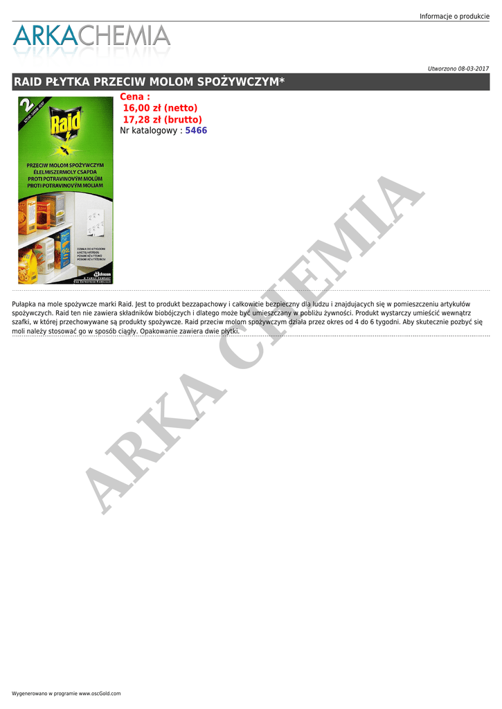 Informacje o produkcie Utworzono 08-03-2017 RAID PŁYTKA PRZECIW MOLOM SPOŻYWCZYM* Cena : 16,00 zł (netto) 17,28 zł (brutto) H EM IA Nr katalogowy : 5466 AR K A C Pułapka na mole spożywcze marki Raid. Jest to produkt bezzapachowy i całkowicie bezpieczny dla ludzu i znajdujacych się w pomieszczeniu artykułów spożywczych. Raid ten nie zawiera składników biobójczych i dlatego może być umieszczany w pobliżu żywności. Produkt wystarczy umieścić wewnątrz szafki, w której przechowywane są produkty spożywcze. Raid przeciw molom spożywczym działa przez okres od 4 do 6 tygodni. Aby skutecznie pozbyć się moli należy stosować go w sposób ciągły. Opakowanie zawiera dwie płytki. Wygenerowano w programie www.oscGold.com