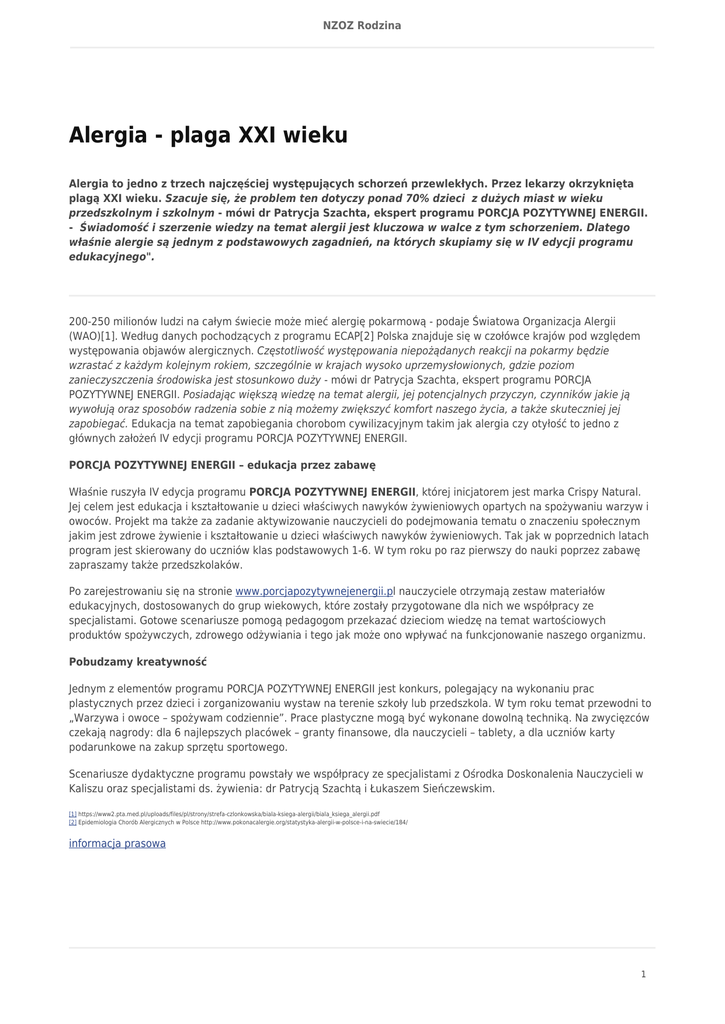 NZOZ Rodzina Alergia - plaga XXI wieku Alergia to jedno z trzech najczęściej występujących schorzeń przewlekłych. Przez lekarzy okrzyknięta plagą XXI wieku. Szacuje się, że problem ten dotyczy ponad 70% dzieci z dużych miast w wieku przedszkolnym i szkolnym - mówi dr Patrycja Szachta, ekspert programu PORCJA POZYTYWNEJ ENERGII. - Świadomość i szerzenie wiedzy na temat alergii jest kluczowa w walce z tym schorzeniem. Dlatego właśnie alergie są jednym z podstawowych zagadnień, na których skupiamy się w IV edycji programu edukacyjnego". 200-250 milionów ludzi na całym świecie może mieć alergię pokarmową - podaje Światowa Organizacja Alergii (WAO)[1]. Według danych pochodzących z programu ECAP[2] Polska znajduje się w czołówce krajów pod względem występowania objawów alergicznych. Częstotliwość występowania niepożądanych reakcji na pokarmy będzie wzrastać z każdym kolejnym rokiem, szczególnie w krajach wysoko uprzemysłowionych, gdzie poziom zanieczyszczenia środowiska jest stosunkowo duży - mówi dr Patrycja Szachta, ekspert programu PORCJA POZYTYWNEJ ENERGII. Posiadając większą wiedzę na temat alergii, jej potencjalnych przyczyn, czynników jakie ją wywołują oraz sposobów radzenia sobie z nią możemy zwiększyć komfort naszego życia, a także skuteczniej jej zapobiegać. Edukacja na temat zapobiegania chorobom cywilizacyjnym takim jak alergia czy otyłość to jedno z głównych założeń IV edycji programu PORCJA POZYTYWNEJ ENERGII. PORCJA POZYTYWNEJ ENERGII – edukacja przez zabawę Właśnie ruszyła IV edycja programu PORCJA POZYTYWNEJ ENERGII, której inicjatorem jest marka Crispy Natural. Jej celem jest edukacja i kształtowanie u dzieci właściwych nawyków żywieniowych opartych na spożywaniu warzyw i owoców. Projekt ma także za zadanie aktywizowanie nauczycieli do podejmowania tematu o znaczeniu społecznym jakim jest zdrowe żywienie i kształtowanie u dzieci właściwych nawyków żywieniowych. Tak jak w poprzednich latach program jest skierowany do uczniów klas podstawowych 1-6. W tym roku po raz pierwszy do nauki poprzez zabawę zapraszamy także przedszkolaków. Po zarejestrowaniu się na stronie www.porcjapozytywnejenergii.pl nauczyciele otrzymają zestaw materiałów edukacyjnych, dostosowanych do grup wiekowych, które zostały przygotowane dla nich we współpracy ze specjalistami. Gotowe scenariusze pomogą pedagogom przekazać dzieciom wiedzę na temat wartościowych produktów spożywczych, zdrowego odżywiania i tego jak może ono wpływać na funkcjonowanie naszego organizmu. Pobudzamy kreatywność Jednym z elementów programu PORCJA POZYTYWNEJ ENERGII jest konkurs, polegający na wykonaniu prac plastycznych przez dzieci i zorganizowaniu wystaw na terenie szkoły lub przedszkola. W tym roku temat przewodni to „Warzywa i owoce – spożywam codziennie”. Prace plastyczne mogą być wykonane dowolną techniką. Na zwycięzców czekają nagrody: dla 6 najlepszych placówek – granty finansowe, dla nauczycieli – tablety, a dla uczniów karty podarunkowe na zakup sprzętu sportowego. Scenariusze dydaktyczne programu powstały we współpracy ze specjalistami z Ośrodka Doskonalenia Nauczycieli w Kaliszu oraz specjalistami ds. żywienia: dr Patrycją Szachtą i Łukaszem Sieńczewskim. [1] https://www2.pta.med.pl/uploads/files/pl/strony/strefa-czlonkowska/biala-ksiega-alergii/biala_ksiega_alergii.pdf [2] Epidemiologia Chorób Alergicznych w Polsce http://www.pokonacalergie.org/statystyka-alergii-w-polsce-i-na-swiecie/184/ informacja prasowa 1