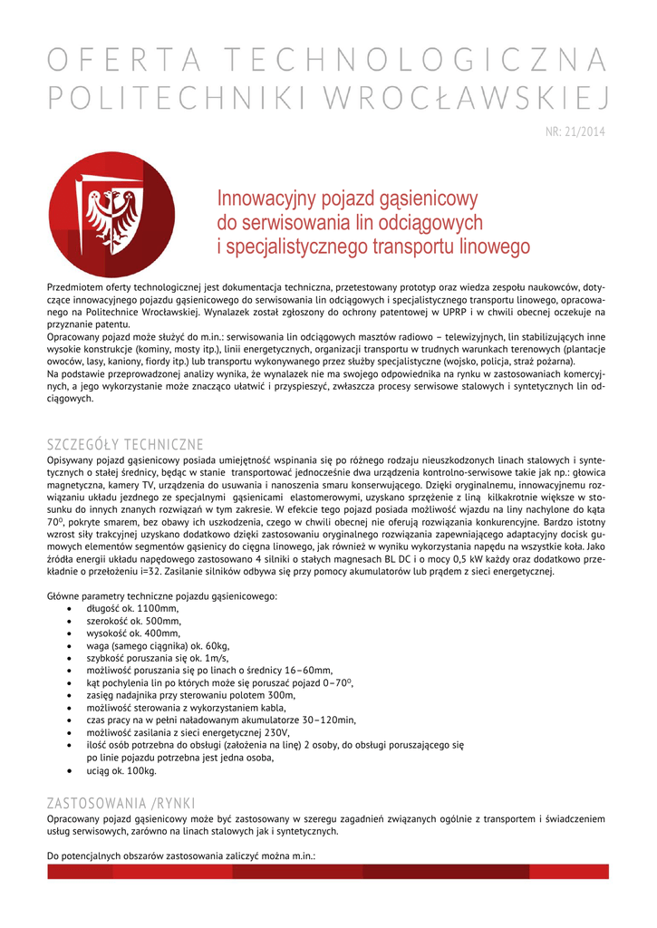 NR: 21/2014 Innowacyjny pojazd gąsienicowy do serwisowania lin odciągowych i specjalistycznego transportu linowego Przedmiotem oferty technologicznej jest dokumentacja techniczna, przetestowany prototyp oraz wiedza zespołu naukowców, dotyczące innowacyjnego pojazdu gąsienicowego do serwisowania lin odciągowych i specjalistycznego transportu linowego, opracowanego na Politechnice Wrocławskiej. Wynalazek został zgłoszony do ochrony patentowej w UPRP i w chwili obecnej oczekuje na przyznanie patentu. Opracowany pojazd może służyć do m.in.: serwisowania lin odciągowych masztów radiowo – telewizyjnych, lin stabilizujących inne wysokie konstrukcje (kominy, mosty itp.), linii energetycznych, organizacji transportu w trudnych warunkach terenowych (plantacje owoców, lasy, kaniony, fiordy itp.) lub transportu wykonywanego przez służby specjalistyczne (wojsko, policja, straż pożarna). Na podstawie przeprowadzonej analizy wynika, że wynalazek nie ma swojego odpowiednika na rynku w zastosowaniach komercyjnych, a jego wykorzystanie może znacząco ułatwić i przyspieszyć, zwłaszcza procesy serwisowe stalowych i syntetycznych lin odciągowych. SZCZEGÓŁY TECHNICZNE Opisywany pojazd gąsienicowy posiada umiejętność wspinania się po różnego rodzaju nieuszkodzonych linach stalowych i syntetycznych o stałej średnicy, będąc w stanie transportować jednocześnie dwa urządzenia kontrolno-serwisowe takie jak np.: głowica magnetyczna, kamery TV, urządzenia do usuwania i nanoszenia smaru konserwującego. Dzięki oryginalnemu, innowacyjnemu rozwiązaniu układu jezdnego ze specjalnymi gąsienicami elastomerowymi, uzyskano sprzężenie z liną kilkakrotnie większe w stosunku do innych znanych rozwiązań w tym zakresie. W efekcie tego pojazd posiada możliwość wjazdu na liny nachylone do kąta 70O, pokryte smarem, bez obawy ich uszkodzenia, czego w chwili obecnej nie oferują rozwiązania konkurencyjne. Bardzo istotny wzrost siły trakcyjnej uzyskano dodatkowo dzięki zastosowaniu oryginalnego rozwiązania zapewniającego adaptacyjny docisk gumowych elementów segmentów gąsienicy do cięgna linowego, jak również w wyniku wykorzystania napędu na wszystkie koła. Jako źródła energii układu napędowego zastosowano 4 silniki o stałych magnesach BL DC i o mocy 0,5 kW każdy oraz dodatkowo przekładnie o przełożeniu i=32. Zasilanie silników odbywa się przy pomocy akumulatorów lub prądem z sieci energetycznej. Główne parametry techniczne pojazdu gąsienicowego: długość ok. 1100mm, szerokość ok. 500mm, wysokość ok. 400mm, waga (samego ciągnika) ok. 60kg, szybkość poruszania się ok. 1m/s, możliwość poruszania się po linach o średnicy 16–60mm, kąt pochylenia lin po których może się poruszać pojazd 0–70O, zasięg nadajnika przy sterowaniu polotem 300m, możliwość sterowania z wykorzystaniem kabla, czas pracy na w pełni naładowanym akumulatorze 30–120min, możliwość zasilania z sieci energetycznej 230V, ilość osób potrzebna do obsługi (założenia na linę) 2 osoby, do obsługi poruszającego się po linie pojazdu potrzebna jest jedna osoba, uciąg ok. 100kg. ZASTOSOWANIA /RYNKI Opracowany pojazd gąsienicowy może być zastosowany w szeregu zagadnień związanych ogólnie z transportem i świadczeniem usług serwisowych, zarówno na linach stalowych jak i syntetycznych. Do potencjalnych obszarów zastosowania zaliczyć można m.in.: serwisowanie lin odciągowych masztów telekomunikacyjnych, serwisowanie lin odciągowych innych wysokich obiektów np. kominów, serwisowanie lin odciągowych mostów, serwisowanie linii energetycznych, serwisowanie innych lin stalowych i syntetycznych stosowanych m.in. w górnictwie skalnym, przemyśle stoczniowym, kolejach linowych, realizację zadań specjalistycznego transportu linowego w trudnych warunkach terenowych np. na plantacjach owoców, lasach, kanionach, fiordach, realizację zadań transportu linowego przez służby specjalistyczne (wojsko, policja, straż pożarna). INNOWACYJNOŚĆ Główny element innowacyjności wynalazku polega na możliwości stosowania pojazdu, który sam (sterowany zdalnie przez operatora) porusza się po cięgach linowych o różnej grubości, pochylonych pod różnym kątem i wykonanych z różnego materiału, celem wykonywania różnych prac. Zasadnicze przewagi konkurencyjne można określić następująco: Znaczące usprawnienie procesu serwisowania lin odciągowych w porównaniu do obecnie stosowanych metod. Nie ma potrzeby wchodzenia na konstrukcję celem montażu systemu wciągania urządzeń serwisowych. Pojazd jest montowany na dole, bezpośrednio na linie. Pojazd jest autonomiczny tzn. sterowany zdalnie przez operatora, który bezpośrednio nie uczestniczy w wykonywanej pracy. Dzięki temu zwiększa się komfort pracy i bezpieczeństwo personelu serwisowego. Pojazd może uczestniczyć w zadaniach, gdzie życie i zdrowie personelu serwisowego mogłoby być narażone na uszczerbek (wysokie budowle, linie energetyczne, trudne warunki terenowe). Modułowość pojazdu, która pozwala podczepić do niego różne urządzenia, które w danej chwili mogą być niezbędne do wykonywania np. prac serwisowych lub transportowych (głowice magnetyczne, głowice smarujące, kamery inspekcyjne, wózki transportowe itp.). Ułatwienie lub wręcz umożliwienie transportu w trudnych warunkach terenowych. STATUS IP FORMA KOMERCJALIZACJI POZIOM GOTOWOŚCI WDROŻENIOWEJ ☒ Zgłoszenie patentowe ☒ Sprzedaż patentu ☐ Koncepcja i model teoretyczny ☐ Patent ☒ Umowa wdrożeniowa ☐ Eksperymentalna walidacja koncepcji ☒ Know-how ☒ Udzielenie licencji ☐ Wstępna technologia / demonstrator ☐ Inne ☒ Spin off ☐ Testy w warunkach laboratoryjnych ☒ Inna umowa ☒ Testy w warunkach rzeczywistych ☒ Finalna technologia / prototyp ☐ Technologia zweryfikowana w warunkach operacyjnych Mgr inż. Marcin Haremza Specjalista ds. Komercjalizacji i Transferu Technol