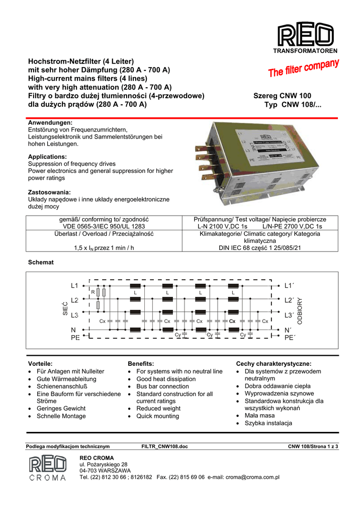 TRANSFORMATOREN Hochstrom-Netzfilter (4 Leiter) mit sehr hoher Dämpfung (280 A - 700 A) High-current mains filters (4 lines) with very high attenuation (280 A - 700 A) Filtry o bardzo dużej tłumienności (4-przewodowe) dla dużych prądów (280 A - 700 A) Szereg CNW 100 Typ CNW 108/... Anwendungen: Entstörung von Frequenzumrichtern, Leistungselektronik und Sammelentstörungen bei hohen Leistungen. Applications: Suppression of frequency drives Power electronics and general suppression for higher power ratings Zastosowania: Układy napędowe i inne układy energoelektroniczne dużej mocy gemäß/ conforming to/ zgodność VDE 0565-3/IEC 950/UL 1283 Überlast / Overload / Przeciążalność Prüfspannung/ Test voltage/ Napięcie probiercze L-N 2100 V,DC 1s L/N-PE 2700 V,DC 1s Klimakategorie/ Climatic category/ Kategoria klimatyczna DIN IEC 68 część 1 25/085/21 1,5 x IN przez 1 min / h Schemat L1´ L1 L L L L L2´ L2 L3 Cx N PE Vorteile: • Für Anlagen mit Nulleiter • Gute Wärmeableitung • Schienenanschluß • Eine Bauform für verschiedene Ströme • Geringes Gewicht • Schnelle Montage Podlega modyfikacjom technicznym Cx Cx Cy Cx Cy Cy Benefits: • For systems with no neutral line • Good heat dissipation • Bus bar connection • Standard construction for all current ratings • Reduced weight • Quick mounting Cx Cy L3´ ODBIORY SIEĆ R N´ PE´ Cechy charakterystyczne: • Dla systemów z przewodem neutralnym • Dobra oddawanie ciepła • Wyprowadzenia szynowe • Standardowa konstrukcja dla wszystkich wykonań • Mała masa • Szybka instalacja FILTR_CNW108.doc REO CROMA ul. Pożaryskiego 28 04-703 WARSZAWA Tel. (22) 812 30 66 ; 8126182 Fax. (22) 815 69 06 e-mail: [email protected] CNW 108/Strona 1 z 3 TRANSFORMATOREN Technische Daten • Technical data • Dane techniczne Type CNW 108/280 CNW 108/500 CNW 108/700 Nennspannung Rated voltage Napięcie znamionowe [V] 3 x 440 3 x 440 3 x 440 Frequenz: 50/60 Hz Nennstrom Rated current Prąd znamionowy [A] 3 x 280 3 x 500 3 x 700 Ableitstrom Leakage current Prąd upływu [mA] ΣCx <100 <100 <100 Frequency: 50/60 Hz ΣCy R [µF] [µF] [kΩ] 19,8 19,8 19,8 13,2 13,2 13,2 100 100 100 Częstotliwość: 50/60 Hz Mit dem Filter CNW 108 kann bei EMV gerechter Montage eine Sammelentstörung von einer Vielzahl ein- und dreiphasiger Komponenten durchgeführt werden. The assembly of the filter CNW 108 conforming to the EMC requirements enables a general suppression of a variety of single and three phase components. Instalacja filtru CNW 108 zgodna z wymaganiami EMC, pozwalająca na skuteczne działanie przy wielu odbiornikach, zarówno jedno jak i trójfazowych. Die Anzahl der in einer Anlage möglichen Fehlerquellen wird somit gesenkt. Thus the number of possible sources of error in an equipment is reduced. Minimalizowana jest liczba możliwych źródeł zakłóceń w układzie. A B C D CNW 108 CNW 108 / 280 80 70 Beispiel Einfügungsdämpfung Example Insertion loss Przykładowa charakterystyka tłumienności A[dB] 60 50 40 30 asym 20 10 sym 0 Weitere Einfügungsdämpfungen auf Anfrage Other insertion losses on request Inne charakterystyki na życzenie 0,01 0,10 10,00 100,00 f [MHz] Wg CISPR 17 Blaue Kurve 50Ω/50Ω asym. Blue graph 50Ω/50Ω asym. Niebieska 50Ω/50Ω asym. Podlega modyfikacjom technicznym 1,00 FILTR_CNW108.doc Rote Kurve Red graph Czerwona 50Ω/50Ω sym. 50Ω/50Ω sym. 50Ω/50Ω sym. CNW 108/Strona 2 z 3 TRANSFORMATOREN Maßbild • Dimension Drawing • Wymiary B2 B1 L1 H1 D1 B3 M L3 D2 A2 H2 A1 L2 A1 A2 B1 B2 B3 L1 L2 L3 H1 H2 D1 D2 M [mm] [mm] [mm] [mm] [mm] [mm] [mm] [mm] [mm] [mm] [mm] [mm] [mm] Anschluß Connection Wyprowadzenia [mm] CNW 108 / 280 15 15 300 320 360 400 480 680 170 85 8,5 11 12 30 x 5 CNW 108 / 500 20 20 300 320 360 400 480 680 170 85 8,5 13,5 12 40 x 5 CNW 108 / 700 20 20 300 320 360 400 480 680 170 85 8,5 13,5 12 40 x 10 Typ Podlega modyfikacjom technicznym FILTR_CNW108.doc CNW 108/Strona 3 z 3