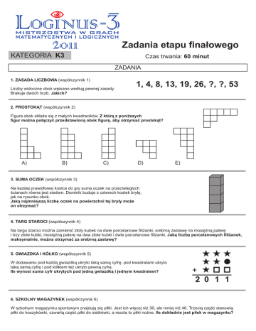 Zadania etapu finałowego KATEGORIA K3 Czas trwania: 60 minut ZADANIA 1. ZASADA LICZBOWA (współczynnik 1) Liczby widoczne obok wpisano według pewnej zasady. Brakuje dwóch liczb. Jakich? 1, 4, 8, 13, 19, 26, ?, ?, 53 2. PROSTOKĄT (współczynnik 2) Figura obok składa się z małych kwadracików. Z którą z poniższych figur można połączyć przedstawioną obok figurę, aby otrzymać prostokąt? A) B) C) D) E) 3. SUMA OCZEK (współczynnik 3) Na każdej prawidłowej kostce do gry suma oczek na przeciwległych ścianach równa jest siedem. Dominik buduje z czterech kostek bryłę, jak na rysunku obok. Jaką najmniejszą liczbę oczek na powierzchni tej bryły może on otrzymać? 4. TARG STAROCI (współczynnik 4) Na targu staroci można zamienić złoty kubek na dwie porcelanowe filiżanki, srebrną zastawę na mosiężną paterę i trzy złote kubki, mosiężną paterę na dwa złote kubki i dwie porcelanowe filiżanki. Jaką liczbę porcelanowych filiżanek, maksymalnie, można otrzymać za srebrną zastawę? 5. GWIAZDKA I KÓŁKO (współczynnik 5) W dodawaniu pod każdą gwiazdką ukryto taką samą cyfrę, pod kwadratami ukryto taką samą cyfrę i pod kółkiem też ukryto pewną cyfrę. Ile wynosi suma cyfr ukrytych pod jedną gwiazdką i jednym kwadratem? + 2 0 1 1 6. SZKOLNY MAGAZYNEK (współczynnik 6) W szkolnym magazynku sportowym znajdują się piłki. Jest ich więcej niż 30, ale mniej niż 40. Trzecią część stanowią piłki do koszykówki, czwartą część piłki do siatkówki, a reszta to piłki nożne. Ile dokładnie jest piłek w magazynku? 7. CZTERY CYFRY (współczynnik 7) Mamy pewną liczbę (rysunek obok). Jakie cztery cyfry należy usunąć z tej liczby, aby otrzymać najmniejszą z możliwych liczb trzycyfrowych? (w Karcie Odpowiedzi wpisz cyfry skreślone w kolejności idąc od lewej) UWAGA! Nie zmieniamy położenia cyfr względem siebie. 5821604 8. DOMINO (współczynnik 8) 2 0 Dominik używa zestawu sześciu różnych kości domina. Dwa pola każdej kości domina mają, każde, cyfrę 0, 1 lub 2. Dominik ułożył wszystkie kości domina na stole w taki sposób, aby dwa pola (różnych kości domina), które stykają się, miały zawsze tą samą cyfrę. Uzupełnić figurę. (w Karcie Odpowiedzi wpisz w pola kostek domina odpowiednie cyfry) 1 0 9. PROGRAM (współczynnik 9) Pewien program komputerowy zamalowuje białe punkty na czarno. W tej wersji programu zamalowane zostaną punkty, w które skierowane są tylko dwie strzałki. Ile punktów zostanie zamalowanych na rysunku obok? 10. ĆWIARTKI (współczynnik 10) Ile trzeba wziąć ćwiartek ćwiartki, aby otrzymać połówkę połówki? 11. PIRAMIDKA (współczynnik 11) 4 7 5 Wojtek skonstruował piramidkę liczbową. W pierwszym wierszu wpisał swoje ulubione liczby: 4, 7, 5. Następne pola wypełniał tak, że dodawał liczby znajdujące powyżej danej kratki i wpisywał w nią ostatnią cyfrę otrzymanej sumy. Jeżeli powyżej była jedna liczba to przepisywał ją. Jakie liczby znajdą się na dole piramidy? 12. SKLEP MUZYCZNY (współczynnik 12) W sklepie muzycznym postanowiono zrobić spis płyt. Trzech pracowników spisywało płyty przez 3 dni. Pierwszy naliczył 988 płyt, drugi 1010 płyt, a trzeci 1022 płyty. “Pomyliliście się, powiedział właściciel sklepu, najbliżej prawdy był ten, kto pomylił się o 7 płyt, drugi ten kto pomylił się o 15 płyt, a trzeci co pomylił się o 19 płyt. Jaka jest dokładna liczba płyt w sklepie muzycznym? 13. LIS I KURY (współczynnik 13) W pewnym gospodarstwie giną kury, które porywane są przez lisy. Sześć lisów porywa łącznie 8 kur w ciągu 3 dni. Ile kur porwą trzy lisy w ciągu 9 dni? 14. LICZBA OCZEK (współczynnik 14) Na kostce prawidłowej suma oczek na przeciwległych ściankach jest równa siedem. * Na planszy położona jest taka kostka w pozycji jak na rysunku. Kostkę tę przetaczamy na kolejne pola, tak jak wskazują strzałki, obracając ją za każdym razem względem odpowiedniej krawędzi. Jaka będzie liczba oczek na górnej ścianie kostki w momencie, gdy znajdzie się ona na kwadracie oznaczonym ? * 15. SIEĆ (współczynnik 15) Z jednakowych patyczków ułożono sieć o 32 sześciokątnych oczkach w trzech rzędach (rysunek obok). Z ilu patyczków składa się ta sieć? ... ... ...