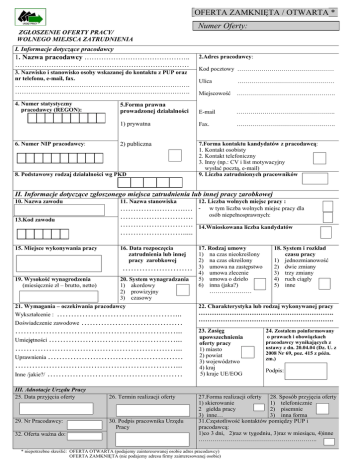 OFERTA ZAMKNIĘTA / OTWARTA * ZGŁOSZENIE OFERTY PRACY/ WOLNEGO MIEJSCA ZATRUDNIENIA Numer Oferty: I. Informacje dotyczące pracodawcy 1. Nazwa pracodawcy …………………………………….. ……………………………………………………………… 3. Nazwisko i stanowisko osoby wskazanej do kontaktu z PUP oraz nr telefonu, e-mail, fax. 6. Numer NIP pracodawcy: Kod pocztowy ………………………………………… Ulica ………………………………………… Miejscowość …………………………………………. 5.Forma prawna prowadzonej działalności E-mail …………………………………………. 1) prywatna Fax. …………………………………………. 2) publiczna 7.Forma kontaktu kandydatów z pracodawcą: 1. Kontakt osobisty 2. Kontakt telefoniczny 3. Inny (np.: CV i list motywacyjny wysłać pocztą, e-mail) 9. Liczba zatrudnionych pracowników ……………………………………………………………………. ……………………………………………………………………. 4. Numer statystyczny pracodawcy (REGON): 2.Adres pracodawcy: 8. Podstawowy rodzaj działalności wg PKD II. Informacje dotyczące zgłoszonego miejsca zatrudnienia lub innej pracy zarobkowej 10. Nazwa zawodu 11. Nazwa stanowiska 13.Kod zawodu …………………….… ………………………. ………………………. ……………………..... 15. Miejsce wykonywania pracy 16. Data rozpoczęcia zatrudnienia lub innej pracy zarobkowej ……………………. 19. Wysokość wynagrodzenia (miesięcznie zł – brutto, netto) 20. System wynagradzania 1) akordowy 2) prowizyjny 3) czasowy 21. Wymagania – oczekiwania pracodawcy Wykształcenie : ……………………………………... ……………………………… …………………………………………………... Umiejętności ………………………………………... …………………………………………………... Uprawnienia ………………………………………… …………………………………………………... Inne /jakie?/ ………………………………………… Doświadczenie zawodowe III. Adnotacje Urzędu Pracy 25. Data przyjęcia oferty 29. Nr Pracodawcy: 32. Oferta ważna do: 26. Termin realizacji oferty 30. Podpis pracownika Urzędu Pracy 12. Liczba wolnych miejsc pracy : - w tym liczba wolnych miejsc pracy dla osób niepełnosprawnych: 14.Wnioskowana liczba kandydatów 17. Rodzaj umowy 1) na czas nieokreślony 2) na czas określony 3) umowa na zastępstwo 4) umowa zlecenie 5) umowa o dzieło 6) inna (jaka?) ………………… 18. System i rozkład czasu pracy 1) jednozmianowość 2) dwie zmiany 3) trzy zmiany 4) ruch ciągły 5) inne 22. Charakterystyka lub rodzaj wykonywanej pracy ……………………………………………………. ……………………………………………………. 23. Zasięg upowszechnienia oferty pracy 1) miasto 2) powiat 3) województwo 4) kraj 5) kraje UE/EOG 24. Zostałem poinformowany o prawach i obowiązkach pracodawcy wynikających z ustawy z dn. 20.04.04 (Dz. U. z 2008 Nr 69, poz. 415 z późn. zm.) Podpis: 27.Forma realizacji oferty 28. Sposób przyjęcia oferty 1) skierowanie 1) telefonicznie 2 giełda pracy 2) pisemnie 3) inne… 3) inna forma 31.Częstotliwość kontaktów pomiędzy PUP i pracodawcą: 1)co 3 dni, 2)raz w tygodniu, 3)raz w miesiącu, 4)inne ………………………………………………….. * niepotrzebne skreślić: OFERTA OTWARTA (podajemy zainteresowanej osobie adres pracodawcy) OFERTA ZAMKNIĘTA (nie podajemy adresu firmy zainteresowanej osobie)