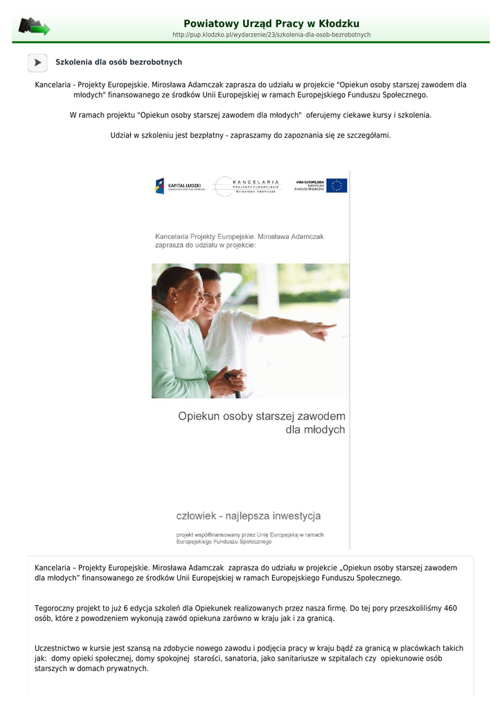Powiatowy Urząd Pracy w Kłodzku http://pup.klodzko.pl/wydarzenie/23/szkolenia-dla-osob-bezrobotnych Szkolenia dla osób bezrobotnych Kancelaria - Projekty Europejskie. Mirosława Adamczak zaprasza do udziału w projekcie "Opiekun osoby starszej zawodem dla młodych" finansowanego ze środków Unii Europejskiej w ramach Europejskiego Funduszu Społecznego. W ramach projektu "Opiekun osoby starszej zawodem dla młodych" oferujemy ciekawe kursy i szkolenia. Udział w szkoleniu jest bezpłatny - zapraszamy do zapoznania się ze szczegółami. Kancelaria – Projekty Europejskie. Mirosława Adamczak zaprasza do udziału w projekcie „Opiekun osoby starszej zawodem dla młodych” finansowanego ze środków Unii Europejskiej w ramach Europejskiego Funduszu Społecznego. Tegoroczny projekt to już 6 edycja szkoleń dla Opiekunek realizowanych przez nasza firmę. Do tej pory przeszkoliliśmy 460 osób, które z powodzeniem wykonują zawód opiekuna zarówno w kraju jak i za granicą. Uczestnictwo w kursie jest szansą na zdobycie nowego zawodu i podjęcia pracy w kraju bądź za granicą w placówkach takich jak: domy opieki społecznej, domy spokojnej starości, sanatoria, jako sanitariusze w szpitalach czy opiekunowie osób starszych w domach prywatnych. W ramach projektu „Opiekun osoby starszej zawodem dla młodych” oferujemy: ● ● ● ● ● ● ● ● ● szkolenie zawodowe z zakresu opieki nad osobami starszymi – 160 h, kurs języka obcego – 80 h, kurs pierwszej pomocy z certyfikatem PCK – 16 h, warsztaty aktywnego poszukiwania pracy, 3 miesiące płatnego stażu, stypendium szkoleniowe, zakwaterowanie lub zwrot kosztów dojazdu, catering w czasie trwania szkolenia, pomoc w znalezieniu zatrudnienia. Zajęcia i staże w ramach projektu odbywać się będą we Wrocławiu. Po zakończonym kursie uczestnicy otrzymają zaświadczenie o odbyciu szkolenia. Projekt kierowany jest do osób: ● ● ● ● zamieszkujących lub uczących się w powiatach: dzierżoniowskim, górowskim, jaworskim, jeleniogórskim ziemskim, kamiennogórskim, kłodzkim, legnickim ziemskim, lubańskim, lwóweckim, wałbrzyskim, wołowskim, ząbkowickim oraz złotoryjskim, (Chodzi o miejsce zamieszkania, nie o miejsce zameldowania.) pozostających bez zatrudnienia przez okres min. 12 miesięcy przed przystąpieniem do projektu (w tym mogą być osoby zarejestrowane w PUP), w wieku 18-25, posiadających minimum średnie wykształcenie. Udział w szkoleniu jest bezpłatny. Wiecej informacji na temat projektu można uzyskać na stronie www.projektyeuropejskie.com.pl, pod numerem telefonu 71 792 80 30 oraz w siedzibie firmy. Dokumenty rekrutacyjne do projektu "Opiekun osoby starszej zawodem dla młodych" dostępne są na stronie http://www.projektyeuropejskie.com.pl/d277/opiekun_osoby_starszej_zawodem_dla_mlodych Wszystkich zainteresowanych zapraszamy do pobrania dokumentów. Wypełnione dokumenty można dostarczyć do Biura Projektu osobiście, pocztą lub e-mailem. Kancelaria - Projekty Europejskie. Mirosława Adamczak ul. Sudecka 74/28 53-129 Wrocław e-mail: [email protected]