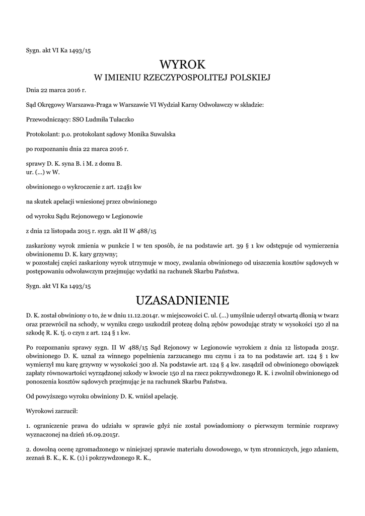 Sygn. akt VI Ka 1493/15 WYROK W IMIENIU RZECZYPOSPOLITEJ POLSKIEJ Dnia 22 marca 2016 r. Sąd Okręgowy Warszawa-Praga w Warszawie VI Wydział Karny Odwoławczy w składzie: Przewodniczący: SSO Ludmiła Tułaczko Protokolant: p.o. protokolant sądowy Monika Suwalska po rozpoznaniu dnia 22 marca 2016 r. sprawy D. K. syna B. i M. z domu B. ur. (...) w W. obwinionego o wykroczenie z art. 124§1 kw na skutek apelacji wniesionej przez obwinionego od wyroku Sądu Rejonowego w Legionowie z dnia 12 listopada 2015 r. sygn. akt II W 488/15 zaskarżony wyrok zmienia w punkcie I w ten sposób, że na podstawie art. 39 § 1 kw odstępuje od wymierzenia obwinionemu D. K. kary grzywny; w pozostałej części zaskarżony wyrok utrzymuje w mocy, zwalania obwinionego od uiszczenia kosztów sądowych w postępowaniu odwoławczym przejmując wydatki na rachunek Skarbu Państwa. Sygn. akt VI Ka 1493/15 UZASADNIENIE D. K. został obwiniony o to, że w dniu 11.12.2014r. w miejscowości C. ul. (...) umyślnie uderzył otwartą dłonią w twarz oraz przewrócił na schody, w wyniku czego uszkodził protezę dolną zębów powodując straty w wysokości 150 zł na szkodę R. K. tj. o czyn z art. 124 § 1 kw. Po rozpoznaniu sprawy sygn. II W 488/15 Sąd Rejonowy w Legionowie wyrokiem z dnia 12 listopada 2015r. obwinionego D. K. uznał za winnego popełnienia zarzucanego mu czynu i za to na podstawie art. 124 § 1 kw wymierzył mu karę grzywny w wysokości 300 zł. Na podstawie art. 124 § 4 kw. zasądził od obwinionego obowiązek zapłaty równowartości wyrządzonej szkody w kwocie 150 zł na rzecz pokrzywdzonego R. K. i zwolnił obwinionego od ponoszenia kosztów sądowych przejmując je na rachunek Skarbu Państwa. Od powyższego wyroku obwiniony D. K. wniósł apelację. Wyrokowi zarzucił: 1. ograniczenie prawa do udziału w sprawie gdyż nie został powiadomiony o pierwszym terminie rozprawy wyznaczonej na dzień 16.09.2015r. 2. dowolną ocenę zgromadzonego w niniejszej sprawie materiału dowodowego, w tym stronniczych, jego zdaniem, zeznań B. K., K. K. (1) i pokrzywdzonego R. K., 3. błędne ustalenie, że celowo uszkodził protezę zębową R. K. gdyż nie uderzył pokrzywdzonego. Jedynie bronił się przed atakiem żony, córki i teścia, którzy naruszyli jego mir domowy. 4. brak wniosku o ściganie złożonego przez R. K., 5. powołał się na poważny konflikt rodzinny, w wyniku którego jest szykanowany, niesłusznie oskarżany przez żonę, teścia i córkę. W konkluzji wniósł o uchylenie zaskarżonego wyroku i umorzenie sprawy. Sąd Okręgowy, zważył co, następuje: Apelacja obwinionego zasługiwała na częściowe uwzględnienie. Zgromadzony w sprawie materiał dowodowy wskazuje, że obwiniony uderzył pokrzywdzonego R. K. dwukrotnie otwartą dłonią w twarz. Uderzenia a następnie upadek pokrzywdzonego na schody spowodowały pęknięcie protezy zębowej. Naprawa protezy kosztowała 150 zł. Powyższe ustalenia sądu I instancji są prawidłowe. O uderzeniach zeznał pokrzywdzony R. K., B. K. oraz K. K. (1). Do uszkodzenia protezy zębowej musiało dojść pod wpływem uderzenia a następnie upadku pokrzywdzonego bowiem świadczą o tym zeznania R. K. oraz policjanta M. O., którego pokrzywdzony podczas interwencji podjętej bezpośrednio po zdarzeniu poinformował o tym fakcie. Uszkodzenie protezy potwierdza zaświadczenie z (...). /k- 24/ Uderzenia zadane w twarz są zachowaniem celowym a więc obwiniony godził się na to, że mogą one doprowadzić do uszkodzenia protezy zębowej pokrzywdzonego R. K.. Sąd I instancji prawidłowo ocenił działanie obwinionego jako podjęte z zamiarem wynikowym. Skutek w postaci pęknięcia protezy zębowej pod wpływem uderzeń jest skutkiem typowym i pozostaje w adekwatnym związki przyczynowym z zachowaniem obwinionego. Uderzenia nie spowodowały widocznych śladów na ciele R. K. lecz ich skutkiem było pęknięcia protezy zębowej. Sąd I instancji nie uwzględnił jednak tła konfliktu i okoliczności zdarzenia, o których wyjaśnił obwiniony. Rozwinięcie tych okoliczności przedstawił D. K. w swojej apelacji. Wiążą się one z głębokim konfliktem rodzinnym przejawiającym się w braku porozumienia w sprawach prowadzenia wspólnego gospodarstwa domowego oraz sposobu wychowania syna. W wyniku tej konfliktowej sytuacji obwiniony zajął jeden pokój zaś pozostałe pomieszczenia w domu jednorodzinnym zajmuje jego żona B. K. i ich syn K. K. (2). W dniu 11.12.2014r. B. K. weszła do pokoju obwinionego i nie opuściła go pomimo wezwania aby wyszła. Przeszukała to pomieszczenie domagając się wydania dokumentów ZUS oraz wiertarki. Zachowała się w ten sposób pomimo, że dwa dni wcześniej, w dniu 8. 12. 2014r. także w podobnych okolicznościach, podczas obecności policjantów uzyskała od obwinionego dokumenty ZUS wystawione na jej nazwisko. Tym samym sprowokowała obwinionego do zastosowania siły fizycznej a następnie pod wpływem jej krzyku interweniował pokrzywdzony R. K. oraz córka K. K. (1). Obwiniony miał przeciwko sobie trzy osoby. Dlatego wypchnął z zajmowanego przez siebie pokoju R. K. dwukrotnie uderzając go w twarz i popychając na schody. Z kolei R. K. podjął interwencję w celu obrony swojej córki B. K.. B. K. doznała drobnych otarć naskórka. Gdy obwiniony wypchnął R. K. z pokoju zamknął się w nim razem z B. K. i otworzył drzwi dopiero gdy przyjechali policjanci wezwani przez K. K. (1). Powyższe okoliczności wskazują na prowokacyjne i wymuszające działania B. K.. Wobec powyższego należy dojść do przekonania, że zachodzą szczególne okoliczności wskazane w art. 39 § 1 kw. Próba narzucenia swojej woli oraz nieustępliwość doprowadziły do eskalacji konfliktu rodzinnego. Użyta przez obwinionego siła fizyczna nie była nadmierna skoro nie spowodowała bolesnych obrażeń ciała u pokrzywdzonego R. K.. Także B. K. doznała powierzchownych obtarć naskórka. Jak wynika z zeznań policjanta