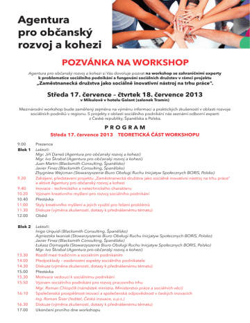 Agentura pro občanský rozvoj a kohezi Pozvánka NA Workshop Agentura pro občanský rozvoj a kohezi si Vás dovoluje pozvat na workshop se zahraničními experty k problematice sociálního podnikání a fungování sociálních družstev v rámci projektu „Zaměstnanecká družstva jako sociálně inovativní nástroj na trhu práce“. Středa 17. července – čtvrtek 18. července 2013 v Mikulově v hotelu Galant (salonek Tramín) Mezinárodní workshop bude zaměřený zejména na výměnu informací a praktických zkušeností v oblasti rozvoje sociálních podniků v regionu. S projekty z oblasti sociálního podnikání nás seznámí odborní experti z České republiky, Španělska a Polska. Program Středa 17. července 2013 Teoretická část workshopu 9.00 Prezence Blok 1 Lektoři: Mgr. Jiří Daneš (Agentura pro občanský rozvoj a kohezi) Mgr. Ivo Škrabal (Agentura pro občanský rozvoj a kohezi) Juan Martin (Blacksmith Consulting, Španělsko) Javier Finez (Blacksmith Consulting, Španělsko) Zbygniew Wejcman (Stowarzyszenie Biuro Obsługi Ruchu Inicjatyw Społecznych BORIS, Polsko) 9.20 Zahájení, představení projektu „Zaměstnanecká družstva jako sociálně inovativní nástroj na trhu práce“ a aktivit Agentury pro občanský rozvoj a kohezi 9.40 Inovace – technického a netechnického charakteru 10.20 Význam kreativního myšlení pro rozvoj sociálního podnikání 10.40 Přestávka 11.00 Styly kreativního myšlení a jejich využití pro řešení problémů 11.30 Diskuze (výměna zkušeností, dotazy k přednášenému tématu) 12.00 Oběd Blok 2 Lektoři: Inigo Urquidi (Blacksmith Consulting, Španělsko) Agniezska Iwaniak (Stowarzyszenie Biuro Obsługi Ruchu Inicjatyw Społecznych BORIS, Polsko) Javier Finez (Blacksmith Consulting, Španělsko) Łukasz Domagała (Stowarzyszenie Biuro Obsługi Ruchu Inicjatyw Społecznych BORIS, Polsko) Mgr. Ivo Škrabal (Agentura pro občanský rozvoj a kohezi) 13.30 Rozdíl mezi tradičním a sociálním podnikáním 14.00 Předpoklady – osobnostní aspekty sociálního podnikatele 14.30 Diskuze (výměna zkušeností, dotazy k přednášenému tématu) 15.00 Přestávka 15.30 Motivace vedoucí k sociálnímu podnikání 15.50 Význam sociálního podnikání pro rozvoj pracovního trhu Mgr. Roman Chlopčík (náměstek ministra, Ministerstvo práce a sociálních věcí) 16:10 Společenská prospěšnost inovací a společenská odpovědnost v českých inovacích Ing. Roman Šiser (ředitel, Česká inovace, o.p.s.) 16.30 Diskuze (výměna zkušeností, dotazy k přednášenému tématu) 17.00 Ukončení prvního dne workshopu Čtvrtek 18. července 2013 Praktická část workshopu 8.15 Prezence Blok 3 Lektoři: Inigo Urquidi (Blacksmith Consulting, Španělsko) Agniezska Iwaniak (Stowarzyszenie Biuro Obsługi Ruchu Inicjatyw Społecznych BORIS, Polsko) Javier Finez (Blacksmith Consulting, Španělsko) Zbygniew Wejcman (Stowarzyszenie Biuro Obsługi Ruchu Inicjatyw Społecznych BORIS, Polsko) Juan Martin (Blacksmith Consulting, Španělsko) Łukasz Domagała (Stowarzyszenie Biuro Obsługi Ruchu Inicjatyw Społecznych BORIS, Polsko) 8.30 Proces kreativity – využití zahraničních zkušeností (model matice pro identifikaci potenciálu sociálního podnikání) 9.00 Příklady inovací v rozvoji sociálního podnikání ze zahraničí 10.30 Přestávka 11.00 Nácvik a tvorba sociálně podnikatelských inovací – definice problémů, tvorba idejí, syntéza a hodnocení idejí, využití kreativního řešení, vývoj produktů a služeb, sociální podnikání 11.20 Proces kreativity – trénink využití Modelu matice pro identifikaci potenciálu rozvoje sociálního podnikání 11.40 Diskuze (výměna zkušeností, dotazy k přednášenému tématu) 12.00 Oběd Blok 4 Lektoři: Inigo Urquidi (Blacksmith Consulting, Španělsko) Łukasz Domagała (Stowarzyszenie Biuro Obsługi Ruchu Inicjatyw Społecznych BORIS, Polsko) Javier Finez (Blacksmith Consulting, Španělsko) Zbygniew Wejcman (Stowarzyszenie Biuro Obsługi Ruchu Inicjatyw Społecznych BORIS, Polsko) Mgr. Ivo Škrabal (Agentura pro občanský rozvoj a kohezi) 13.30 Individuální a skupinová práce – nácvik kreativního myšlení pro rozvoj sociálního podnikání a konzultace projektových idejí 17.00 Ukončení workshopu Těšíme se na setkání s Vámi! Překlad z/do anglického jazyka bude zajištěn po celou dobu workshopu. Občerstvení a oběd budou účastníkům workshopu k dispozici zdarma. Prosíme o potvrzení Vaší účasti. Vyplněnou návratku, prosím, zašlete nejpozději do 11. července nejlépe e-mailem na adresu: [email protected] Organizace workshopu: Agentura pro občanský rozvoj a kohezi Na návsi 218, 664 51 Kobylnice Mgr. Jiří Daneš tel.: 739 511 306 e-mail: [email protected] www.socialni-inovace.eu 2013