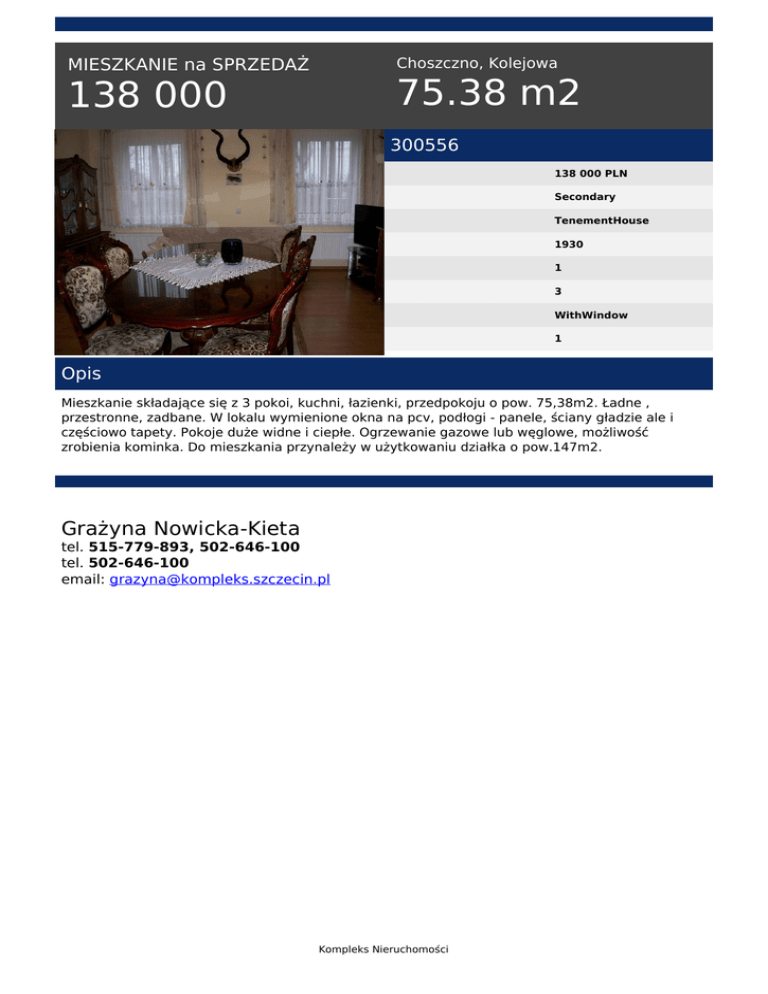 Choszczno, Kolejowa MIESZKANIE na SPRZEDAŻ 75.38 m2 138 000 300556 138 000 PLN Secondary TenementHouse 1930 1 3 WithWindow 1 Opis Mieszkanie składające się z 3 pokoi, kuchni, łazienki, przedpokoju o pow. 75,38m2. Ładne , przestronne, zadbane. W lokalu wymienione okna na pcv, podłogi - panele, ściany gładzie ale i częściowo tapety. Pokoje duże widne i ciepłe. Ogrzewanie gazowe lub węglowe, możliwość zrobienia kominka. Do mieszkania przynależy w użytkowaniu działka o pow.147m2. Grażyna Nowicka-Kieta tel. 515-779-893, 502-646-100 tel. 502-646-100 email: [email protected] Kompleks Nieruchomości Powered by TCPDF (www.tcpdf.org)