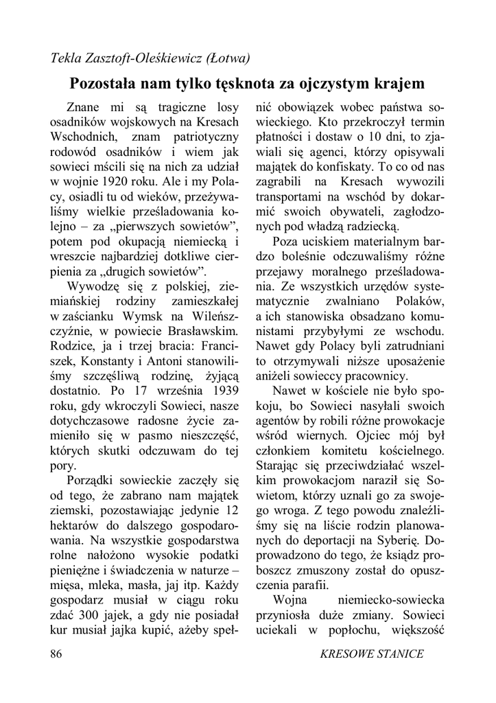Tekla Zasztoft-Oleśkiewicz (Łotwa) Pozostała nam tylko tęsknota za ojczystym krajem Znane mi są tragiczne losy osadników wojskowych na Kresach Wschodnich, znam patriotyczny rodowód osadników i wiem jak sowieci mścili się na nich za udział w wojnie 1920 roku. Ale i my Polacy, osiadli tu od wieków, przeżywaliśmy wielkie prześladowania kolejno – za „pierwszych sowietów”, potem pod okupacją niemiecką i wreszcie najbardziej dotkliwe cierpienia za „drugich sowietów”. Wywodzę się z polskiej, ziemiańskiej rodziny zamieszkałej w zaścianku Wymsk na Wileńszczyźnie, w powiecie Brasławskim. Rodzice, ja i trzej bracia: Franciszek, Konstanty i Antoni stanowiliśmy szczęśliwą rodzinę, żyjącą dostatnio. Po 17 września 1939 roku, gdy wkroczyli Sowieci, nasze dotychczasowe radosne życie zamieniło się w pasmo nieszczęść, których skutki odczuwam do tej pory. Porządki sowieckie zaczęły się od tego, że zabrano nam majątek ziemski, pozostawiając jedynie 12 hektarów do dalszego gospodarowania. Na wszystkie gospodarstwa rolne nałożono wysokie podatki pieniężne i świadczenia w naturze – mięsa, mleka, masła, jaj itp. Każdy gospodarz musiał w ciągu roku zdać 300 jajek, a gdy nie posiadał kur musiał jajka kupić, ażeby speł86 nić obowiązek wobec państwa sowieckiego. Kto przekroczył termin płatności i dostaw o 10 dni, to zjawiali się agenci, którzy opisywali majątek do konfiskaty. To co od nas zagrabili na Kresach wywozili transportami na wschód by dokarmić swoich obywateli, zagłodzonych pod władzą radziecką. Poza uciskiem materialnym bardzo boleśnie odczuwaliśmy różne przejawy moralnego prześladowania. Ze wszystkich urzędów systematycznie zwalniano Polaków, a ich stanowiska obsadzano komunistami przybyłymi ze wschodu. Nawet gdy Polacy byli zatrudniani to otrzymywali niższe uposażenie aniżeli sowieccy pracownicy. Nawet w kościele nie było spokoju, bo Sowieci nasyłali swoich agentów by robili różne prowokacje wśród wiernych. Ojciec mój był członkiem komitetu kościelnego. Starając się przeciwdziałać wszelkim prowokacjom naraził się Sowietom, którzy uznali go za swojego wroga. Z tego powodu znaleźliśmy się na liście rodzin planowanych do deportacji na Syberię. Doprowadzono do tego, że ksiądz proboszcz zmuszony został do opuszczenia parafii. Wojna niemiecko-sowiecka przyniosła duże zmiany. Sowieci uciekali w popłochu, większość KRESOWE STANICE z nich dostała się do niewoli niemieckiej. Wprawdzie znikła groźba wywózki na Sybir, czy życia w kołchozie – czego wszyscy Polacy obawiali się bardzo – jednak prześladowania niemieckie nie były lżejsze od sowieckich. Niemcy panoszyli się tak samo jak Sowieci, obłożyli gospodarzy wysokimi kontyngentami i konsekwentnie je egzekwowali. W tym czasie gospodarstwa rolne były tak zabiedzone w okresie władzy sowieckiej, że ledwie mogły wyżywić pracujące na nich rodziny. Z lat okupacji niemieckiej pamiętam kilka wydarzeń, które mocno utkwiły w mojej psychice dziecka. Jedno z nich to obławy niemieckie na partyzantów, ukrywających się w lasach, przypadki pacyfikacji wiosek i spalenia ludzi spędzonych do domu czy gumna. Innym przeżyciem ważnym dla mnie było okrutne prześladowanie Żydów. Ojciec nasz będąc człowiekiem religijnym starał się zawsze żyć w zgodzie i poszanowaniu z innymi ludźmi, także z Żydami mimo iż byli innowiercami. Gdy znajomi Żydzi, po ucieczce z getta, przychodzili do nas nocami prosząc o trochę żywności, ojciec nigdy nie odmawiał wsparcia, chociaż sami mieliśmy niewiele. Mama nasza chorowała obłożnie od 1937 roku, dlatego znaczna część obowiązków domowych spaKRESOWE STANICE dało na mnie, chociaż pomagała nam siostra ojca – ciocia Elżbieta. Pewnego świątecznego dnia mama przywołała mnie do łóżka i powiedziała: – „Dzieci mogłybyście dzisiaj pójść do kościoła.” Poszłam z młodszym bratem Antonim. Kościół był oddalony od naszego domu o około cztery kilometry. Trzeba było polną drogą dojść do gościńca i gościńcem do samego kościoła. Z daleka zobaczyliśmy na gościńcu sznur furmanek. Widok ten zaniepokoił mnie trochę, ale szliśmy dalej. Gdy zbliżyliśmy się do gościńca okazało się, że furmanki załadowane są drutem kolczastym, a obok furmanów siedzą uzbrojeni żandarmi. Mówiono później, że drut ten służył do grodzenia getta. Obydwoje z bratem byliśmy mocno wystraszeni widokiem uzbrojonych Niemców. Żandarmi dostrzegli to i nabrali przekonania, że jesteśmy żydowskimi dziećmi. Zasypywali nas pytaniami skąd i dokąd idziemy, często powtarzali słowa: Jude! Jude! Nie wiedzieliśmy jak się bronić, jak się tłumaczyć, bo strach sparaliżował nas całkowicie. Gdy kierowali lufy automatów w naszą stronę myślałam, że zaraz nas zastrzelą. Szliśmy obok furmanki może kilometr. Niedaleko kościoła było kilka domów i głęboki rów. Nerwy moje nie wytrzymały napięcia i zaczęliśmy z bratem uciekać. Uciekaliśmy rowem, a później przez ogrody i sady 87 a w uszach brzmiały mi krzyki: Halt! Halt! Jakoś szczęśliwie przebiegliśmy między domami i dołączyliśmy do grupy ludzi udających się do kościoła. Byliśmy tak wystraszeni, że w kościele ukryliśmy się we wnęce za ołtarzem. Przesiedzieliśmy tam nabożeństwo. Wyszliśmy z ukrycia dopiero, gdy wszyscy ludzie opuścili kościół, a kościelny dzwonił kluczami szykując się do zamknięcia świątyni. Baliśmy się wracać do domu i chcieliśmy znaleźć sobie kryjówkę na cmentarzu, ale kościelny stwierdził, że Niemców już nie ma i nic nam nie grozi. W domu ojciec był bardzo zaniepokojony tym, że nie wracamy z kościoła tak długo. Ucieszył się bardzo gdy powróciliśmy wreszcie, ale zabronił opowiadać mamie o całym zdarzeniu, bo zdenerwowanie mogło by odbić się źle na jej zdrowiu. Wkrótce przeżyłam kolejne chwile g