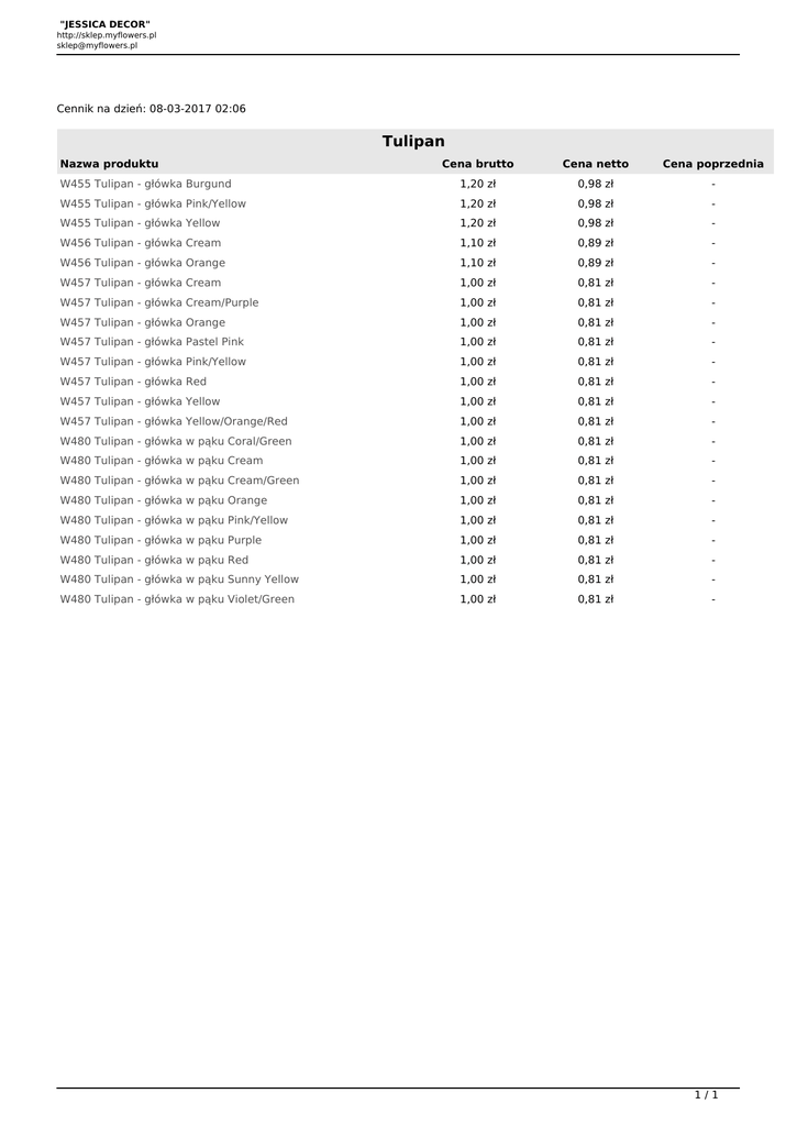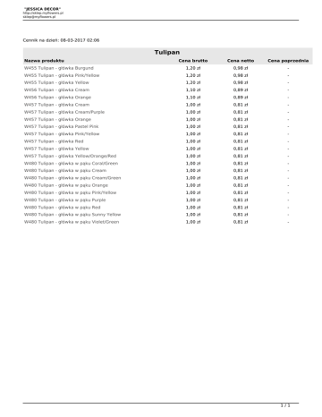 "JESSICA DECOR" http://sklep.myflowers.pl [email protected] Cennik na dzień: 08-03-2017 02:06 Tulipan Nazwa produktu Cena brutto Cena netto Cena poprzednia W455 Tulipan - główka Burgund 1,20 zł 0,98 zł - W455 Tulipan - główka Pink/Yellow 1,20 zł 0,98 zł - W455 Tulipan - główka Yellow 1,20 zł 0,98 zł - W456 Tulipan - główka Cream 1,10 zł 0,89 zł - W456 Tulipan - główka Orange 1,10 zł 0,89 zł - W457 Tulipan - główka Cream 1,00 zł 0,81 zł - W457 Tulipan - główka Cream/Purple 1,00 zł 0,81 zł - W457 Tulipan - główka Orange 1,00 zł 0,81 zł - W457 Tulipan - główka Pastel Pink 1,00 zł 0,81 zł - W457 Tulipan - główka Pink/Yellow 1,00 zł 0,81 zł - W457 Tulipan - główka Red 1,00 zł 0,81 zł - W457 Tulipan - główka Yellow 1,00 zł 0,81 zł - W457 Tulipan - główka Yellow/Orange/Red 1,00 zł 0,81 zł - W480 Tulipan - główka w pąku Coral/Green 1,00 zł 0,81 zł - W480 Tulipan - główka w pąku Cream 1,00 zł 0,81 zł - W480 Tulipan - główka w pąku Cream/Green 1,00 zł 0,81 zł - W480 Tulipan - główka w pąku Orange 1,00 zł 0,81 zł - W480 Tulipan - główka w pąku Pink/Yellow 1,00 zł 0,81 zł - W480 Tulipan - główka w pąku Purple 1,00 zł 0,81 zł - W480 Tulipan - główka w pąku Red 1,00 zł 0,81 zł - W480 Tulipan - główka w pąku Sunny Yellow 1,00 zł 0,81 zł - W480 Tulipan - główka w pąku Violet/Green 1,00 zł 0,81 zł - 1/1 Powered by TCPDF (www.tcpdf.org)