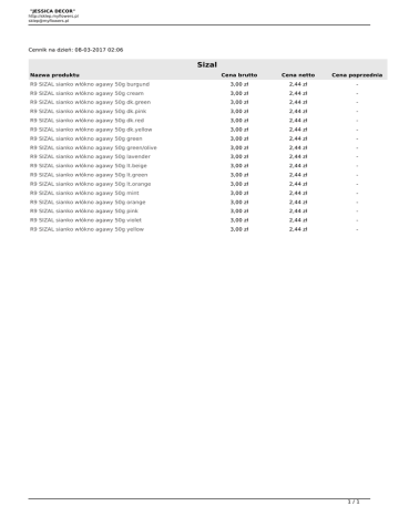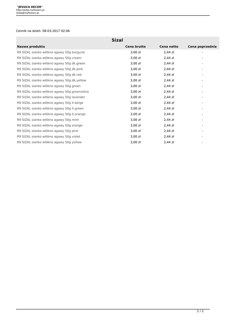 "JESSICA DECOR" http://sklep.myflowers.pl [email protected] Cennik na dzień: 08-03-2017 02:06 Sizal Nazwa produktu Cena brutto Cena netto Cena poprzednia R9 SIZAL sianko włókno agawy 50g burgund 3,00 zł 2,44 zł - R9 SIZAL sianko włókno agawy 50g cream 3,00 zł 2,44 zł - R9 SIZAL sianko włókno agawy 50g dk.green 3,00 zł 2,44 zł - R9 SIZAL sianko włókno agawy 50g dk.pink 3,00 zł 2,44 zł - R9 SIZAL sianko włókno agawy 50g dk.red 3,00 zł 2,44 zł - R9 SIZAL sianko włókno agawy 50g dk.yellow 3,00 zł 2,44 zł - R9 SIZAL sianko włókno agawy 50g green 3,00 zł 2,44 zł - R9 SIZAL sianko włókno agawy 50g green/olive 3,00 zł 2,44 zł - R9 SIZAL sianko włókno agawy 50g lavender 3,00 zł 2,44 zł - R9 SIZAL sianko włókno agawy 50g lt.beige 3,00 zł 2,44 zł - R9 SIZAL sianko włókno agawy 50g lt.green 3,00 zł 2,44 zł - R9 SIZAL sianko włókno agawy 50g lt.orange 3,00 zł 2,44 zł - R9 SIZAL sianko włókno agawy 50g mint 3,00 zł 2,44 zł - R9 SIZAL sianko włókno agawy 50g orange 3,00 zł 2,44 zł - R9 SIZAL sianko włókno agawy 50g pink 3,00 zł 2,44 zł - R9 SIZAL sianko włókno agawy 50g violet 3,00 zł 2,44 zł - R9 SIZAL sianko włókno agawy 50g yellow 3,00 zł 2,44 zł - 1/1 Powered by TCPDF (www.tcpdf.org)