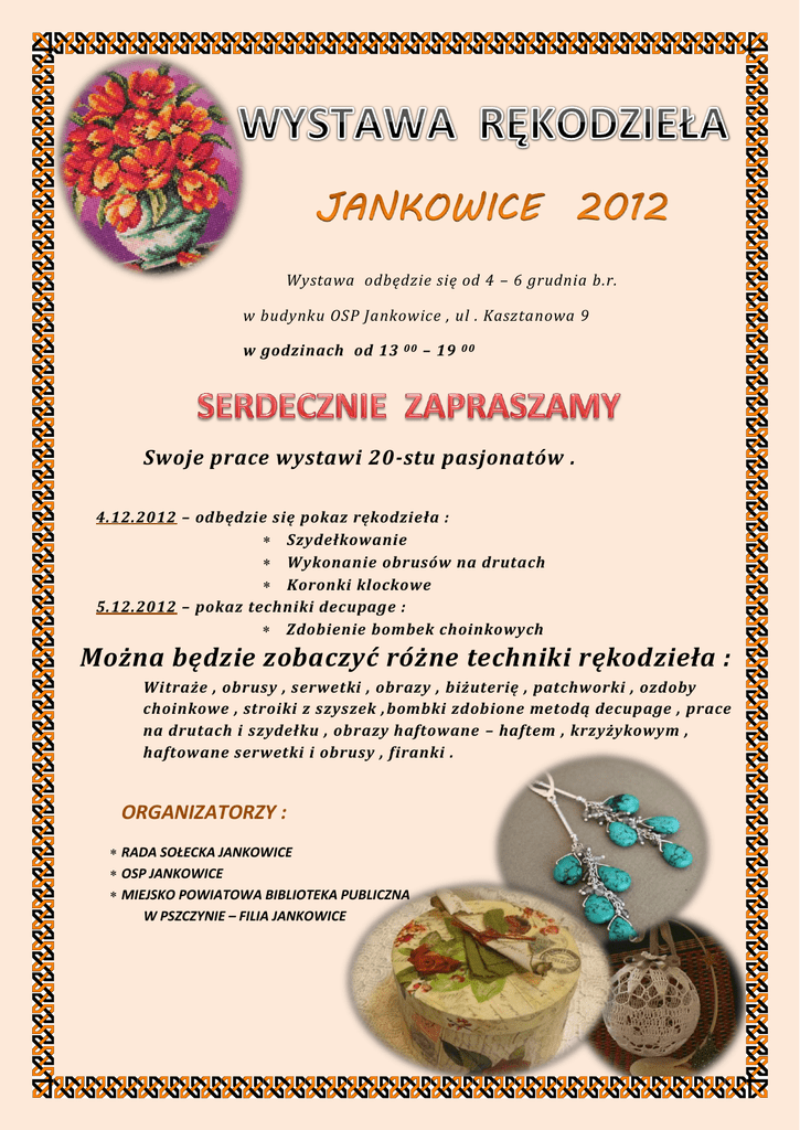 Wystawa odbędzie się od 4 – 6 grudnia b.r. w budynku OSP Jankowice , ul . Kasztanowa 9 w godzinach od 13 00 – 19 00 Swoje prace wystawi 20-stu pasjonatów . 4.12.2012 – odbędzie się pokaz rękodzieła : Szydełkowanie Wykonanie obrusów na drutach Koronki klockowe 5.12.2012 – pokaz techniki decupage : Zdobienie bombek choinkowych Można będzie zobaczyć różne techniki rękodzieła : Witraże , obrusy , serwetki , obrazy , biżuterię , patchworki , ozdoby choinkowe , stroiki z szyszek , bombki zdobione metodą decupage , prace na drutach i szydełku , obrazy haftowane – haftem , krzyżykowym , haftowane serwetki i obrusy , firanki . ORGANIZATORZY : RADA SOŁECKA JANKOWICE OSP JANKOWICE MIEJSKO POWIATOWA BIBLIOTEKA PUBLICZNA W PSZCZYNIE – FILIA JANKOWICE