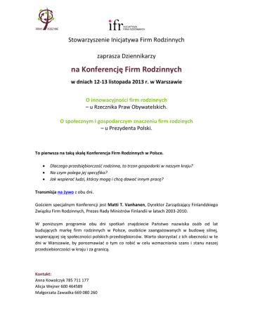 Stowarzyszenie Inicjatywa Firm Rodzinnych zaprasza Dziennikarzy na Konferencję Firm Rodzinnych w dniach 12-13 listopada 2013 r. w Warszawie O innowacyjności firm rodzinnych – u Rzecznika Praw Obywatelskich. O społecznym i gospodarczym znaczeniu firm rodzinych – u Prezydenta Polski. To pierwsza na taką skalę Konferencja Firm Rodzinnych w Polsce. Dlaczego przedsiębiorczość rodzinna, to trzon gospodarki w naszym kraju? Na czym polega jej specyfika? Jak wspierać ludzi, którzy mogą i chcą dawać innym pracę? Transmisja na żywo z obu dni. Gościem specjalnym Konferencji jest Matti T. Vanhanen, Dyrektor Zarządzający Finlandzkiego Związku Firm Rodzinnych, Prezes Rady Ministrów Finlandii w latach 2003-2010. W poniższym programie obu dni spotkań znajdziecie Państwo nazwiska osób od lat budujących markę firm rodzinnych w Polsce, osobiście zaangażowanych w budowę silnej, wspierającej się społeczności polskich przedsiębiorców. Warto skorzystać z ich obecności w te dni w Warszawie, by porozmawiać o tym co robić w celu wzmacniania szans i stanu naszej przedsiebiorczości w kraju i za granicą. Kontakt: Anna Kowalczyk 785 711 177 Alicja Wejner 600 464589 Małgorzata Zawadka 669 080 260 PROGRAM 12 listopada 2013 roku – zapraszamy do Biura Rzecznika Praw Obywatelskich, przy ul. Długiej 23/25. Dyskusja przebiegać będzie pod hasłem „Innowacyjność Firm Rodzinnych” Gospodarzami spotkania będą: prof. Irena Lipowicz, Rzecznik Praw Obywatelskich; Bożena Lubińska-Kasprzak, Prezes PARP; Andrzej Blikle, Prezes IFR W programie m.in. 13:00 „Innowacje w kreowaniu rynku pracy” – Małgorzata Marcińska, wiceminister Pracy i Polityki Społecznej 13:20 „Rodzinna i Innowacyjna” – Bożena Lublińska-Kasprzak, prezes PARP 13:40 PANEL INNOWATORÓW – część I: „Przegląd innowacyjnych projektów zrealizowanych w firmach rodzinnych”: Piotr Voelkel (Vox) Lech Waliszewski (Fa Krosno) Piotr Błażejewski (Stara Przędzalnia) Ewelina Dąbska (Oleo-Vita) Paulina Ada Kalińska i Joanna Trepka (Loft 37) Andrzej Boczarowski (Jura Park) 15:40 Przerwa na kawę 16:00 PANEL INNOWATORÓW – część II „Skąd wsparcie, a gdzie utrudnienia we wdrażaniu innowacji” – dyskusja z udziałem przedstawicieli firm rodzinnych 17:00 „Finland – innovative economy”, Kari Vähäkangas, Radca Handlowy Ambasady Finlandii 17:20 „Ekonomiczne znaczenie miłości bliźniego”, prof. Janusz Czapiński 17:40 Podsumowanie i zamknięcie obrad, Andrzej Blikle, Prezes IFR Drugi dzień konferencji – 13 listopada 2013 roku – odbędzie się w Pałacu Prezydenckim, ul. Krakowskie Przedmieście 48/50. Dyskusja przebiegać będzie pod hasłem „Społeczne i Gospodarcze Znaczenie Firm Rodzinnych” 12:10 Wystąpienia otwierające konferencję: Prof. Andrzej J. Blikle, Stowarzyszenie Inicjatywa Firm Rodzinnych „Znaczenie firm rodzinnych w gospodarce polskiej” Prof. Irena Lipowicz, Rzecznik Praw Obywatelskich „Firma rodzinna w polskim systemie prawa. Wnioski na przyszłość” Matti T. Vanhanen, Dyrektor Zarządzający Finnish Family Firms Association, były Prezes Rady Ministrów Finlandii w latach 2003-2010 „Fiński model gospodarki rodzinnej powiązanej z ośrodkami badawczymi” 13:00-14:15 „Bariery rozwoju przedsiębiorstw rodzinnych w Polsce” Andrzej Barański (Herbewo) – „Bariery wzrostu firm rodzinnych w Polsce” Ryszard Florek (Fakro) – „Dlaczego nie mogę zwiększyć zatrudnienia o 5000 osób?” Stanisław Han (Hasco-Lek S.A.) Lech Jeziorny (Centrum im. Adama Smitha, Niepokonani 2012) Piotr Przytocki, Prezydent m. Krosna Mirosław Barszcz (GWW, Business Centre Club) 15:00-16:15 „Firma rodzinna w globalizującej się gospodarce” Jan Jabłkowski (Dom Towarowy Bracia Jabłkowscy) – „Dobry gen firm rodzinnych” Maciej Adamkiewicz (Grupa AdamEd) Sebastian Paszek (WATT) Anna Kasztelewicz (Bartnik) Anna Kruk (ANIA KRUK) Katarzyna Gierczak-Grupińska (Fundacja Firmy Rodzinne) Wystąpienia zamykające Prezes Inicjatywy Firm Rodzinnych Andrzej Jacek Blikle Sekretarz Stanu Kancelarii Prezydenta RP Olgierd Dziekoński Zapraszamy
