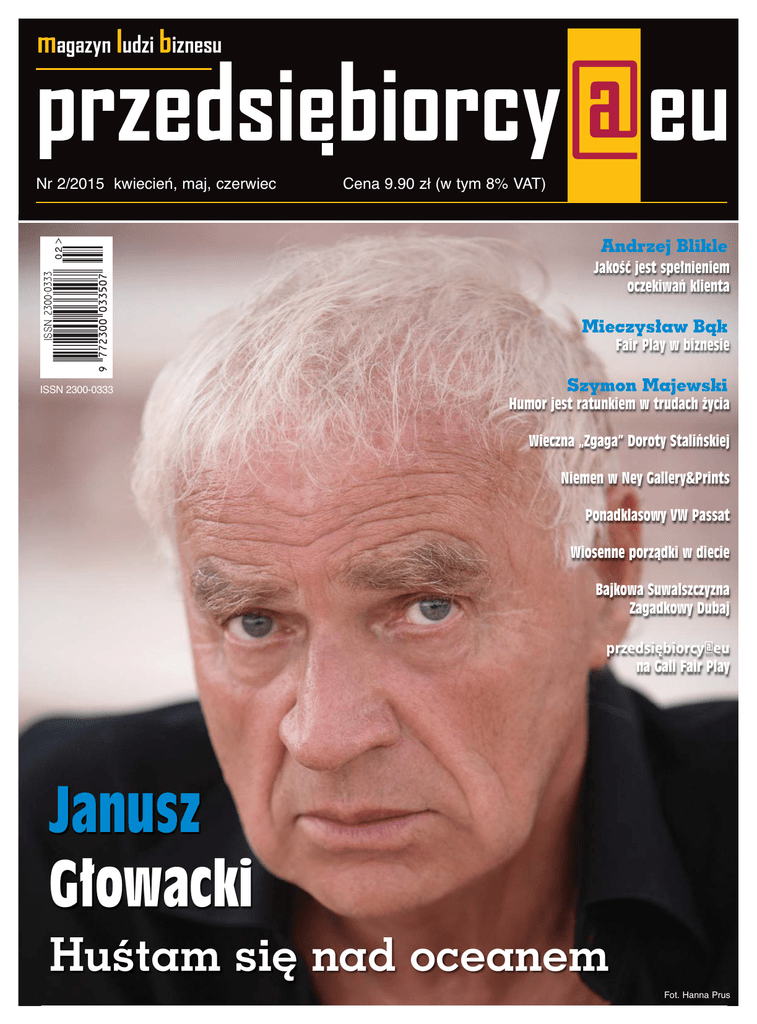 magazyn ludzi biznesu Nr 2/2015 kwiecień, maj, czerwiec Cena 9.90 zł (w tym 8% VAT) Andrzej Blikle Jakość jest spełnieniem oczekiwań klienta Mieczysław Bąk Fair Play w biznesie ISSN 2300-0333 Szymon Majewski Humor jest ratunkiem w trudach życia Wieczna „Zgaga” Doroty Stalińskiej Niemen w Ney Gallery&Prints Ponadklasowy VW Passat Wiosenne porządki w diecie Bajkowa Suwalszczyzna Zagadkowy Dubaj przedsiębiorcy@eu na Gali Fair Play Janusz Głowacki Huśtam się nad oceanem Fot. Hanna Prus W numerze: Szanowni Państwo, 4 TWARZE BIZNESU - Andrzej Blikle „Jakość jest spełnieniem oczekiwań klienta” - Andrzej Bartkowski „Forum Humanum Mazurkas – projekty jakich wciąż mało” - Marcin Zapędowski „Okręt na wzburzonym morzu” 10 OSOBOWOŚĆ NUMERU - Janusz Głowacki „Huśtam się nad oceanem” 12 BIZNES I GOSPODARKA - Fundusze europejskie na lata 2014-2020 coraz bliżej - Fair Play w biznesie - Wiele firm gra fair play - Standardy mamy światowe - Biznes Made In China 22 Z SZUFLADY EKSPERTA - Finansowanie: w leasingu czy na kredyt? - Niewiedza finansowa to strata czasu i pieniędzy - Ochrona danych osobowych a przedsiębiorca - Czas na fotowoltaikę - Content is King – o sile treści w reklamie - Jak networking wspiera rozwój biznesu – poziom 4 - Aplikacje są wśród nas - Przemiany osobiste i rozwój 38 W DOBRYM STYLU - W stadzie siła - Makijaż biznesowy - Poznajcie się, czyli formy przedstawiania osób w biznesie - Alzacja – kolebka białych win - W gorącej wodzie Company - Wiosenna aranżacja balkonu - Genewa w dyszy samochodu - IV generacja Doblò – dla firmy i dla rodziny - Ekskluzywna karta Maserati od Lion’s Bank - Te auta kochają złodzieje - Ponadklasowy VW Passat - Kia Optima – upiększa segment D - Peugeot 508 – charakter lwa - Mitsubishi ASX – uniwersalny crossover - Toyota Auris – kompakt idealny 58 KULTURA NA WIDELCU - Humor jest ratunkiem w trudach życia - Niemen w Ney Gallery & Prints - Plener musi mieć formę - Dlaczego warto inwestować w sztukę? - Wieczna „Zgaga” - Subiektywny Przegląd Kulturalny 70 ZDROWIE I URODA - Pracować i dbać o formę - Wiosenne porządki w diecie – jak się do nich zabrać? - Nauka w służbie włosa - Futro z norek na rzęsach - Wychodzenie z cienia - HCV – a co to? 84 TURYSTYKA I WYPOCZYNEK - Dziesięć mitów o Dubaju - Suwalszczyzna – kraina jak baśń Redakcja: ul. Kaliska 17 lok. 42, 02-316 Warszawa tel. 501 243 876 e-mail: [email protected], www.efp.biz.pl Redaktor naczelny: Barbara Jończyk Redaktor prowdząca: Aneta Sienicka Zespół redakcyjny: Izabela Włodarczyk, Izabella Jarska, Krystyna Zbylut, Krzysztof Jończyk, Rafał Korzeniewski, Dora Rosłońska, Paulina Bocheńska DTP i druk: MaxMedia, ul. Estrady 67, 01-932 Warszawa, tel. 22 832 42 51 [email protected] www.maxmedia.org.pl Kontakt w sprawie reklamy: Barbara Jończyk, tel. 501 243 876 Korekta: Dominika Dziurdzikowska Bieżący rok będzie obfitował w istotne dla Polski wydarzenia polityczne, jakimi będą wiosenne wybory prezydenckie oraz jesienią – parlamentarne. Zdecydujemy wtedy w czyje ręce oddamy ster państwa na najbliższe lata, co zapewne nie pozostanie bez wpływu na życie wszystkich obywateli. Jednak nie tylko polityka krajowa będzie nas w tym roku zaprzątała. Wydarzenia na sąsiadującej z nami Ukrainie oraz kierunek, w jakim się one rozwiną mogą budzić nasze obawy, ale też nadzieje, że ten rok przyniesie być może pokojowe rozwiązanie istniejącego tam konfliktu. Jednak polityka, zarówno międzynarodowa, jak i krajowa, chociaż ma ona wpływ także na gospodarkę a przez to na życie przeciętnego obywatela, nie są jedynym co może nas zajmować. Drobne radości życia także mają przecież ogromne znaczenie. Dlatego cieszmy się wspólnie, że świat wokół nas rozkwitł wiosennie. Zapowiada to bowiem miły czas, kiedy możemy, już bez przeszkód cieszyć się urodą natury. Zaś w wiosennym wydaniu naszego magazynu szczególnie polecam Państwu wywiady. Nasi rozmówcy to osoby nieszablonowe, wybitne jednostki w swoich dziedzinach, ludzie ogromnie interesujący i z dorobkiem wartym szacunku. Nasz wywiad okładkowy tym razem został przeprowadzony ze znanym na całym świecie pisarzem, dramaturgiem i scenarzystą, odnoszącym olbrzymie sukcesy w Stanach Zjednoczonych, a w Polsce będącym wręcz legendą, czyli z Januszem Głowackim. Jest on szczególnie wart polecenia, ze względu na to, że Janusz Głowacki wywiadów w ostatnich latach udziela niechętnie. Czujemy się zatem zaszczyceni tym, że dla nas zrobił wyjątek. A skoro wiosna, polecam też wiele ciekawych artykułów, dzięki którym przygotujemy nasz umysł i ciało na nowe okoliczności przyrody. Dla tych, którzy myślą już o wakacjach mamy ciekawe propozycje na wypoczynek w kraju i zagranicą. Ci, którzy będą chcieli udać się w podróż autem, a wcześniej zamienić obecne na nowe, może przypadnie do gustu jeden z prezentowanych przez nas modeli, a jest w czym wybierać... Życzę Państwu miłej lektury naszego magazynu i mam nadzieję, że spełni on Wasze oczekiwania. Barbara Jończyk wydawca i redaktor naczelna magazynu „przedsiębiorcy@eu” 90 WYDARZENIA - Wielka Gala „Przesiębiorstwo Fair Play” 2014 - 25 lat Krajowej Izby Gospodarczej - Sztuka wśród przedsiębiorców - „Moda na tolerancję” - Gwiazdy na gwiazdkę - La perla w krakowskim Holiday Inn - Charytatywna choinka - Trzy kolory Krajewskich - Poruszenie - „Piękno wewnętrzne jest nieśmiertelne” - Walentynkowy bal - Polskie firmy docenione - Szepty Janusza Lewandowskiego - Benefis Romana Kłosowskiego - „Postrzeganie” Marcina Painty - Niezwykłe spotkanie po 50ce - Libańskie smaki w Le Cedre - O inwestowaniu on-line 104 AKADEMIA DOBREGO SMAKU - Mistrz poleca 106 WARSZAWSKIE SPOTKANIA BIZNESOWE Wydawca Europejskie Forum Przedsiębiorczości Sp. z o.o. ul. Kaliska 17 lok. 42 02-316 Warszawa NIP: 701-020-11-00 Numer od
