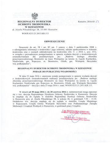 REGIONALNY DYRBKTOR OCHRONY SRODOWISKA W RZESZOWIE Rzesz6w, 2016-05- L) al. Jozefa Pilsudskiego 38, 35-001 Rzesz6w woos.4233.2 1.201 3.KR. 11 3 OBWIESZCZENTE Stosownie do art. 38 i art. 85 ust. 3 ustawy z dnia 3 pu2dziemika 2008 r. o udostEpnianiu informacji o Srodowisku i jego ochronie, udziale spoleczet'rstwa w ochronie Srodowiska oraz o ocenach oddzialywania na Srodowisko (Dz. U. z 2016 r., poz. 353), w zwi4zku z prowadzonym postEpowaniem w sprawie wydania decyzji o Srodowiskowych uwarunkowaniach dla przedsiqwziEcia pn.: ,,Budowa suchego zbiornika przeciwpowodziowego Bronisz6w ra rzece Wielopolce na terenie m. tr qczki Kucharskie, Nied2wiada, gm. Ropczyce, m. Bronisz6w, Glinik, gm. Wielopole Skrzyriskie woj. podkarpackie"; REGIONALNY DYREKTOR OCHRONY SNOPOWISKA W RZESZOWIE PODAJE DO PUBLICZNEJ WIADOMOSCI W dniu 23 maja 2016 r. umorzone zostalo postEpowanie w sprawie wydania decyzji o Srodowiskolvych uwarunkowaniach realizacji przedsiEwziEcia pn.: ,,Budowa suchego zbiornika przeciwpowodziowego Bronisz6w La rzece Wielopolce na terenie m. N,qczki Kucharskie, NiedZwiada, gm. Ropczyce, m. Bronisz6w, Glinik, gm. Wielopole Skrzyriskie woj. podkarpackie" - decyzjazdnia23 maja2016r. znak: WOO5.4233.21.2013.KR.111. W dniach od 30 maja 2016 r. do 20 czerwca 2016 r. zainteresowani mog4 zapoznal sig z ww. decyzjq Regionalnego Dyrektora Ochrony Srodowiska w Rzeszowie. Decyzja ta znajduje sig do wgl4du w siedzibie Regionalnej Dyrekcji Ochrony Srodowiska w Rzeszowie przy aL. J6zefa Pilsudskiego 38, w pokoju 46, w godzinach 7.30 - 15.30. Dodatkowo ww. decyzja znajduje siQ do wglqdu w siedzibie UrzEdu Miejskiego w Ropczycach, Urzgdu Gminy Wielopole Skrzyriskie oraz Podkarpackiego Zarzqdu Melioracji iUrzqdzeh Wodnych w Rzeszowie, w godzinach pracy Urzgd6w. M Z+ak Otrzfmuia: poatarpacki ZarzqdMelioracji ilJrzqdzeirWodnych w Rzeszowie, ul. Hetmariska 9, 35-959 Rzesz6w fi Urz4a Ir4iejski w liopczycach, ul. Krisego l, 39-100 Ropczycg oraz Inwestor z proSb4o powiadomienie 2i jego ochronie, udziale spoleczeristwa ,godni. t utt. Zt ustawy o udostgpnianiu informacji o Srodowisku i Srodowisko na spoleczefsrwa w ochronie Srodowiska orM o ocenach oddziatywania o powiadomienie 3) Urz4d Gminy Wielopole Skrzyrlskie, 39-ll0 Wielopole Skrzyriskiez proSbq jego ochronie, udziale i Srodowisku o informacji udostEpnianiu spoleczerlstwa zgodnie z art.18 ustawy o Srodowisko na oddzialywania o ocenach oraz spoleczefrsrwa w ochronie Srodowiska !voos.4233.2 1.20 I 3.KR. I I 3 Str.2 z2
