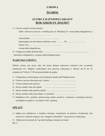 UMOWA ŻŁOBEK ELFIKI Z BAŚNIOWEJ KRAINY ROK SZKOLNY 2016/2017 1) Umowa zostaje zawarta między: Elfiki z Baśniowej Krainy z siedzibą przy ul. Młyńskiej 25 zwaną dalej usługodawcą a …………………………………….., zamieszkałą:………………………………….., legitymującą się dowodem osobistym: seria: ………. Nr: ……………………, Numer Tel.:……………………………………….. zwaną dalej usługobiorcą. 2) Usługą jest opieka dzienna nad:……………………......................................................, dzieckiem usługobiorcy, zwanym dalej Podopiecznym. WARUNKI UMOWY: Żłobek czynny jest przez cały rok (poza dniami ustawowo wolnymi oraz wcześniej ustalonymi tzw. długimi weekendami oraz przerwą wakacyjną w okresie od 01 do 16 sierpnia) od 7.00 do 17.00 od poniedziałku do piątku. 1) Usługodawca zobowiązuje się do pełnienia opieki nad Podopiecznym. 2) Umowa zaczyna obowiązywać z dniem …………………....................... 3) Termin zakończenia umowy: ……………………………………… 4) Strony ustaliły stałe dni opieki: ........................................................... 5) Strony ustaliły stałe godziny opieki: ….................................................... 6) Strony ustaliły stałą cenę usługi w wysokości: ………………………… 7) Dodatkowe dni i godziny sprawowanej opieki, ponad te, wskazane w niniejszej umowie są dodatkowo płatne w wysokości 10zł / godzinę. OPŁATY 1) Opłata jest jednakowa w każdym miesiącu, niezależnie od przerwy świątecznej, dni ustawowo wolnych od pracy oraz „długich weekendów” oraz przerwy wakacyjnej. 2) Opłata jest uiszczana do 5 go dnia każdego miesiąca na konto: str. 1 Elfiki z Baśniowej Krainy Ewa Wróblewska 43-300 Bielsko-Biała, ul. Bohaterów Warszawy 17/2 ING BANK ŚLĄSKI 91 1050 1070 1000 0090 9171 9428 3) Wpisowe jest jednorazową, bezzwrotną opłatą, z której opłaca się min. ubezpieczenie od nieszczęśliwych wypadków. 4) Stronom przysługuje prawo do wcześniejszego rozwiązania umowy, a co za tym idzie zakończenia współpracy. Okres wypowiedzenia: 1 miesiąc z zastrzeżeniem, że okres ten rozpoczyna się od 1-go następnego miesiąca. Opłata za ten miesiąc stanowi 100% wykupionego abonamentu, bez możliwości zmniejszenia – dotyczy również dotacji. W miesiącu wypowiedzenia kwota abonamentu nie jest pomniejszana o kwotę dotacji. 5) Stronom przysługuje prawo do natychmiastowego rozwiązania umowy w sytuacji: rażącego nie wywiązania się z warunków umowy rażącego zaniedbania Podopiecznego innych rażących zachowań, ogólnie przyjętych jako naganne DOFINANSOWANIE 1) W momencie otrzymania w/w dofinansowania nie przysługuje zwrot za nieobecność dziecka w danym miesiącu. 2) Dofinansowanie przysługuje tylko i wyłącznie dzieciom uczęszczającym na abonament. 3) Dzieciom zapisanym na karnet dofinansowanie nie przysługuje. NIEOBECNOŚCI 1) Dzieciom otrzymującym dofinansowanie nie przysługuje zwrot za nieobecność. 2) W razie nieobecności dziecka uczęszczającego w sposób nieregularny (karnety) nie ma możliwości przesuwania/zamieniania tych dni. Usługobiorca zobowiązuje się do przestrzegania dni ustalonych przy podpisywaniu umowy. 3) Istnieje możliwość zmiany abonamentu, jednakże nie częściej niż 2 razy w roku szkolnym. Zmniejszenie abonamentu nie może przekraczać 150 zł. 4) Okres rozliczeniowy: od 01 do ostatniego dnia miesiąca. str. 2 WYŻYWIENIE Placówka gwarantuje obiad z cateringu (śniadanie i podwieczorki we własnym zakresie). Śniadanie 2,50 zł. ( opcjonalnie) Zupa 2,00zł II danie 3,30zł + kompot Podwieczorek 2,20 zł. (opcjonalnie) Pełne wyżywienie: 10 zł. Opłata ta pomnożona jest przez ilość dni pobytu dziecka w Placówce w danym miesiącu i naliczana jest wstecz np. za lipiec w sierpniu itd. WYSOKOŚĆ ABONAMENTÓW: Od września 2016 r. obowiązują następujące abonamenty: 1) Kwoty bez dofinansowania: do 6 godzin do 7 godzin do 8 godzin do 9 godzin do 10 godzin do 11 godzin 550zł 600zł 650zł 750zł 850zł 950zł Do kwoty abonamentu doliczane są kwoty za dodatkowe zajęcia wcześniej ustalone z rodzicami. Ceny w/w zajęć ustalane są wg cennika na dany rok szkolny. Placówka zastrzega sobie prawo do zmiany wysokości wpisowego oraz opłaty stałej w trakcie trwania umowy. W przypadku nie dającej się przewidzieć w dniu zawarcia umowy zmiany stosunków gospodarczych (m.in. wysoka inflacja, znaczny wzrost opłat związanych z utrzymaniem placówki). O zmianie tej należy powiadomić rodziców/opiekunów dziecka z jednomiesięcznym wyprzedzeniem. REZERWACJA MIEJSCA Istnieje możliwość rezerwacji miejsca w Żłobku. Można tego dokonać po wcześniejszym podpisaniu umowy oraz bezzwrotnego wpisowego. W razie rezygnacji kwota wpisowego nie podlega zwrotowi. str. 3 ZAKRES OBOWIĄZKÓW 1) Usługodawca zobowiązuje się do zapewnienia Podopiecznemu odpowiedniej opieki pielęgnacyjnej ( wg. wskazówek usługobiorcy ), w czasie sprawowanej nad Nim opieki. 2) Usługodawca ma obowiązek zadbać o odpowiedni rozwój Podopiecznego, w czasie sprawowanej nad Nim opieki. 3) Usługodawca ma obowiązek dbania o bezpieczeństwo Podopiecznego, w czasie sprawowanej nad Nim opieki. 4) Usługodawca nie może podawać Podopiecznemu żadnych środków medycznych, bez konsultacji i wyraźnego zezwolenia usługobiorcy, jednak w razie zagrożenia życia, zobowiązuje się dołożyć wszelkich starań do Jego ratowania. 5) Usługodawca zastrzega sobie prawo, do odmowy wykonania czynności, w stosunku do podopiecznego, jeśli są one sprzeczne z ogólnie przyjętymi normami moralnymi i prawnymi, oraz jeśli pozostają w sprzeczności wobec zasad moralnych usługodawcy. 6) Usługodawca odmówi przekazania opieki nad Podopiecznym osobom trzecim, bez uprzedniej zgody usługobiorcy (karta zgłoszenia dziecka). 7) Usługobiorca zobowiązuje się do