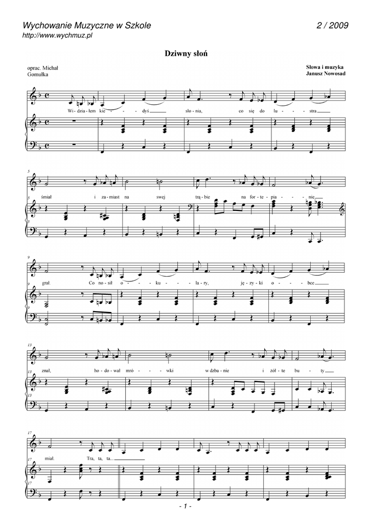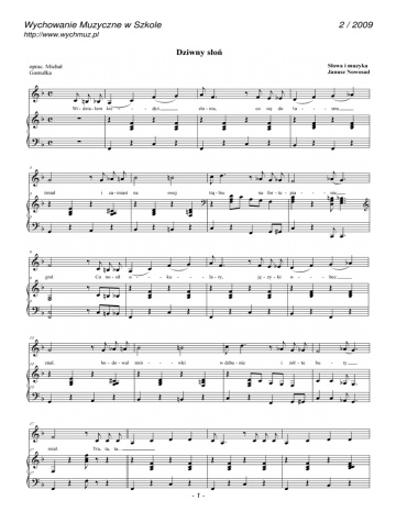 Wychowanie Muzyczne w Szkole 2 / 2009 http://www.wychmuz.pl 1 Wychowanie Muzyczne w Szkole 2 / 2009 http://www.wychmuz.pl Widziałem kiedyś słonia, co się do lustra śmiał i zamiast na swej trąbie na fortepianie grał. Na obiad jadał gruszki i mleko kwaśne pił, gdy deszcz na dworze padał, słoń parasole szył. Co nosił okulary, języki obce znał, hodował mrówki w dzbanie i żółte buty miał. Rowerem jeździł w piątki, w bamboszach zawsze spał, a wpół do piątej rano kapelusz w smole prał. Tra, ta, ta, ta, ta… Tra, ta, ta, ta, ta… Przyznacie, drogie dzieci, że zwierz to dziwny był. A wiecie, skąd go znałem? W mej wyobraźni żył. Jak chcecie słonia spotkać i ujrzeć chociaż raz, zamknijcie tylko oczy, mój słoń odwiedzi Was. Tra, ta, ta, ta, ta… 2