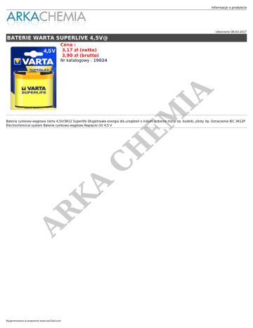Informacje o produkcie Utworzono 08-03-2017 BATERIE WARTA SUPERLIVE 4,5V@ Cena : 3,17 zł (netto) 3,90 zł (brutto) H EM IA Nr katalogowy : 19024 AR K A C Bateria cynkowo-węglowa Varta 4,5V/3R12 Superlife Długotrwała energia dla urządzeń o niskim poborze mocy np. budziki, piloty itp. Oznaczenie IEC 3R12P Electrochemical system Baterie cynkowo-węglowe Napięcie (V) 4,5 V Wygenerowano w programie www.oscGold.com