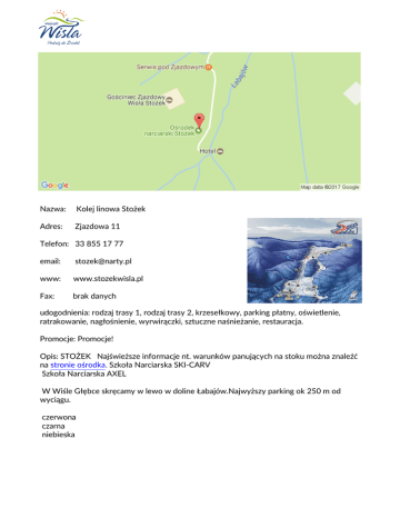 Nazwa: Kolej linowa Stożek Adres: Zjazdowa 11 Telefon: 33 855 17 77 email: [email protected] www: www.stozekwisla.pl Fax: brak danych udogodnienia: rodzaj trasy 1, rodzaj trasy 2, krzesełkowy, parking płatny, oświetlenie, ratrakowanie, nagłośnienie, wyrwirączki, sztuczne naśnieżanie, restauracja. Promocje: Promocje! Opis: STOŻEK Najświeższe informacje nt. warunków panujących na stoku można znaleźć na stronie ośrodka. Szkoła Narciarska SKI-CARV Szkoła Narciarska AXEL W Wiśle Głębce skręcamy w lewo w doline Łabajów.Najwyższy parking ok 250 m od wyciągu. czerwona czarna niebieska