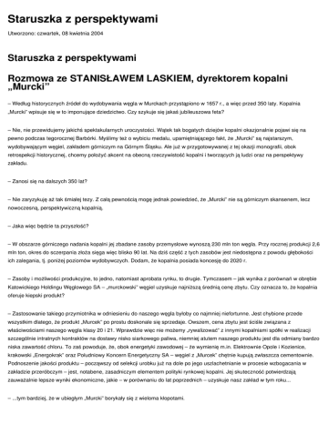 Staruszka z perspektywami Utworzono: czwartek, 08 kwietnia 2004 Staruszka z perspektywami Rozmowa ze STANISŁAWEM LASKIEM, dyrektorem kopalni „Murcki” – Według historycznych źródeł do wydobywania węgla w Murckach przystąpiono w 1657 r., a więc przed 350 laty. Kopalnia „Murcki” wpisuje się w to imponujące dziedzictwo. Czy szykuje się jakaś jubileuszowa feta? – Nie, nie przewidujemy jakichś spektakularnych uroczystości. Wątek tak bogatych dziejów kopalni okazjonalnie pojawi się na pewno podczas tegorocznej Barbórki. Myślimy też o wybiciu medalu, upamiętniającego fakt, że „Murcki” są najstarszym, wydobywającym węgiel, zakładem górniczym na Górnym Śląsku. Ale już w przygotowywanej z tej okazji monografii, obok retrospekcji historycznej, chcemy położyć akcent na obecną rzeczywistość kopalni i tworzących ją ludzi oraz na perspektywy zakładu. – Zanosi się na dalszych 350 lat? – Nie zaryzykuję aż tak śmiałej tezy. Z całą pewnością mogę jednak powiedzieć, że „Murcki” nie są górniczym skansenem, lecz nowoczesną, perspektywiczną kopalnią. – Jaka więc będzie ta przyszłość? – W obszarze górniczego nadania kopalni jej zbadane zasoby przemysłowe wynoszą 230 mln ton węgla. Przy rocznej produkcji 2,6 mln ton, okres do sczerpania złoża sięga więc blisko 90 lat. Na dziś część z tych zasobów jest niedostępna z powodu głębokości ich zalegania, tj. poniżej poziomów wydobywczych. Dodam, że kopalnia posiada koncesję do 2020 r. – Zasoby i możliwości produkcyjne, to jedno, natomiast aprobata rynku, to drugie. Tymczasem – jak wynika z porównań w obrębie Katowickiego Holdingu Węglowego SA – „murckowski” węgiel uzyskuje najniższą średnią cenę zbytu. Czy oznacza to, że kopalnia oferuje kiepski produkt? – Zastosowanie takiego przymiotnika w odniesieniu do naszego węgla byłoby co najmniej niefortunne. Jest chybione przede wszystkim dlatego, że produkt „Murcek” po prostu doskonale się sprzedaje. Owszem, cena zbytu jest ściśle związana z właściwościami naszego węgla klasy 20 i 21. Wprawdzie więc nie możemy „rywalizować” z innymi kopalniami spółki w realizacji szczególnie intratnych kontraktów na dostawy nisko siarkowego paliwa, niemniej atutem naszego produktu jest dla odmiany bardzo niska zawartość chloru. To zaś powoduje, że, obok energetyki zawodowej – że wymienię m.in. Elektrownie Opole i Kozienice, krakowski „Energokrak” oraz Południowy Koncern Energetyczny SA – węgiel z „Murcek” chętnie kupują zwłaszcza cementownie. Podnoszenie jakości produktu – począwszy od selekcji urobku już na dole po jego uszlachetnianie w procesie wzbogacania w zakładzie przeróbczym – jest, notabene, zasadniczym elementem polityki rynkowej kopalni. Jej skuteczność potwierdzają zauważalnie lepsze wyniki ekonomiczne, jakie – w porównaniu do lat poprzednich – uzyskuje nasz zakład w tym roku... – ...tym bardziej, że w ubiegłym „Murcki” borykały się z wieloma kłopotami. – Jak to w górnictwie, natura zaskoczyła nas przykrymi niespodziankami. Natrafiliśmy na rozmaite zaburzenia: nieprzewidywane uskoki, pojawienie się metanu w nadspodziewanie wysokim nasileniu... – Wspomniał pan o nowoczesności „staruszki”. – Nieprzypadkowo. „Murcki”, abstrahując od imponującej metryki, są dziś kopalnią, wyposażoną w bardzo wyrafinowany sprzęt. Zwłaszcza w ostatnich dziesięciu latach zakład wzbogacił się o najnowocześniejsze urządzenia urabiające, odstawcze i transportowe. Gruntownym modernizacjom został zarazem poddany zakład przeróbczy i maszyny wyciągowe. – Wydobycie w „Murckach” biegnie na dwóch poziomach... – Tak. Zasadniczym jest poziom 416. Zarazem eksploatację prowadzimy również na poziomie 600. Regularnie fedrujemy dwoma ścianami z trzecią uzupełniającą. W ubiegłym roku proporcja była taka: przez 7 miesięcy produkcja biegła dwoma ścianami, zaś przez 5 – „sypały” trzy. W tym roku odmiennie: 3 ściany przez 7 miesięcy i 2 – przez 5 miesięcy. Dodam, że po czterech miesiącach br. wydajność dołowa w „Murckach”, liczona w urobku węglowym, wyniosła 8330 kg na roboczodniówkę i jest to rezultat o 16 proc. lepszy od średniej w kopalniach KHW SA. – Skoro mowa o przyszłości kopalni, to niepodobna nie wspomnieć o prowadzonych w niej inwestycjach. – Koncentrują się one głównie na zakończeniu zadania inwestycyjnego pn. „Szyb „Zygmunt”” oraz drążeniu wyrobisk udostępniających pokłady 334/2 i 349 w polu F na poziomie 600. Sięgnięcie do zasobów w nowym polu jest dla „Murcek” przyszłościowym przedsięwzięciem, albowiem otwiera perspektywę co najmniej 10 lat eksploatacji. Pierwsza ściana w tym polu zostanie uruchomiona pod koniec I kwartału przyszłego roku. – W rok później ma dojść do połączenia podziemnymi wyrobiskami „Murcek” ze „Staszicem”. Czy łączy się to z przymiarkami do utworzenia jednolitego centrum wydobywczego? – Jest to sfera decyzji, należąca do przedsiębiorcy, czyli zarządu KHW SA. Ale oprócz organizacyjnego dołowe połączenie ze „Staszicem” ma również istotny wymiar górniczy i technologiczny. Spowoduje, że wybieranie grupy nowo udostępnionych pokładów w polu F nie będzie przebiegało podpoziomowo, czyli poniżej poziomu udostępnienia. Ma to szczególne znaczenie dla systemu wentylacji i bezpieczeństwa pracowników. – Załoga „Murcek” może więc być spokojna o swoją przyszłość? – Na pewno powodzenie kopalni łączy się z indywidualnym powodzeniem jej pracowników. „Murcki” zatrudniają prawie 3 tys. osób. To doskonała, pracowita, odpowiedzialna i identyfikująca się z zakładem załoga. Dodam, że jesteśmy zainteresowani wzrostem zatrudnienia. Od początku roku do końca maja już przyjęliśmy 96 osób, a do końca roku chcielibyśmy zaangażować do pracy pod zi