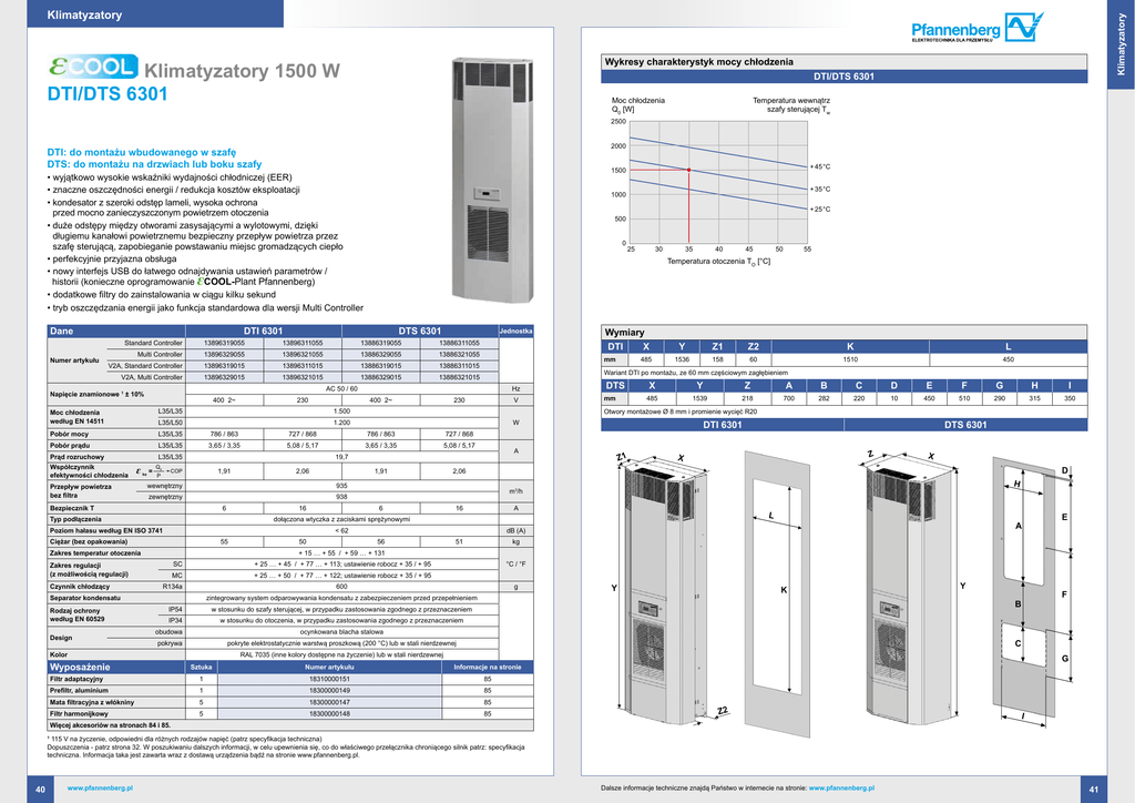 Klimatyzatory Klimatyzatory Wykresy charakterystyk mocy chłodzenia Klimatyzatory 1500 W DTI/DTS 6301 DTI / DTS 9341 DTI/DTS 6301 Moc chłodzenia Kühlleistung Q0 [W] [W] Q Temperatura wewnątrz Schaltschrankszafy sterującej T Innentemperatur Twi 2500 2000 DTI: do montażu wbudowanego w szafę DTS: do montażu na drzwiach lub boku szafy + 45 °C 1500 • wyjątkowo wysokie wskaźniki wydajności chłodniczej (EER) • znaczne oszczędności energii / redukcja kosztów eksploatacji • kondesator z szeroki odstęp lameli, wysoka ochrona przed mocno zanieczyszczonym powietrzem otoczenia • duże odstępy między otworami zasysającymi a wylotowymi, dzięki długiemu kanałowi powietrznemu bezpieczny przepływ powietrza przez szafę sterującą, zapobieganie powstawaniu miejsc gromadzących ciepło • perfekcyjnie przyjazna obsługa • nowy interfejs USB do łatwego odnajdywania ustawień parametrów / historii (konieczne oprogramowanie COOL-Plant Pfannenberg) • dodatkowe filtry do zainstalowania w ciągu kilku sekund • tryb oszczędzania energii jako funkcja standardowa dla wersji Multi Controller + 35 °C 1000 + 25 °C 500 0 25 30 Numer artykułu DTI 6301 DTS 6301 13896311055 13886319055 13886311055 Multi Controller 13896329055 13896321055 13886329055 13886321055 V2A, Standard Controller 13896319015 13896311015 13886319015 13886311015 V2A, Multi Controller 13896329015 13896321015 13886329015 13886321015 400 2~ 230 L35/L35 786 / 863 727 / 868 Pobór prądu L35/L35 3,65 / 3,35 5,08 / 5,17 Prąd rozruchowy L35/L35 ε ke = Przepływ powietrza bez filtra Q0 P 1,91 ➛COP 2,06 727 / 868 3,65 / 3,35 5,08 / 5,17 935 zewnętrzny 938 6 16 A 55 Y Z A mm 1250 485 1539 218 700 Z1 0 50 56 + 25 … + 45 / + 77 … + 113; ustawienie robocz + 35 / + 95 MC + 25 … + 50 / + 77 … + 122; ustawienie robocz + 35 / + 95 51 w stosunku do szafy sterującej, w przypadku zastosowania zgodnego z przeznaczeniem w stosunku do otoczenia, w przypadku zastosowania zgodnego z przeznaczeniem obudowa ocynkowana blacha stalowa pokrywa pokryte elektrostatycznie warstwą proszkową (200 °C) lub w stali nierdzewnej F G H I 282 220 10 450 510 290 315 350 + 45 °C DTS 6301 X 25 X 30 35 40 45 Z + 25X°C Z 50 X D H 55 Umgebungstemperatur TU [°C] E DTI / DTS 9141 Y Y Kühlleistung Q0 [W] SchaltschrankK Innentemperatur Ti 1750 Y Y F B 1500 C 1250 RAL 7035 (inne kolory dostępne na życzenie) lub w stali nierdzewnej Numer artykułu E A g IP34 Sztuka D L °C / °F IP54 Wyposażenie C kg zintegrowany system odparowywania kondensatu z zabezpieczeniem przed przepełnieniem Kolor B + 35 °C A 600 Separator kondensatu L 450 dB (A) SC R134a K 1510 DTI 6301 Z1 + 15 … + 55 / + 59 … + 131 Zakres regulacji (z możliwością regulacji) Informacje na stronie Filtr adaptacyjny 1 18310000151 85 Prefiltr, aluminium 1 18300000149 85 Mata filtracyjna z włókniny 5 18300000147 85 Filtr harmonijkowy 5 18300000148 85 Więcej akcesoriów na stronach 84 i 85. 115 V na życzenie, odpowiedni dla różnych rodzajów napięć (patrz specyfikacja techniczna) Dopuszczenia - patrz strona 32. W poszukiwaniu dalszych informacji, w celu upewnienia się, co do właściwego przełącznika chroniącego silnik patrz: specyfikacja techniczna. Informacja taka jest zawarta wraz z dostawą urządzenia bądź na stronie www.pfannenberg.pl. www.pfannenberg.pl X 500 2,06 16 SchaltschrankInnentemperatur Ti DTS 250 < 62 Zakres temperatur otoczenia 40 Z2 dołączona wtyczka z zaciskami sprężynowymi Ciężar (bez opakowania) 1 Z1 750 m3/h 6 Y Otwory montażowe Ø 8 mm i promienie wycięć R20 1000 W 786 / 863 1,91 wewnętrzny Poziom hałasu według EN ISO 3741 Design V 19,7 Bezpiecznik T Rodzaj ochrony według EN 60529 230 1.200 Typ podłączenia Czynnik chłodzący Q0 [W] 1.500 L35/L50 55 mm 485 1536 158 60 1750 Wariant DTI po montażu, ze 60 mm częściowym zagłębieniem 1500 Hz 400 2~ Pobór mocy Współczynnik efektywności chłodzenia Kühlleistung DTI X AC 50 / 60 L35/L35 50 Wymiary Jednostka 13896319055 Moc chłodzenia według EN 14511 45 DTI / DTS 9241 Standard Controller Napięcie znamionowe 1 ± 10% 40 O ε Dane 35 Umgebungstemperatur [°C] Temperatura otoczenia TTU[°C] G 1000 750 + 45 °C + 35 °C 500 Z2 250 0 25 30 35 Z2 40 + 25 °C 45 50 I 55 Umgebungstemperatur TU [°C] Dalsze informacje techniczne znajdą Państwo w internecie na stronie: www.pfannenberg.pl 41