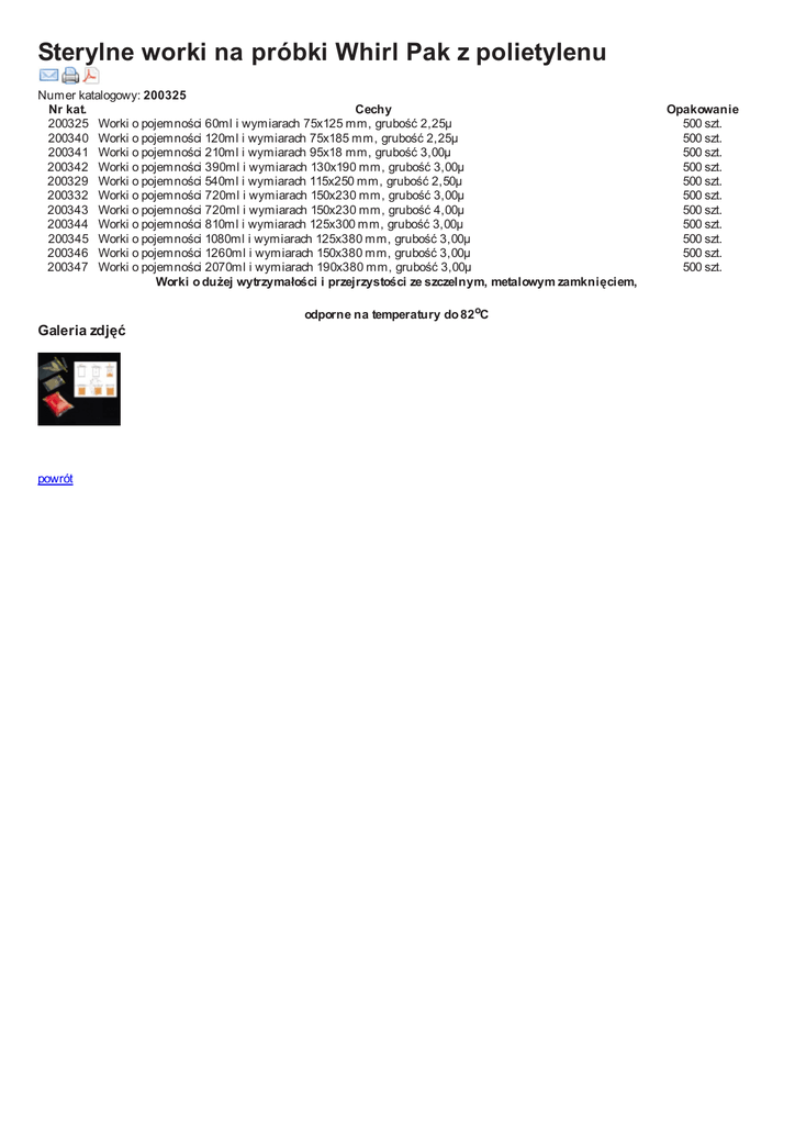 Sterylne worki na próbki Whirl Pak z polietylenu Numer katalogowy: 200325 Nr kat. Cechy 200325 Worki o pojemności 60ml i wymiarach 75x125 mm, grubość 2,25µ 200340 Worki o pojemności 120ml i wymiarach 75x185 mm, grubość 2,25µ 200341 Worki o pojemności 210ml i wymiarach 95x18 mm, grubość 3,00µ 200342 Worki o pojemności 390ml i wymiarach 130x190 mm, grubość 3,00µ 200329 Worki o pojemności 540ml i wymiarach 115x250 mm, grubość 2,50µ 200332 Worki o pojemności 720ml i wymiarach 150x230 mm, grubość 3,00µ 200343 Worki o pojemności 720ml i wymiarach 150x230 mm, grubość 4,00µ 200344 Worki o pojemności 810ml i wymiarach 125x300 mm, grubość 3,00µ 200345 Worki o pojemności 1080ml i wymiarach 125x380 mm, grubość 3,00µ 200346 Worki o pojemności 1260ml i wymiarach 150x380 mm, grubość 3,00µ 200347 Worki o pojemności 2070ml i wymiarach 190x380 mm, grubość 3,00µ Worki o dużej wytrzymałości i przejrzystości ze szczelnym, metalowym zamknięciem, odporne na temperatury do 82 oC Galeria zdjęć powrót Opakowanie 500 szt. 500 szt. 500 szt. 500 szt. 500 szt. 500 szt. 500 szt. 500 szt. 500 szt. 500 szt. 500 szt.
