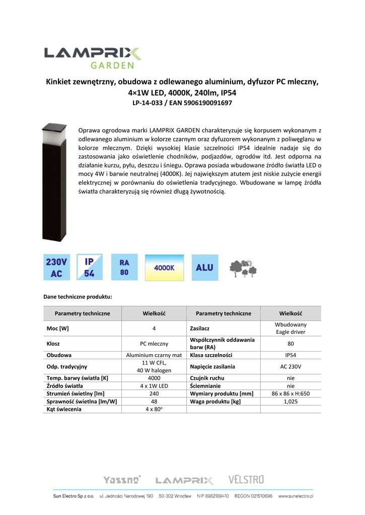 Kinkiet zewnętrzny, obudowa z odlewanego aluminium, dyfuzor PC mleczny, 4×1W LED, 4000K, 240lm, IP54 LP-14-033 / EAN 5906190091697 Oprawa ogrodowa marki LAMPRIX GARDEN charakteryzuje się korpusem wykonanym z odlewanego aluminium w kolorze czarnym oraz dyfuzorem wykonanym z poliwęglanu w kolorze mlecznym. Dzięki wysokiej klasie szczelności IP54 idealnie nadaje się do zastosowania jako oświetlenie chodników, podjazdów, ogrodów itd. Jest odporna na działanie kurzu, pyłu, deszczu i śniegu. Oprawa posiada wbudowane źródło światła LED o mocy 4W i barwie neutralnej (4000K). Jej największym atutem jest niskie zużycie energii elektrycznej w porównaniu do oświetlenia tradycyjnego. Wbudowane w lampę źródła światła charakteryzują się również długą żywotnością. Dane techniczne produktu: Parametry techniczne Moc [W] Klosz Obudowa Odp. tradycyjny Temp. barwy światła [K] Źródło światła Strumień świetlny [lm] Sprawność świetlna [lm/W] Kąt świecenia Wielkość 4 PC mleczny Aluminium czarny mat 11 W CFL, 40 W halogen 4000 4 x 1W LED 240 48 4 x 80o Parametry techniczne Zasilacz Współczynnik oddawania barw (RA) Klasa szczelności Napięcie zasilania Czujnik ruchu Ściemnianie Wymiary produktu [mm] Waga produktu [kg] Wielkość Wbudowany Eagle driver 80 IP54 AC 230V nie nie 86 x 86 x H:650 1,025 Dane logistyczne: Kod EAN Ilość sztuk w opakowaniu jednostkowym [szt] Ilość sztuk w kartonie zbiorczym [szt] Wymiary kartonu jednostkowego [dł x szer x wys] [mm] Wymiary kartonu zbiorczego [dł x szer x wys] [mm] Objętość kartonu jednostkowego [m3] Objętość kartonu zbiorczego [m3] Rysunek techniczny: 5906190091697 1 4 95 x 95 x 660 210 x 210 x 680 0,0060 0,0300