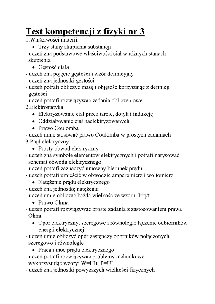 Test kompetencji z fizyki nr 3 1.Właściwości materii: Trzy stany skupienia substancji - uczeń zna podstawowe właściwości ciał w różnych stanach skupienia Gęstość ciała - uczeń zna pojęcie gęstości i wzór definicyjny - uczeń zna jednostki gęstości - uczeń potrafi obliczyć masę i objętość korzystając z definicji gęstości - uczeń potrafi rozwiązywać zadania obliczeniowe 2.Elektrostatyka Elektryzowanie ciał przez tarcie, dotyk i indukcję Oddziaływanie ciał naelektryzowanych Prawo Coulomba - uczeń umie stosować prawo Coulomba w prostych zadaniach 3.Prąd elektryczny Prosty obwód elektryczny - uczeń zna symbole elementów elektrycznych i potrafi narysować schemat obwodu elektrycznego - uczeń potrafi zaznaczyć umowny kierunek prądu - uczeń potrafi umieścić w obwodzie amperomierz i woltomierz Natężenie prądu elektrycznego - uczeń zna jednostkę natężenia - uczeń umie obliczać każdą wielkość ze wzoru: I=q/t Prawo Ohma - uczeń potrafi rozwiązywać proste zadania z zastosowaniem prawa Ohma Opór elektryczny, szeregowe i równoległe łączenie odbiorników energii elektrycznej - uczeń umie obliczyć opór zastępczy oporników połączonych szeregowo i równolegle Praca i moc prądu elektrycznego - uczeń potrafi rozwiązywać problemy rachunkowe wykorzystując wzory: W=UIt; P=UI - uczeń zna jednostki powyższych wielkości fizycznych