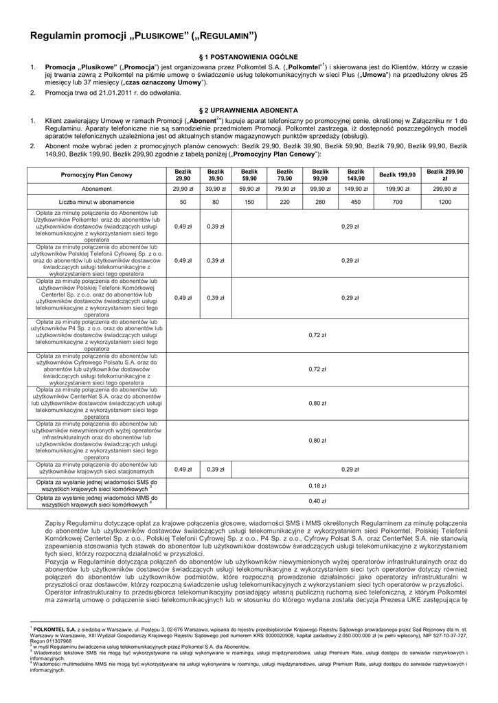 Regulamin promocji „PLUSIKOWE” („REGULAMIN”) § 1 POSTANOWIENIA OGÓLNE 1 1. Promocja „Plusikowe” („Promocja”) jest organizowana przez Polkomtel S.A. („Polkomtel” ) i skierowana jest do Klientów, którzy w czasie jej trwania zawrą z Polkomtel na piśmie umowę o świadczenie usług telekomunikacyjnych w sieci Plus („Umowa") na przedłużony okres 25 miesięcy lub 37 miesięcy („czas oznaczony Umowy”). 2. Promocja trwa od 21.01.2011 r. do odwołania. 1. Klient zawierający Umowę w ramach Promocji („Abonent ”) kupuje aparat telefoniczny po promocyjnej cenie, określonej w Załączniku nr 1 do Regulaminu. Aparaty telefoniczne nie są samodzielnie przedmiotem Promocji. Polkomtel zastrzega, iż dostępność poszczególnych modeli aparatów telefonicznych uzależniona jest od aktualnych stanów magazynowych punktów sprzedaży (obsługi). 2. Abonent może wybrać jeden z promocyjnych planów cenowych: Bezlik 29,90, Bezlik 39,90, Bezlik 59,90, Bezlik 79,90, Bezlik 99,90, Bezlik 149,90, Bezlik 199,90, Bezlik 299,90 zgodnie z tabelą poniżej („Promocyjny Plan Cenowy”): § 2 UPRAWNIENIA ABONENTA 2 Promocyjny Plan Cenowy Bezlik 29,90 Bezlik 39,90 Bezlik 59,90 Bezlik 79,90 Bezlik 99,90 Bezlik 149,90 Bezlik 199,90 Bezlik 299,90 zł Abonament 29,90 zł 39,90 zł 59,90 zł 79,90 zł 99,90 zł 149,90 zł 199,90 zł 299,90 zł Liczba minut w abonamencie 50 80 150 220 280 450 700 1200 0,49 zł 0,39 zł 0,29 zł 0,49 zł 0,39 zł 0,29 zł 0,49 zł 0,39 zł 0,29 zł Opłata za minutę połączenia do Abonentów lub Użytkowników Polkomtel oraz do abonentów lub użytkowników dostawców świadczących usługi telekomunikacyjne z wykorzystaniem sieci tego operatora Opłata za minutę połączenia do abonentów lub użytkowników Polskiej Telefonii Cyfrowej Sp. z o.o. oraz do abonentów lub użytkowników dostawców świadczących usługi telekomunikacyjne z wykorzystaniem sieci tego operatora Opłata za minutę połączenia do abonentów lub użytkowników Polskiej Telefonii Komórkowej Centertel Sp. z o.o. oraz do abonentów lub użytkowników dostawców świadczących usługi telekomunikacyjne z wykorzystaniem sieci tego operatora Opłata za minutę połączenia do abonentów lub użytkowników P4 Sp. z o.o. oraz do abonentów lub użytkowników dostawców świadczących usługi telekomunikacyjne z wykorzystaniem sieci tego operatora Opłata za minutę połączenia do abonentów lub użytkowników Cyfrowego Polsatu S.A. oraz do abonentów lub użytkowników dostawców świadczących usługi telekomunikacyjne z wykorzystaniem sieci tego operatora Opłata za minutę połączenia do abonentów lub użytkowników CenterNet S.A. oraz do abonentów lub użytkowników dostawców świadczących usługi telekomunikacyjne z wykorzystaniem sieci tego operatora Opłata za minutę połączenia do abonentów lub użytkowników niewymienionych wyżej operatorów infrastrukturalnych oraz do abonentów lub użytkowników dostawców świadczących usługi telekomunikacyjne z wykorzystaniem sieci tego operatora Opłata za minutę połączenia do abonentów lub użytkowników krajowych sieci stacjonarnych 0,72 zł 0,72 zł 0,80 zł 0,80 zł 0,49 zł 0,39 zł 0,29 zł Opłata za wysłanie jednej wiadomości SMS do 3 wszystkich krajowych sieci komórkowych 0,18 zł Opłata za wysłanie jednej wiadomości MMS do 4 wszystkich krajowych sieci komórkowych 0,40 zł Zapisy Regulaminu dotyczące opłat za krajowe połączenia głosowe, wiadomości SMS i MMS określonych Regulaminem za minutę połączenia do abonentów lub użytkowników dostawców świadczących usługi telekomunikacyjne z wykorzystaniem sieci Polkomtel, Polskiej Telefonii Komórkowej Centertel Sp. z o.o., Polskiej Telefonii Cyfrowej Sp. z o.o., P4 Sp. z o.o., Cyfrowy Polsat S.A. oraz CenterNet S.A. nie stanowią zapewnienia stosowania tych stawek do abonentów lub użytkowników dostawców świadczących usługi telekomunikacyjne z wykorzysta niem tych sieci, którzy rozpoczną działalność w przyszłości. Pozycja w Regulaminie dotycząca połączeń do abonentów lub użytkowników niewymienionych wyżej operatorów infrastrukturalnych oraz do abonentów lub użytkowników dostawców świadczących usługi telekomunikacyjne z wykorzystaniem sieci tych operatorów dotyczy rów nież połączeń do abonentów lub użytkowników podmiotów, które rozpoczną prowadzenie działalności jako operatorzy infrastrukturalni w przyszłości oraz dostawców, którzy rozpoczną świadczenie usług telekomunikacyjnych z wykorzystaniem sieci tych operatorów w przyszłości. Operator infrastrukturalny to przedsiębiorca telekomunikacyjny posiadający własną publiczną ruchomą sieć telefoniczną, z którym Polkomtel ma zawartą umowę o połączenie sieci telekomunikacyjnych lub w stosunku do którego wydana została decyzja Prezesa UKE zastępuj ąca tę 1 POLKOMTEL S.A. z siedzibą w Warszawie, ul. Postępu 3, 02-676 Warszawa, wpisana do rejestru przedsiębiorców Krajowego Rejestru Sądowego prowadzonego przez Sąd Rejonowy dla m. st. Warszawy w Warszawie, XIII Wydział Gospodarczy Krajowego Rejestru Sądowego pod numerem KRS 0000020908, kapitał zakładowy 2.050.000.000 zł (w pełni wpłacony), NIP 527-10-37-727, Regon 011307968 2 w myśl Regulaminu świadczenia usług telekomunikacyjnych przez Polkomtel S.A. dla Abonentów. 3 Wiadomości tekstowe SMS nie mogą być wykorzystywane na usługi wykonywane w roamingu, usługi międzynarodowe, usługi Premium Rate, usługi dostępu do serwisów rozrywkowych i informacyjnych. 4 Wiadomości multimedialne MMS nie mogą być wykorzystywane na usługi wykonywane w roamingu, usługi międzynarodowe, usługi Premium Rate, usługi dostępu do serwisów rozrywkowych i informacyjnych. umowę. Do operatorów infrastrukturalnych zalicza się m.in. Aero2 Sp. z o.o., Mobyland Sp. z o.o. i Sferia S.A., po połączeniu ruchom ej sieci telekomunikacyjnej tego operatora z siecią Polkomtel 3. 4. Minu