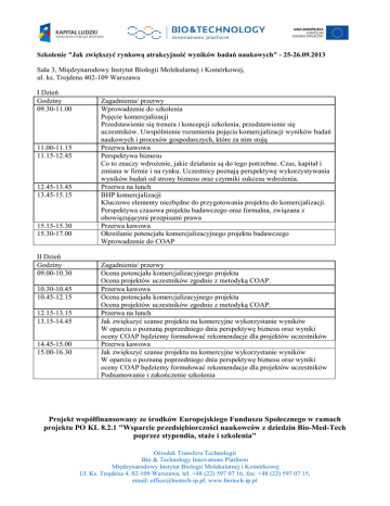 Szkolenie "Jak zwiększyć rynkową atrakcyjność wyników badań naukowych" - 25-26.09.2013 Sala 3, Międzynarodowy Instytut Biologii Molekularnej i Komórkowej, ul. ks. Trojdena 402-109 Warszawa I Dzień Godziny 09.30-11.00 11.00-11.15 11.15-12.45 12.45-13.45 13.45-15.15 15.15-15.30 15.30-17.00 II Dzień Godziny 09.00-10.30 10.30-10.45 10.45-12.15 12.15-13.15 13.15-14.45 14.45-15.00 15.00-16.30 Zagadnienia/ przerwy Wprowadzenie do szkolenia Pojęcie komercjalizacji Przedstawienie się trenera i koncepcji szkolenia, przedstawienie się uczestników. Uwspólnienie rozumienia pojęcia komercjalizacji wyników badań naukowych i procesów gospodarczych, które za nim stoją Przerwa kawowa Perspektywa biznesu Co to znaczy wdrożenie, jakie działania są do tego potrzebne. Czas, kapitał i zmiana w firmie i na rynku. Uczestnicy poznają perspektywę wykorzystywania wyników badań od strony biznesu oraz czynniki sukcesu wdrożenia. Przerwa na lunch BHP komercjalizacji Kluczowe elementy niezbędne do przygotowania projektu do komercjalizacji. Perspektywa czasowa projektu badawczego oraz formalna, związana z obowiązującymi przepisami prawa Przerwa kawowa Określanie potencjału komercjalizacyjnego projektu badawczego Wprowadzenie do COAP Zagadnienia/ przerwy Ocena potencjału komercjalizacyjnego projektu Ocena projektów uczestników zgodnie z metodyką COAP. Przerwa kawowa Ocena potencjału komercjalizacyjnego projektu Ocena projektów uczestników zgodnie z metodyką COAP. Przerwa na lunch Jak zwiększyć szanse projektu na komercyjne wykorzystanie wyników W oparciu o poznaną poprzedniego dnia perspektywę biznesu oraz wyniki oceny COAP będziemy formułować rekomendacje dla projektów uczestników Przerwa kawowa Jak zwiększyć szanse projektu na komercyjne wykorzystanie wyników W oparciu o poznaną poprzedniego dnia perspektywę biznesu oraz wyniki oceny COAP będziemy formułować rekomendacje dla projektów uczestników Podsumowanie i zakończenie szkolenia Projekt współfinansowany ze środków Europejskiego Funduszu Społecznego w ramach projektu PO KL 8.2.1 "Wsparcie przedsiębiorczości naukowców z dziedzin Bio-Med-Tech poprzez stypendia, staże i szkolenia" Ośrodek Transferu Technologii Bio & Technology Innovations Platform Międzynarodowy Instytut Biologii Molekularnej i Komórkowej Ul. Ks. Trojdena 4, 02-109 Warszawa, tel. +48 (22) 597 07 16, fax: +48 (22) 597 07 15, email: [email protected], www.biotech-ip.pl