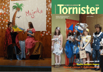 GIMNAZJUM NR 1 Tornister R NIE EGULARNIK GIMNAZJUM NR 1 www.jedynkagim.pl [email protected] Tornister 1 NR4 luty 2013 Tornister R NIE EGULARNIK www.jedynkagim.pl [email protected] Tornister 1 NR4 luty 2013 Jak nam idzie Trudne zadanie Amora Wywiad z panem P. Kołaczkowskim Jak nam idzie Trudne zadanie Amora Wywiad z panem P. Kołaczkowskim Tornister 19 Nieregularnik Spis treści gimnazjum nr 1 Od naczelnego Statystyki Moda ekologiczna Filozoficznie o życiu Walentynki Co to będzie Pasje nauczycieli Rozmowy kontrolowane Japonia Niezwykłe spotkanie Pamiętnik Nastolatki Kącik poezji Opowiadanie porozmawiajmy o książkach recenzja outfit Anna Lewczuk Julia Subocz Oliwia Olech Marta Serkowska Klaudia Antczak Aleksandra Łopińska Karolina Kossowska Julia Madalińska Natalia Ferenc Natalia Żebrowska Pablo Baigorria Kobyliński Radosław Włodarczyk Oliwia Rzepczyńska FotograFie Paula Felton skład Jaciej Makubowski im. Bolesława Chrobrego w Kołobrzegu ul. Portowa 37, 78-100 Kołobrzeg tel. (094) 352 23 82 www.jedynkagim.pl [email protected] Skład redakcji redaktor naczelny Viktoria Juny zespół redakcyjny Ewa Gallon Magdalena Bińczyk Zofia Małaczewska Julia Cherezińska Aleksandra Grzesik Agata Gorączkowska Wiktoria Wesołowska Zuzanna Ziora Sandra Warzocha Olga Araszewska Małgorzata Kulińska Justyna Kosidło Wiktoria Miklejewska opiekunowie: A. Kuliś U. Baniak [email protected] Outfit 3 4 6 7 8 8 9 10 11 12 13 14 15 16 18 19 Zima zagościła u nas na dobre. Noce są jeszcze długie, a dni krótkie. W tym jakże dla wszystkich trudnym czasie uczniowie starają się pokazać z jak najlepszej - „modowej”strony. Zimno nie przeszkadza im w stylowym ubieraniu się. W tym miesiącu naszymi faworytami zostały osoby, które w pełni wykorzystały obecne trendy i nowości. Laura Czeladka, kl. II e Magda: W stroju Laury spodobały mi się modne w tym sezonie legginsy w norweskie wzory. Utrzymane są w ciemnoniebieskiej kolorystyce i idealnie współgrają z białą, luźną podkoszulką. Mimo że za oknem mróz, Laura udowodniła, że t-shirty można nosić również zimą. Ewa: Jednym z najczęściej spotykanym elementem obecnych kolekcji są ubrania wyzłacane cekinami, ćwiekami, dżetami i aplikacjami. Laura ten trend połączyła z ciepłymi, wygodnymi, a jednocześnie modnymi legginsami. Moim zdaniem jest to idealny zimowo-szkolny strój. Kuba Karpiński, kl. III b Magda: Kuba wygląda bardzo dobrze w pasiastym sweterku. Wie, co jest modne tej zimy. Kolorowa góra w połączeniu z czarnymi, prostym spodniami będzie odpowiednia zarówno do szkoły, jak i na spotkanie z przyjaciółmi czy rodzinną uroczystość. Ewa: Tej zimy wśród najmodniejszych kolorów nie zabrakło czerwieni oraz pomarańczu. Kuba typowy sweterek połączył z nieśmiertelną czernią. Magda ma rację, twierdząc, iż ten strój świetnie się komponuje, a Kuba wygląda naprawdę bardzo dobrze. 18 Tornister Tornister 3 Recenzja Na pewno niejeden z Was widział ekranizację powieści "Igrzyska Śmierci" amerykańskiej pisarki, Suzanne Collins. Dziś zajmiemy się recenzją tej właśnie książki. Katniss Everdeen - szesnastoletnia dziewczyna, po śmierci ojca jest zmuszona samodzielnie utrzymywać młodszą siostrę, Primrose, i matkę- głęboko pogrążoną w depresji. Cała akcja dzieje się w bliżej nieokreślonej przyszłości, na terenie dawnej Ameryki w państwie zwanym Panem. W centrum Panem znajduje się Kapitol, który jest obliczem jednej wielkiej burżuazji. Został on otoczony 13 dystryktami, którymi władza kompletnie się nie interesuje, toteż czasy są ciężkie, panuje głód. Po wielkim buncie dystryktów, tak zwana "trzynastka" została zrównana z ziemią, a dystryktów pozostało 12. Na pamiątkę tego wydarzenia co roku organizowane są Igrzyska Głodowe, na które każdy dystrykt jest zmuszony dostarczyć jednego chłopaka oraz jedną dziewczynę w wieku od 12 do 18 roku życia. Do przeczytania książki zachęciło mnie usłyszane gdzieś słowo "antyutopia", więc będzie to wielkie rozczarowanie dla fanów Belli i Edwarda: UWAGA! To nie jest kolejna powieść typu "Zmierzch"! Czytając ten utwór, wielu z Was może się zawieść, ponieważ nie jest to książka, w której ktoś lub coś będzie się mienić w słońcu, nie będzie przypudrowanych nosków i lukrowanych skrzydełek. Tu nie znajdziecie wielkiego love story. Znajdziemy tu natomiast spryt, inteligencję, przebiegłość, które pomogą bohaterom w walce o przetrwanie. Bo o nic innego tu nie chodzi. Dwudziestu czterech tak zwanych "trybutów" zamykanych jest w arenie, by walczyć na śmierć i życie. Kto wygra, ten wraca do domu okryty sławą, w jednym kawałku (chociaż niekiedy z drobnymi urazami) no i cóż: niekoniecznie zdrowy. Dlaczego? Najlepszym przykładem jest tutaj pewien z bohaterów - Haymitch Abernathy - zwycięzca Igrzysk Śmierci, pochodzący z dystryktu dwunastego, czyli z tego, z którego pochodzi również nasza bohaterka, Katniss. Haymitch, chcąc zapomnieć o traumatycznych przeżyciach, popada w alkoholizm, a tego zdrowiem już nie nazwiemy. Powracając do sedna sprawy - recenzji. Książka na przemian wyciska z nas łzy, budzi przerażenie i wprawia w zachwyt, jednocześnie będąc prawdziwą. Sama idea Igrzysk i tego, że np. gdy my jedzenie mamy na wyciągnięcie ręki, tam ludzie muszą się o nie zabijać, wprost piorunuje. Niemożliwe? A jednak. Jeśli mam być szczera, opisy zdarzeń niesamowicie wciągają czytelnika w świat książki, nie pozwalają się oderwać choć na moment, a barwna galeria postaci, od tych zgorzkniałych zarozumialców do przeuroczych (a zarazem niesamowicie sprytnych) dwunastolatek, jest dodatkowym atutem powieści. Tej książki po prostu nie da się zapomnieć! Warto pamiętać, że kiedy po nią sięgamy, nie będzie nam dane zetknąć się z płytką fabułą. Nie, nie i jeszcze raz nie, nigdy! Ciekawa przygoda, ważne przesłanie oraz trzymająca w 