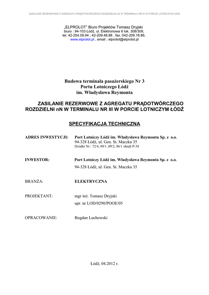 ZASILANIE REZERWOWE Z AGREGATU PRĄDOTWÓRCZEGO ROZDZIELNI nN W TERMINALU NR III W PORCIE LOTNICZYM ŁÓDŹ „ELPROLOT” Biuro Projektów Tomasz Dryjski biuro : 94-103 Łódź, ul. Elektronowa 6 lok. 308/309, tel. 42-254.09.94 ; 42-209.48.88 , fax. 042-209.18.86, www.elprolot.pl , email : [email protected] Budowa terminala pasażerskiego Nr 3 Portu Lotniczego Łódź im. Władysława Reymonta ZASILANIE REZERWOWE Z AGREGATU PRĄDOTWÓRCZEGO ROZDZIELNI nN W TERMINALU NR III W PORCIE LOTNICZYM ŁÓDŹ SPECYFIKACJA TECHNICZNA ADRES INWESTYCJI: Port Lotniczy Łódź im. Władysława Reymonta Sp. z o.o. 94-328 Łódź, ul. Gen. St. Maczka 35 Działki Nr : 72/4, 89/1 ,89/2, 86/1 obręb P-34 INWESTOR: Port Lotniczy Łódź im. Władysława Reymonta Sp. z o.o. 94-328 Łódź, ul. Gen. St. Maczka 35 BRANŻA: ELEKTRYCZNA PROJEKTANT: mgr inż. Tomasz Dryjski upr. nr LOD/0290/POOE/05 OPRACOWANIE: Bogdan Luchowski Łódź, 04.2012 r. 16 SPECYFIKACJE TECHNICZNE MONTAŻ KONTENEROWEGO ZESPOŁU PRĄDOTWÓRCZEGO 15 16 SPIS TREŚCI 1. WSTĘP...........................................................................................................................275 1.1. Przedmiot ST..........................................................................................................275 1.2. Zakres stosowania ST.............................................................................................275 1.3. Zakres robót objętych ST........................................................................................275 1.4. Określenia podstawowe..........................................................................................275 1.5. Ogólne wymagania dotyczące robót.......................................................................276 2. MATERIAŁY................................................................................................................276 2.1. Ogólne wymagania.................................................................................................276 2.2. Kable.......................................................................................................................277 2.3. Mufy i głowice kablowe.........................................................................................277 2.4. Piasek......................................................................................................................277 2.5. Folia........................................................................................................................277 2.6. Przepusty kablowe..................................................................................................277 2.7. Kontener..................................................................................................................277 3. SPRZĘT.........................................................................................................................278 3.1. Ogólne wymagania.................................................................................................278 3.2. Sprzęt do montażu...................................................................................................278 4. TRANSPORT................................................................................................................278 4.1. Ogólne wymagania.................................................................................................278 4.2. Środki transportu.....................................................................................................278 5. WYKONANIE ROBÓT...............................................................................................279 5.1. Budowa...................................................................................................................279 5.2. Wykopy pod fundament..........................................................................................279 5.3. Usytuowanie zespołu prądotwórczego w stosunku do innych obiektów................279 6. KONTROLA JAKOŚCI ROBÓT...............................................................................279 6.1. Ogólne zasady kontroli jakości robót.....................................................................279 6.2. Badania przed przystąpieniem do robót..................................................................280 6.3. Badania w czasie wykonywania robót....................................................................280 6.4. Badania po wykonaniu robót..................................................................................282 7. OBMIAR ROBÓT........................................................................................................282 8. ODBIÓR ROBÓT.........................................................................................................282 9. PRZEPISY ZWIĄZANE..............................................................................................282 9.1. Normy.....................................................................................................................282 9.2. Inne dokumenty......................................................................................................283 17 18 1. WSTĘP 1.1. Przedmiot ST Przedmiotem niniejszej specyfikacji technicznej (ST) są wymagania dotyczące wykonania i odbioru montażu kontenerowego zespołu prądotwórczego w terenie zewnętrznym. 1.2. Zakres stosowania ST Specyfikacja techniczna (ST) stanowi obowiązujący dokument przetargowy i kontraktowy przy zlecaniu i realizacji wykonania i odbioru montażu kontenerowego zespołu prądotwórczego w terenie zewnętrznym. 1.3. Zakres robót objętych ST Ustalenia zawarte w niniejszej specyfikacji mają zastosowanie do wykonania i odbioru montażu kontenerowego zespołu prądotwórczego w terenie zewnętrznym. 1.4. Określenia podstawowe ST ITB PZJ BHP MGiE MBiPMB - specyfikacja techniczna - Instytut Techniki Budowlanej - program zapewnienia jakości - bezp