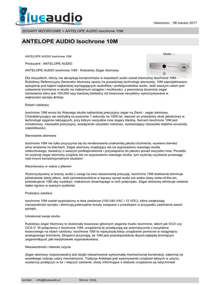 Utworzono : 08 marzec 2017 ZEGARY WZORCOWE > ANTELOPE AUDIO Isochrone 10M ANTELOPE AUDIO Isochrone 10M Model : - ANTELOPE AUDIO Isochrone 10M Producent : ANTELOPE AUDIO ANTELOPE AUDIO Isochrone 10M - Rubidowy Zegar Atomowy Dla wszystkich, którzy nie akceptują kompromisów w kwestiach audio został stworzony Isochrone 10M Rubidowy Referencyjny Generator Atomowy oparty na prawdziwej technologii atomowej. 10M zaprojektowano specjalnie pod kątem najbardziej wymagających audiofilów i profesjonalistów audio. Jeśli waszym celem jest ustawienie brzmienia w studio na maksimum osiągów i możliwości, z pewnością docenicie zegar odniesienia który jest 100,000 razy bardziej dokładny niż kwarcowe oscylatory wykorzystywane w większości sprzętu. Rdzeń rubidowy O I D U A E Isochrone 10M wnosi do Waszego studia najbardziej precyzyjny zegar na Ziemi - zegar atomowy. Charakteryzujący sie odchyłką na poziomie 1 sekundy na 1000 lat, stanowi on prawdziwy skok jakościowy w technologii zegarów taktujących, przy którym wszystkie inne zegary bledną. Sercem Isochrone 10M jest miniaturowy, niezwykle precyzyjny, szwajcarski oscylator rubidowy, wytwarzający niezwykle stabilne sinusoidy częstotliwości. Sterowanie atomowe Isochrone 10M nie tylko przyczynia się do renderowania znakomitej jakości brzmienia, wywiera również silne wrażenie na klientach. Zegar atomowy znajdujący sie na wyposażeniu waszego studia odsłuchowego, świadczy o waszym profesjonalizmie i przywiązaniu do jakości ponad wszystko inne. Ponadto im szybciej zegar atomowy znajdzie sie na wyposażeniu waszego studia, tym szybciej uzyskacie przewagę nad innymi konwencjonalnymi studiami. U L B Niezrównany w walce z jitterem Wykorzystywany w branży audio z uwagi na swa niesamowitą precyzję, Isochrone 10M dosłownie eliminuje jakiekolwiek ślady jittera. Jeśli zainwestowaliście w topowy sprzęt audio lub wideo klasy state-of-the-art, potrzebujecie 10M aby wydobyć maksimum drzemiącego w nich potencjału. Zegar atomowy eliminuje ostatnie słabe ogniwo w waszym systemie. Podwójny zasilacz Isochrone 10M został wyposażony w dwa zasilacze (100-240 VAC i 12 VDC), które zwiększają niezawodność sprzętu i eliminują potencjalne koszty związane z przestojem w przypadku zaistnienia awarii sprzętu. Udoskonal swoje studio Rubidowy zegar Atomowy to doskonały towarzysz głównych zegarów Audio Isochrone, takich jak OCX czy OCX-V. W połączeniu z Isochrone 10M, urządzenia te przełączają się automatycznie z oscylatora kwarcowego na rdzeń rubidowy. Isochrone 10M to najwyższej klasy urządzenie pomocne w osiągnięciu analogowego brzmienia. Eksperci przyznają, że 10M jest prawdopodobnie "najlepiej brzmiącym zegarem" jaki kiedykolwiek wyprodukowano. Niezawodność i łatwość użycia Zegar atomowy rozpoznawalny jest dzięki niesamowicie wytrzymałej mechanicznej konstrukcji, odpornej na wszelkiego rodzaju udary mechaniczne. Tradycja Antelope jest wykonywanie urządzeń łatwych w użyciu, wystarczy podłączyć w tor i włączyć zasilanie, diody informujące o statusie urządzenia są natychmiast kontakt : - [email protected] Strona 1/{nb} Utworzono : 08 marzec 2017 ZEGARY WZORCOWE > ANTELOPE AUDIO Isochrone 10M ANTELOPE AUDIO Isochrone 10M widoczne, zaś wszystkie niezbędne informacje podawane są na doskonale widocznym, cyfrowym wyświetlaczu. Dane techniczne � Dokładnośćrdzeń rubidowy o dokładności 0,03 części na MILIARD � Stabilnośćoscylator atomowy o stabilności wynoszącej 1 sekundę / 1000 lat � Zasilaczpodwójny zasilacz nadmiarowy � Wyjścia cyfrowe8 wyjść BNC z sygnałem 10MHz Cena : 25.710,00 zł Brutto ( 21.073,77 zł Netto) U L B kontakt : - [email protected] O I D U A E Strona 2/{nb}