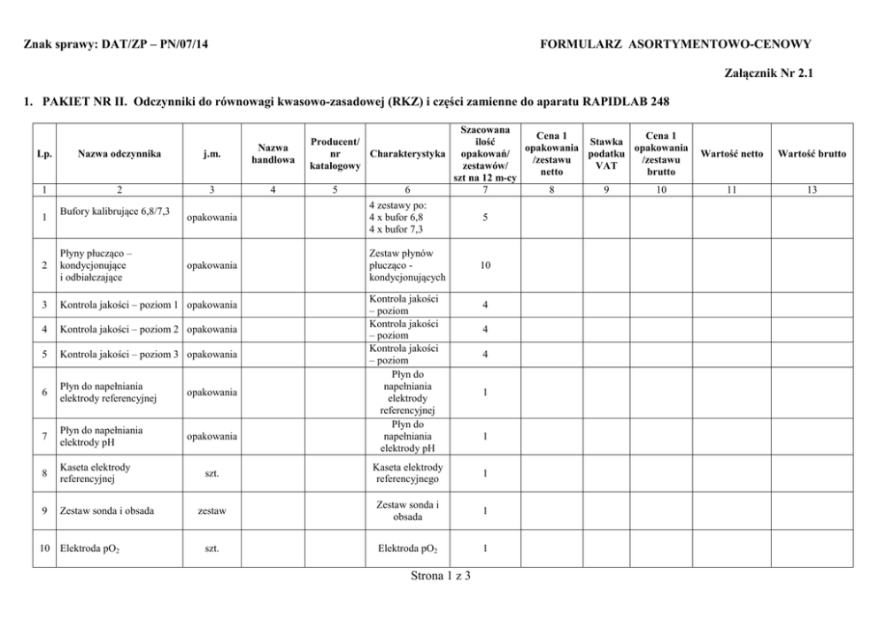 Znak sprawy: DAT/ZP – PN/07/14 FORMULARZ ASORTYMENTOWO-CENOWY Załącznik Nr 2.1 1. PAKIET NR II. Odczynniki do równowagi kwasowo-zasadowej (RKZ) i części zamienne do aparatu RAPIDLAB 248 Lp. Nazwa odczynnika j.m. Nazwa handlowa 1 2 3 4 1 Bufory kalibrujące 6,8/7,3 opakowania 2 Płyny płucząco – kondycjonujące i odbiałczające 3 Kontrola jakości – poziom 1 opakowania 4 Kontrola jakości – poziom 2 opakowania 5 Kontrola jakości – poziom 3 opakowania 6 Płyn do napełniania elektrody referencyjnej opakowania 7 Płyn do napełniania elektrody pH opakowania 8 Kaseta elektrody referencyjnej 9 Zestaw sonda i obsada 10 Elektroda pO2 opakowania Producent/ nr Charakterystyka katalogowy 5 6 4 zestawy po: 4 x bufor 6,8 4 x bufor 7,3 Szacowana Cena 1 Cena 1 ilość Stawka opakowania opakowania opakowań/ podatku /zestawu /zestawu zestawów/ VAT netto brutto szt na 12 m-cy 7 8 9 10 Zestaw płynów płucząco kondycjonujących Kontrola jakości – poziom Kontrola jakości – poziom Kontrola jakości – poziom Płyn do napełniania elektrody referencyjnej Płyn do napełniania elektrody pH 5 10 4 4 4 1 1 szt. Kaseta elektrody referencyjnego 1 zestaw Zestaw sonda i obsada 1 szt. Elektroda pO2 1 Strona 1 z 3 Wartość netto Wartość brutto 11 13 Znak sprawy: DAT/ZP – PN/07/14 FORMULARZ ASORTYMENTOWO-CENOWY Lp. Nazwa odczynnika j.m. Nazwa handlowa 1 2 3 4 11 Zestaw wężyków pompek próbki i odczynnika Producent/ nr Charakterystyka katalogowy 5 zestaw 6 Zestaw wężyków pompek próbki i odczynnika Szacowana Cena 1 Cena 1 ilość Stawka opakowania opakowania opakowań/ podatku /zestawu /zestawu zestawów/ VAT netto brutto szt na 12 m-cy 7 8 9 10 2 12 Elektroda pCO2 szt Elektroda pCO2 1 13 Elektroda pH szt. Elektroda pH 1 14 Elektroda referencyjna szt. Elektroda referencyjna 1 15 Kapilary z heparyną litową o pojemności 100 µl szt. Wyłącznie pH gazometria 8 16 Zatyczki do kapilar a’200 szt. szt. Zatyczki do kapilar 5 17 Mieszadełka do kapilar szt. Zestaw do mieszania – magnez i mieszadełko 5 18 Strzykawki szt. Strzykawka do krwi tętniczej 1 RAZEM Warunki graniczne: 1. Zamawiający wymaga aby odczynniki i kontrolne pochodziły od jednego producenta. 2. Zamawiający wymaga aby materiały zużywalne były zalecane przez producenta urządzenia (oryginalne). 3. Oferent zapewni dojazd i pracę autoryzowanego serwisu bezpłatnie dla Zamawiającego. Strona 2 z 3 Wartość netto Wartość brutto 11 13 Znak sprawy: DAT/ZP – PN/07/14 FORMULARZ ASORTYMENTOWO-CENOWY 4. Oferent musi dołączyć do oferty w formie elektronicznej (płyta CD) ulotki opisujące oferowane odczynniki w języku polskim oraz karty charakterystyk substancji niebezpiecznych występujących w oferowanych odczynnikach. 5. Instrukcje oraz karty wymienione w pkt 4 należy dostarczyć wraz z ofertą w formie elektronicznej. Oferta nie spełniająca warunków granicznych zostanie odrzucona. Potwierdzam prawdziwość zawartych powyżej danych (podpis wykonawcy) Strona 3 z 3