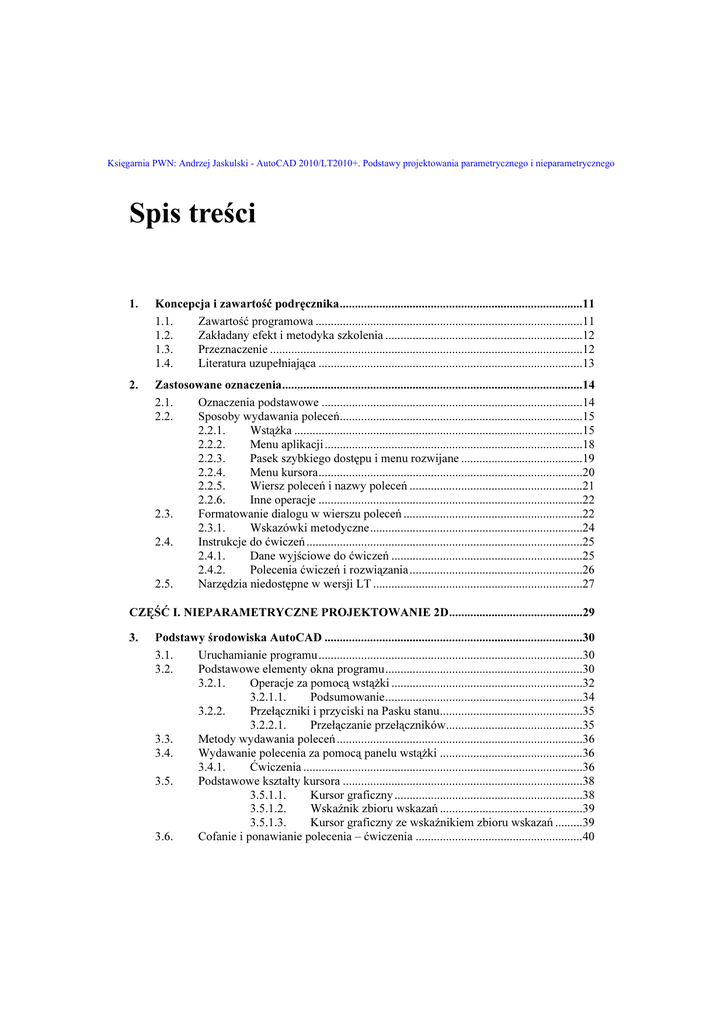 Księgarnia PWN: Andrzej Jaskulski - AutoCAD 2010/LT2010+. Podstawy projektowania parametrycznego i nieparametrycznego Spis treści 1. Koncepcja i zawartość podręcznika................................................................................11 1.1. Zawartość programowa ........................................................................................11 1.2. Zakładany efekt i metodyka szkolenia .................................................................12 1.3. Przeznaczenie .......................................................................................................12 1.4. Literatura uzupełniająca .......................................................................................13 2. Zastosowane oznaczenia...................................................................................................14 2.1. Oznaczenia podstawowe ......................................................................................14 2.2. Sposoby wydawania poleceń................................................................................15 2.2.1. Wstążka ...............................................................................................15 2.2.2. Menu aplikacji .....................................................................................18 2.2.3. Pasek szybkiego dostępu i menu rozwijane ........................................19 2.2.4. Menu kursora.......................................................................................20 2.2.5. Wiersz poleceń i nazwy poleceń .........................................................21 2.2.6. Inne operacje .......................................................................................22 2.3. Formatowanie dialogu w wierszu poleceń ...........................................................22 2.3.1. Wskazówki metodyczne......................................................................24 2.4. Instrukcje do ćwiczeń ...........................................................................................25 2.4.1. Dane wyjściowe do ćwiczeń ...............................................................25 2.4.2. Polecenia ćwiczeń i rozwiązania .........................................................26 2.5. Narzędzia niedostępne w wersji LT .....................................................................27 CZĘŚĆ I. NIEPARAMETRYCZNE PROJEKTOWANIE 2D............................................29 3. Podstawy środowiska AutoCAD .....................................................................................30 3.1. Uruchamianie programu.......................................................................................30 3.2. Podstawowe elementy okna programu.................................................................30 3.2.1. Operacje za pomocą wstążki ...............................................................32 3.2.1.1. Podsumowanie.................................................................34 3.2.2. Przełączniki i przyciski na Pasku stanu...............................................35 3.2.2.1. Przełączanie przełączników.............................................35 3.3. Metody wydawania poleceń .................................................................................36 3.4. Wydawanie polecenia za pomocą panelu wstążki ...............................................36 3.4.1. Ćwiczenia ............................................................................................36 3.5. Podstawowe kształty kursora ...............................................................................38 3.5.1.1. Kursor graficzny ..............................................................38 3.5.1.2. Wskaźnik zbioru wskazań ...............................................39 3.5.1.3. Kursor graficzny ze wskaźnikiem zbioru wskazań .........39 3.6. Cofanie i ponawianie polecenia – ćwiczenia .......................................................40 4 AutoCAD 2010/LT2010+. Podstawy projektowania 3.7. 3.8. 3.9. 3.10. 3.11. 3.12. 3.13. 3.14. 3.15. 3.16. 3.17. 3.18. 3.19. 3.20. Wydawanie polecenia za pomocą klawiatury ......................................................41 3.7.1. Okno poleceń i wiersz poleceń............................................................41 3.7.2. Rysowanie odcinków za pomocą klawiatury – ćwiczenia ..................42 Opcje poleceń .......................................................................................................44 3.8.1. Opcja domyślna ...................................................................................45 3.8.2. Pozostałe opcje ....................................................................................45 3.8.3. Opcje polecenia linia (line) .................................................................46 3.8.4. Ćwiczenia ............................................................................................46 Przerywanie działania polecenia ..........................................................................47 Powtarzanie poleceń .............................................................................................47 Ćwiczenia .............................................................................................................48 Wydawanie polecenia za pomocą Paska szybkiego dostępu ...............................48 Usuwanie obiektów – ćwiczenia ..........................................................................48 Zapisywanie projektu na dysku ............................................................................50 Podstawowe typy plików......................................................................................52 Ponowny zapis projektu na dysku ........................................................................52 Zapisywanie kopii projektu na dysku...................................................................52 Zamykanie okna projektu ..................................