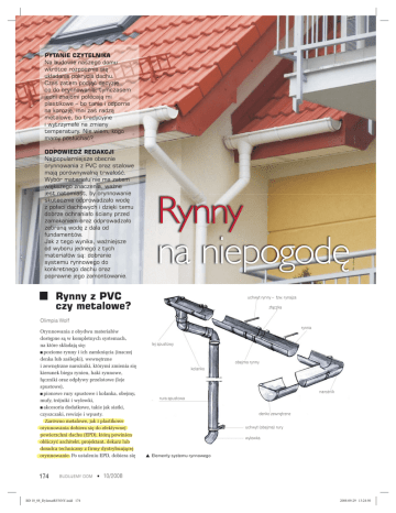 Dylematy ODPOWIED½ REDAKCJI Najpopularniejsze obecnie orynnowania z PVC oraz stalowe majÈ porównywalnÈ trwaïoĂÊ. Wybór materiaïu nie ma zatem wiÚkszego znaczenia, waĝne jest natomiast, by orynnowanie skutecznie odprowadzaïo wodÚ z poïaci dachowych i dziÚki temu dobrze ochraniaïo Ăciany przed zamakaniem oraz odprowadzaïo zebranÈ wodÚ z dala od fundamentów. Jak z tego wynika, waĝniejsze od wyboru jednego z tych materiaïów sÈ: dobranie systemu rynnowego do konkretnego dachu oraz poprawne jego zamontowanie. Rynny na niepogodÚ Rynny z PVC czy metalowe? ffot. fo ot. Gal ot. G Galeco eco ec co PYTANIE CZYTELNIKA Na budowie naszego domu wkrótce rozpocznie siÚ ukïadanie pokrycia dachu. Czas zatem podjÈÊ decyzjÚ co do orynnowania, tymczasem jedni znajomi polecajÈ mi plastikowe – bo tanie i odporne na korozjÚ, inni zaĂ radzÈ metalowe, bo tradycyjne i wytrzymaïe na zmiany temperatury. Nie wiem, kogo mamy posïuchaÊ? uchwyt rynny – tzw. rynajza zïÈczka Olimpia Wolf Orynnowania z obydwu materiaïów dostÚpne sÈ w kompletnych systemach, na które skïadajÈ siÚ: poziome rynny i ich zamkniÚcia (inaczej denka lub zaĂlepki), wewnÚtrzne i zewnÚtrzne naroĝniki, którymi zmienia siÚ kierunek biegu rynien, haki rynnowe, ïÈczniki oraz odpïywy przelotowe (leje spustowe), pionowe rury spustowe i kolanka, obejmy, mufy, trójniki i wylewki, akcesoria dodatkowe, takie jak siatki, czyszczaki, rewizje i wpusty. Zarówno metalowe, jak i plastikowe orynnowania dobiera siÚ do efektywnej powierzchni dachu (EPD), którÈ powinien obliczyÊ architekt, projektant, dekarz lub doradca techniczny z firmy dystrybuujÈcej orynnowanie. Po ustaleniu EPD, dobiera siÚ 174 BUDUJEMY DOM BD 10_08_DylematRYNNY.indd 174 rynna lej spustowy obejma rynny kolanko naroĝnik rura spustowa denko zewnÚtrzne uchwyt (obejma) rury wylewka Elementy systemu rynnowego 10/2008 2008-09-29 13:24:50 fot. Icopal Rynny z PVC czy metalowe? Orynnowanie metalowe ma duĝa odpornoĂÊ na zmiany temeperatury swoje wïaĂciwoĂci od –40 do +100oC. Aluminium jest odporne na temperaturÚ w zakresie od –30 do +100oC, a tytanocynk od –30 do +90. PVC zachowuje swoje wïaĂciwoĂci w temperaturze od –30 do +60oC; pod wpïywem ciepïa nieznacznie siÚ rozszerza. Orynnowanie z PVC ïÈczy siÚ zatem tak, by mogïo siÚ swobodnie rozszerzaÊ: w tym celu stosuje siÚ specjalne uszczelki z EPDM, czyli tworzywa odpornego na warunki atmosferyczne (wilgoÊ i zmiany temperatury). Uszczelki te umoĝliwiajÈ swobodne ruchy wszystkich elementów i jednoczeĂnie dobrze uszczelniajÈ caïy system rynnowy. Uwaga! Na dach silnie nasïoneczniony lepiej wybraÊ orynnowanie w jasnym kolorze, np. jasnobeĝowym lub popielatym, poniewaĝ ciemniejsze rynny pod wpïywem sïoñca szybciej pïowiejÈ. fot. Braas Dom wĂród drzew Specjalne uszczelki EPDM umoĝliwiajÈ swobodne ruchy elementów orynnowania z PVC odpo odpowiedniÈ ĂrednicÚ rur spustowych oraz prze przekrój rynien. Pr Przykïadowo: skuteczne odwodnienie dach o powierzchni: dachu do 60 m2 zapewniÈ rynny o Ărednicy 100 mm i rury spustowe 70 mm, okoïo 100 m2 – odpowiednio rynny 125 mm i rury spustowe 100 mm. Dobór przekroju rynien okreĂla siÚ w ten sposób: 1 m2 rzutu poziomego odwodnionej poïaci wymaga 0,8–1 cm2 przekroju rynny. JeĂli dachy nie majÈ koszy, czyli miejsc poïÈczenia dwóch poïaci dachowych, liczbÚ tÚ moĝna zmniejszyÊ do 0,5 cm2 na 1 m2 rzutu poïaci. Przekroje rynien i rur spustowych moĝna teĝ okreĂliÊ wedïug specjalnych tabel, opracowanych przez producentów systemów odwodnieñ. ChoÊ orynnowania metalowe i z PVC majÈ podobne wïaĂciwoĂci, zachowujÈ siÚ nieco odmiennie w róĝnych warunkach. JeĂli o dach domu ocierajÈ siÚ gaïÚzie, lepiej wybraÊ orynnowanie z PVC. Jest ono produkowane z nieplastyfikowanego polichlorku winylu, barwionego w masie na róĝne kolory, dlatego ewentualne zarysowania nie sÈ na nim widoczne. GïÚbsze rysy moĝna pokryÊ pastÈ renowacyjnÈ. Rynny stalowe sÈ mniej odporne na uszkodzenia mechaniczne: mogÈ zostaÊ porysowane przez ocierajÈce gaïÚzie lub konary drzew podczas np. duĝego wiatru. Ponadto w miejscu, w którym jest duĝo drzew, do rynien mogÈ wpadaÊ maïe gaïÈzki, szyszki i igliwie, które mogÈ uszkadzaÊ ich wewnÚtrznÈ powïokÚ. Podobnie wraĝliwe na zarysowania sÈ rynny aluminiowe, z tytanocynku oraz miedziane. Miejscowe zarysowanie powoduje powstanie ogniska korozji. Obfite opady Ăniegu W takich warunkach orynnowanie powinno mieÊ duĝÈ wytrzymaïoĂÊ mechanicznÈ, aby byïo odporne na ciÚĝar zsuwajÈcych siÚ z dachu mas Ăniegu i lodu. NajwiÚkszÈ wytrzymaïoĂÊ mechanicznÈ majÈ rynny stalowe, podobnÈ – rynny aluminiowe, trochÚ niĝszÈ – rynny miedziane oraz z tytanocynku. Rynny z PVC sÈ twarde, wiÚc ich zaletÈ jest to, ĝe nie uginajÈ siÚ pod naporem Ăniegu. Aby temu zapobiec warto zainstalowaÊ na dachu specjalne pïotki przeciwĂnieĝne, które nie dopuszczajÈ do zsuwania siÚ wielkich mas Ăniegu, a w rynnach uïoĝyÊ kable grzejne. PodïÈcza siÚ je do sterownika, czyli urzÈdzenia, które ma czujniki temperatury i wilgotnoĂci: gdy temperatura spada, kable nagrzewajÈ siÚ i w ten sposób zapobiegajÈ zamarzaniu wody i Ăniegu w rynnach i rurach spustowych. Pïotki przeciwĂnieĝne i kable grzejne moĝna takĝe instalowaÊ, gdy mamy orynnowanie metalowe. Zanieczyszczenia powietrza Czynniki takie jak kwaĂne deszcze i sïone mgïy mogÈ sprzyjaÊ korozji niektórych rodzajów orynnowania, innym nie szkodzÈ wcale. PVC. Wykazuje bardzo duĝÈ odpornoĂÊ na korozjÚ i sïone mgïy, nie jest teĝ podatne na korozjÚ kontaktowÈ, która wystÚpuje na styku róĝnych metali np. stali z miedziÈ. W takich warunkach sprawdza siÚ orynnowanie metalowe, poniewaĝ bardzo dobrze znosi róĝnice temperatury. Dotyczy to zwïaszcza stali i miedzi, które zachowujÈ fot. Galeco Dach silnie nasïoneczniony Systemy rynnowe z PVC majÈ najniĝszy 