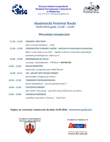Wyższa Szkoła Gospodarki Wydział Zarządzania i Inżynierii w Malborku (55) 272 56 27, [email protected] Akademicki Festiwal Nauki 18.05.2016 godz. 11.00 – 14.00 Warsztaty tematyczne 11.30 – 12.30 ZDROWO I BEZ NUDY mini warsztaty kulinarne – sushi 11.30 – 12.30 CIEKAWOSTKI Z KRAINY LASÓW – MYŚLIWI W GOSPODARCE ŁOWIECKIEJ dbaj o swoje miejsce na ziemi – aspekty ochrony środowiska naturalnego, działania proekologiczne, dzikie życie 12.00 – 13.00 DZIENNIKARZ OD KULIS warsztaty dziennikarskie – UWAGA!!! KONKURS 12.00 – 13.30 WALKI ROBOTÓW budowanie i programowanie Mind Storms 12.30 - 13.15 CZY „SELFIE” JEST WCIĄŻ TRENDY fototechnika i kompozycja obrazu 12.30 – 13.30 TAJEMNICE PROGRAMOWANIA ukryta komunikacja – język programowania C 13.00 – 13.30 COACHING KARIERY masz talent, motywację – sprawdź swoje preferencje zawodowe 13.00 – 14.00 ZARABIAJ NAJWIĘCEJ wypróbuj swój talent w biznesie – Cash Flow Zapisy na warsztaty tematyczne do dnia 16.05.2016, [email protected] PATRONAT HONOROWY Burmistrz Miasta Malborka PATRONAT MEDIALNY Wyższa Szkoła Gospodarki Wydział Zarządzania i Inżynierii w Malborku (55) 272 56 27, [email protected] Akademicki Festiwal Nauki 18.05.2016 godz. 11.00 – 14.00 Strefy tematyczne LOTERIADA może właśnie dzisiaj jest Twój szczęśliwy dzień SEAGWAY niezapomniane wrażenia ROBOLAB co robot może zrobić dla Ciebie – warsztaty z wykorzystaniem m.in.: LEGO Mindstorm, dron Parrot, eye tracker, e-motive, silnik Sterling’a. RUSZ GŁOWĄ łamigłówki i zagadki logiczne, kostka Rubika – UWAGA !!! KONKURS FIT JUMP z energią na trampolinie BĄDŹ KOWALEM SWOJEJ… MONETY jak robi się monety SZALONY NAUKOWIEC pokaz eksperymentów chemicznych przygotowany przez ZS nr 2 w Malborku PASJE TECHNICZNE pokaz przygotowany przez SP nr 9 w Malborku NIEPEŁNOSPRAWNOŚĆ – poznaj i poczuj bariery akcja społeczna nt. problemów osób niepełnosprawnych W POGOTOWIU pytania do policjanta, pierwsza pomoc przedmedyczna – Gimnazjum nr 3 w Malborku PRACOWNIK SZYTY NA MIARĘ – FLEX TCZEW warsztaty lutowania, testy na spostrzegawczość, płytka zręcznościowa itp. CUKROWNIA MALBORK – Krajowa Spółka Cukrowa S.A. słodkości na patyku POMORSKIE W UNII – ABC Funduszy Europejskich BANK MILLENNIUM ODDZIAŁ MALBORK młody biznesmen – UWAGA !!! KONKURS Moc atrakcji – bądź z nami Zapraszamy PATRONAT HONOROWY Burmistrz Miasta Malborka PATRONAT MEDIALNY