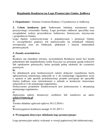 Regulamin Konkursu na Logo Promocyjne Gminy Jodłowa 1. Organizator: Gminne Centrum Kultury i Czytelnictwa w Jodłowej. 2. Celem konkursu jest: budowanie lokalnej tożsamości oraz pozytywnego wizerunku Gminy. Logo powinno oddawać specyfikę oraz uwzględniać walory przyrodnicze, kulturowe, historyczne, turystyczne i gospodarcze Gminy. Logo będzie wykorzystywane w popularyzacji i promocji Gminy w szczególności poprzez ich umieszczanie na nośnikach reklamy zewnętrznej oraz na folderach, plakatach i innych materiałach promocyjnych. 3. Zasady uczestnictwa: a) Konkurs ma charakter otwarty, uczestnikiem Konkursu może być każda pełnoletnia lub niepełnoletnia osoba fizyczna (za pisemną zgodą rodziców lub opiekunów prawnych), która posiada pełną zdolność do czynności prawnych. b) Do składanych prac konkursowych należy dołączyć wypełniona kartę zgłoszeniową stanowiącą załącznik nr 1 do niniejszego regulaminu wraz z opisem w jaki sposób przedstawiony projekt nawiązuje do specyfiki Gminy Jodłowa oraz oświadczenie o udziale w konkursie stanowiące załącznik nr 2 do niniejszego regulaminu. Dostarczenie projektów konkursowych jest jednoznaczne z akceptacją niniejszego regulaminu. c) Zgłoszenia należy dostarczyć osobiście lub emaliowo na adres [email protected] d) Termin składnia zgłoszeń upływa 30.12.2016 r. e) Rozstrzygniecie konkursu nastąpi 31.01.2017 r. 4. Wymagania dotyczące składania logo promocyjnego: Logo promocyjne należy wykonać w wersji papierowej lub elektronicznej. a) Wersja papierowa projektu powinna być zaprezentowana na sztywnej planszy w formacie nie mniejszym niż A4. b) Wersja elektroniczna powinna być zapisana na płycie CD w formacie PDF, JPG lub PNG o rozdzielczości nie mniejszej niż 300 dpi. c) Projekt Logo zarówno w formie papierowej jak i elektronicznej, podpisany będzie imieniem i nazwiskiem jego autora oraz danymi adresowymi. 5. Każdy uczestnik konkursu może zgłosić maksymalnie 2 propozycje logo promującego Gminę Jodłowa. 6. Zwycięzca konkursu otrzyma nagrodę o wartości : 1 000,00 zł (słownie: jeden tysiąc złotych). 7. Wyłonione drogą niniejszego konkursu Logo promocyjne stanie się własnością Organizatora konkursu, który może je w dowolny sposób wykorzystywać oraz odstępować na rzecz osób fizycznych i prawnych. 8. Każdy uczestnik na formularzu zgłoszeniowym wyraża zgodę na przeniesienie praw autorskich majątkowych na Organizatora konkursu. 9. Organizator zastrzega sobie prawo wykorzystania zgłoszonych do konkursu Logo bez uiszczenia dodatkowego wynagrodzenia. 10. Decyzja komisji konkursowej jest ostateczna i nie przysługuje od niej odwołanie. 11. Organizator zastrzega sobie prawo do opublikowania imienia i nazwiska laureatów konkursu oraz umieszczenie tych informacji w materiałach reklamowych organizatora bądź w mediach i Internecie. 12. Informacje dotyczące konkursu można uzyskać pod nr tel. 14 6813514. Załącznik nr 1 KARTA ZGŁOSZENIA DO KONKURSU NA LOGO GMINY JODŁOWA 1. Imię i nazwisko ……………………………………………………………………………………………………… 2. Adres zamieszkania ……………………………………………………………………………………………………… 3. Telefon kontaktowy ………………………………………………………………………………………………..……. 4. E-mail ………………………………………………………………………………………………………. 5. Wiek uczestnika …………………………………………………………………………………………..…………. 6. Opis projektu …………………………………………………………………………………………………………………….. ………………………………………………………………………………………………………………………… ………………………………………………………………………………………………………………………… ………………………………………………………………………………………………………………………… ………………………………………………………………………………………………………………………… ………………………………………………………………………………………………………………………… ………………………………………………………………………………………………………………………… ………………………………………………………………………………………………………………………… ………………………………………………………………………………………………………………………… ………………………………………………………………………………………………………………………… ………………………………………………………………………………………………………………………… ………………………………………………………………………………………………………………………… ………………………………………………………………………………………………………………………… …………………………………………………………………………………………………..………………………................................. (Data i czytelny podpis uczestnika konkursu) * w przypadku osoby niepełnoletniej (Data i czytelny podpis rodzica lub opiekuna)* Załącznik nr 2 OŚWIADCZENIE O UDZIALE W KONKURSIE DANE UCZESTNIKA KONKURSU Imię i nazwisko uczestnika konkursu: ……………………………
