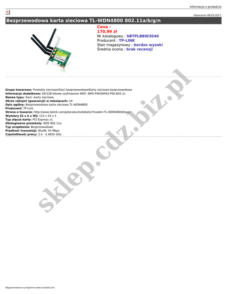 Informacje o produkcie Utworzono 08-03-2017 Bezprzewodowa karta sieciowa TL-WDN4800 802.11a/b/g/n Cena : 170,99 zł iz .p l Nr katalogowy : SBTPLBBW3040 Producent : TP-LINK Stan magazynowy : bardzo wysoki Średnia ocena : brak recenzji sk le p .c dz .b Grupa towarowa: Produkty sieciowe\Sieci bezprzewodowe\Karty sieciowe bezprzewodowe Informacje dodatkowe: 64/128 bitowe szyfrowanie WEP, WPA-PSK/WPA2-PSK,802.1x Nazwa typu: Sieci -karty sieciowe Okres rękojmi (gwarancji) w miesiącach: 24 Opis ogólny: Bezprzewodowa karta sieciowa TL-WDN4800 Producent: TP-Link Strona o towarze: http://www.tplink.com/pl/products/details/?model=TL-WDN4800#spec Wymiary [G x S x W]: 115 x 54 x 5 Typ złącza karty: PCI Express x1 Obsługiwane protokoły: IEEE 802.11a Typ urządzenia: Bezprzewodowe Prędkość transmisji: WLAN: 54 Mbps Częstotliwość pracy: 2.4 - 2.4835 GHz Wygenerowano w programie www.oscGold.com
