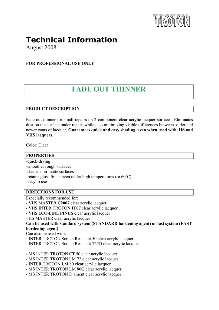 Technical Information August 2008 FOR PROFESSIONAL USE ONLY FADE OUT THINNER PRODUCT DESCRIPTION Fade-out thinner for small repairs on 2-component clear acrylic lacquer surfaces. Eliminates dust on the surface under repair, while also minimizing visible differences between older and newer coats of lacquer. Guarantees quick and easy shading, even when used with HS and VHS lacquers. Color: Clear PROPERTIES -quick-drying -smoothes rough surfaces -shades non-matte surfaces -retains gloss finish even under high temperatures (to 60oC) -easy to use DIRECTIONS FOR USE Especially recommended for: - VHS MASTER C2007 clear acrylic lacquer - VHS INTER TROTON IT07 clear acrylic lacquer - VHS ECO-LINE PINUS clear acrylic lacquer - HS MASTER clear acrylic lacquer Can be used with standard system (STANDARD hardening agent) or fast system (FAST hardening agent) Can also be used with: - INTER TROTON Scrach Resistant 50 clear acrylic lacquer - INTER TROTON Scrach Resistant 72/35 clear acrylic lacquer - MS INTER TROTON CT 50 clear acrylic lacquer - MS INTER TROTON LM 72 clear acrylic lacquer - INTER TROTON LM 80 clear acrylic lacquer - MS INTER TROTON LM 80G clear acrylic lacquer - MS INTER TROTON Diament clear acrylic lacquer Directions: Apply 1-3 thin layers of Fade-Out Thinner where old layers of lacquer meet new layers. Apply immediately after applying last coat of lacquer. Caution: This technical sheet gives directions for use with TROTON lacquer products. Specific information on these products is to be found in the technical sheets for those products. Spray Adhesion: Product is ready for use, ca. 10s., DIN 4 20oC. CAUTION For your safety, always act in accordance with the information contained in the technical operation sheet for dangerous substances. STORAGE Store product in a cool, dry place. Keep away from fire, high temperatures, and direct sunlight. WARRANTY FADE OUT THINNER - 24 months from date of production. Wszystkie informacje opierają się na skrupulatnych badaniach laboratoryjnych i długoletnim doświadczeniu. Ugruntowana pozycja na rynku nie zwalnia nas z ciągłej kontroli jakości naszych produktów. Jednak nie ponosimy odpowiedzialności za końcowe efekty przy niewłaściwym przechowywaniu lub uŜytkowaniu naszych wyrobów oraz za pracę niezgodną ze sztuką dobrego rzemiosła. TROTON sp. z o.o. Ząbrowo.
