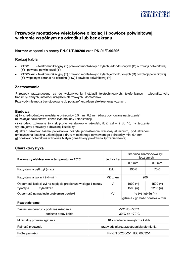 Przewody montażowe wielożyłowe o izolacji i powłoce polwinitowej, w ekranie wspólnym na ośrodku lub bez ekranu Norma: w oparciu o normy PN-91/T-90200 oraz PN-91/T-90206 Rodzaj kabla • YTDY - telekomunikacyjny (T) przewód montażowy o żyłach jednodrutowych (D) o izolacji polwinitowej (Y) i powłoce polwinitowej (Y) • YTDYekw - telekomunikacyjny (T) przewód montażowy o żyłach jednodrutowych (D) o izolacji polwinitowej (Y), wspólnym ekranie na ośrodku (ekw) i powłoce polwinitowej (Y) Zastosowanie Przewody przeznaczone są do wykonywania instalacji teletechnicznych: telefonicznych, telegraficznych, transmisji danych, instalacji urządzeń alarmowych i domofonów. Przewody nie mogą być stosowane do połączeń urządzeń elektroenergetycznych. Budowa a) żyła: jednodrutowe miedziane o średnicy 0,5 mm i 0,8 mm (druty ocynowane na życzenie) b) izolacja: polwinitowa, każda żyła ma inny kolor izolacji c) ośrodek: izolowane żyły skręcone warstwowo w ośrodek, ilość żył – 2 do 10, na życzenie wykonujemy przewody o dowolnej liczbie żył d) ekran ośrodka: taśma poliestrowa pokryta jednostronnie warstwą aluminium, pod ekranem umieszczona jest żyła uziemiająca z drutu miedzianego ocynowanego o średnicy min. 0,4 mm g) powłoka: polwinitowa w kolorze białym (inne kolory powłoki na życzenie klienta) Charakterystyka Jednostka Parametry elektryczne w temperaturze 20°C Rezystancja pętli żył (max) Ω/km Rezystancja izolacji żył (min) Średnica znamionowa żył miedzianych 0,5 mm 0,8 mm 195,6 75,0 MΩ x km Odporność izolacji żył na napięcie probiercze w ciągu 1 minuty żyła/żyła żyła/ekran V Odporność na napięcie probiercze powłoki kV 200 1000 (~) 1500 (=) 1500 (~) 2250 (=) 4e (~) lub 6e (=) gdzie e - grubość powłoki w mm Pozostałe dane Zakres temperatur: - podczas układania - podczas pracy kabla Minimalny promień zginania Palność przewodu Próba palności -5°C do +50°C -30°C do +70°C 10 x średnica zewnętrzna kabla przewody nierozprzestrzeniają płomienia PN-EN 50265-2-1 IEC 60332-1 Wymiary i masa 1 km kabli [mm] [mm] Średnica zewnętrzna oblicz. / max. [mm] 2x2x0,5 0,15 0,4 2,8 / 3,8 9 4x2x0,5 0,15 0,4 3,2 / 4,2 15 6x2x0,5 0,15 0,4 3,7 / 4,7 20 8x2x0,5 0,15 0,4 4,1 / 5,1 26 10x2x0,5 0,15 0,4 4,6 / 5,6 32 2x2x0,8 0,25 0,5 4,0 / 5,0 20 4x2x0,8 0,25 0,5 4,6 / 5,6 33 6x2x0,8 0,25 0,5 5,4 / 6,4 47 8x2x0,8 0,25 0,5 6,0 / 7,0 60 10x2x0,8 0,25 0,5 6,8 / 7,8 74 Typowymiar Minimalna grubość izolacji powłoki Orientacyjna masa kabla [kg/km] Pakowanie Krążki owinięte folią, długość odcinków fabrykacyjnych – 50, 100, 200m. Na szpulach owinięte folią, długość odcinków fabrykacyjnych – 500, 1000m. Informacje dodatkowe Kolory izolacji żył: Numer żyły 1 2 3 4 5 Barwa izolacji żył biała niebieska pomarańczowa zielona brązowa Numer żyły 6 7 8 9 10 Barwa izolacji żył szara czerwona czarna żółta fioletowa