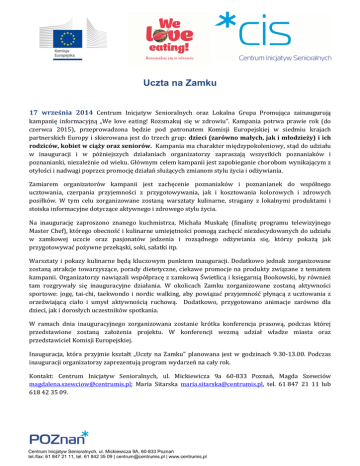 Uczta na Zamku 17 września 2014 Centrum Inicjatyw Senioralnych oraz Lokalna Grupa Promująca zainaugurują kampanię informacyjną „We love eating! Rozsmakuj się w zdrowiu”. Kampania potrwa prawie rok (do czerwca 2015), przeprowadzona będzie pod patronatem Komisji Europejskiej w siedmiu krajach partnerskich Europy i skierowana jest do trzech grup: dzieci (zarówno małych, jak i młodzieży) i ich rodziców, kobiet w ciąży oraz seniorów. Kampania ma charakter międzypokoleniowy, stąd do udziału w inauguracji i w późniejszych działaniach organizatorzy zapraszają wszystkich poznaniaków i poznanianki, niezależnie od wieku. Głównym celem kampanii jest zapobieganie chorobom wynikającym z otyłości i nadwagi poprzez promocję działań służących zmianom stylu życia i odżywiania. Zamiarem organizatorów kampanii jest zachęcenie poznaniaków i poznanianek do wspólnego ucztowania, czerpania przyjemności z przygotowywania, jak i kosztowania kolorowych i zdrowych posiłków. W tym celu zorganizowane zostaną warsztaty kulinarne, stragany z lokalnymi produktami i stoiska informacyjne dotyczące aktywnego i zdrowego stylu życia. Na inaugurację zaproszono znanego kuchmistrza, Michała Muskałę (finalistę programu telewizyjnego Master Chef), którego obecność i kulinarne umiejętności pomogą zachęcić niezdecydowanych do udziału w zamkowej uczcie oraz pasjonatów jedzenia i rozsądnego odżywiania się, którzy pokażą jak przygotowywać pożywne przekąski, soki, sałatki itp. Warsztaty i pokazy kulinarne będą kluczowym punktem inauguracji. Dodatkowo jednak zorganizowane zostaną atrakcje towarzyszące, porady dietetyczne, ciekawe promocje na produkty związane z tematem kampanii. Organizatorzy nawiązali współpracę z zamkową Świetlicą i księgarnią Bookowski, by również tam rozgrywały się inauguracyjne działania. W okolicach Zamku zorganizowane zostaną aktywności sportowe: jogę, tai-chi, taekwondo i nordic walking, aby powiązać przyjemność płynącą z ucztowania z orzeźwiającą ciało i umysł aktywnością ruchową. Dodatkowo, przygotowano animacje zarówno dla dzieci, jak i dorosłych uczestników spotkania. W ramach dnia inauguracyjnego zorganizowana zostanie krótka konferencja prasową, podczas której przedstawione zostaną założenia projektu. W konferencji wezmą udział władze miasta oraz przedstawiciel Komisji Europejskiej. Inauguracja, która przyjmie kształt „Uczty na Zamku” planowana jest w godzinach 9.30-13.00. Podczas inauguracji organizatorzy zaprezentują program wydarzeń na cały rok. Kontakt: Centrum Inicjatyw Senioralnych, ul. Mickiewicza 9a 60-833 Poznań, Magda Szewciów [email protected]; Maria Sitarska [email protected], tel. 61 847 21 11 lub 618 42 35 09. Centrum Inicjatyw Senioralnych, ul. Mickiewicza 9A, 60-833 Poznań tel./fax: 61 847 21 11, tel. 61 842 35 09 | [email protected] | www.centrumis.pl „Uczta na zamku” - Inauguracja Kampanii „We love eating! Rozsmakuj się w zdrowiu” Termin: 17 września 2014 Godziny: 9.30-13.00 Miejsce: CK Zamek, Święty Marcin 80/86, Poznań (sala pod zegarem) PROGRAM INAUGURACJI Sala pod zegarem – wejście przez hol główny i kawiarnię Świetlica (schodami lub windą) Sala konferencyjna 9.30 Konferencja prasowa z udziałem przedstawiciela KE, prezydenta Miasta Poznania i przedstawicieli Urzędu Miasta Poznania; 10.00 Michał Muskała – kulinarny quiz 11.00 „Odżywianie w ciąży” – dr inż. Magdalena Człapka – Matyasik, Uniwersytet Przyrodniczy, Wydział Nauk o Żywności i Żywieniu, Zakład Dietetyki 11.30 „Odżywianie w wieku dojrzałym” – Jolanta Twardowska-Rajewska, Uniwersytet im. Adama Mickiewicza 12.00 „Odżywianie dzieci i młodzieży” – Monika Frank „Mój Dietetyk” 12.30 „Praktyka uważnego jedzenia” – Agnieszka Pawłowska, Centrum psychologiczno-coachingowe Inspeerio Sala warsztatowa 10.00 – 12.00 Animacje z tańcem oraz cyrkowe w sali warsztatowej (Polskie Stowarzyszenie Pedagogów i Animatorów Klanza) 12.00 „Jak nie marnować jedzenia?” – warsztaty Bank Żywności Hol degustacje (Prosto z Sadu, Orkiszowe Pola, Eko Bazar, Sobota HR, Klub Seniora Nowa, wody z uzdrowiska Wysowa w Beskidzie Niskim – „Józef”, „Henryk” i „Franciszek”) stoiska z lokalnymi produktami i stoiska informacyjne dotyczące aktywnego i prozdrowotnego stylu życia (We Love Eating, Europe Direct, Psyche Soma Polis, Prosto z Sadu, Orkiszowe Pola, Eko Bazar, Sobota HR, Klub Seniora Nowa, wody z uzdrowiska Wysowa w Beskidzie Niskim); porady dietetyczne dla dzieci, kobiet w ciąży i seniorów; Ponadto Piknik na trawie i wymiana owocowo-warzywna 10.00 Tai chi – Stowarzyszenie Taoistycznego Tai Chi w Polsce 11.00 Joga – Namaste Yoga 12.00 Teakwondo – pokaz Klubu Sportowego Czerwony Smok Poznań 10.30-12.00 Nordic walking –„Marsz po zdrowie” Bezpłatna woda i specjalne promocje w kawiarni Świetlica Promocje na literaturę związaną tematycznie z jedzeniem w księgarni Bookowski Centrum Inicjatyw Senioralnych, ul. Mickiewicza 9A, 60-833 Poznań tel./fax: 61 847 21 11, tel. 61 842 35 09 | [email protected] | www.centrumis.pl