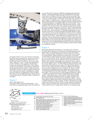na test, podany adres. Wreszcie w głębokim podwórku wśród magazynów znajduje... nową siedzibę Redakcji. A w niej czeka ROWER. Pierwsze spojrzenie, pierwsze dotknięcie. Dość lekki! Waga wskazuje ciut powyżej 8 kg. Carbon Treka, osprzęt Shimano Ultegra i komponenty Bontrager. Jak zwykle w Trekach, prawie wszystkie ze stajni Keitha. W tym drugi co do ważności po ramie: widelec. To model Race Lite - carbonowe ramiona z aluminiową rurą sterową. Dzięki powiększeniu dolnego łożyska konstruktorzy mogli zastosować mniej tkaniny węglowej, co pozytywnie odbiło się na masie widelca. I trzeci z ważnych elementów: koła, model Race. Białe aluminiowe obręcze o niskim profilu (21 mm) i szerokości 20 mm. Koła zaplecione spłaszczonymi, aerodynamicznymi, stalowymi szprychami. Z przodu 20, z tyłu 24 sztuki. Piasty także Bontrager, aluminiowe, z łożyskami maszynowymi. Opony: model Race X Lite AC. Masa 235 g - bardzo przyzwoita. I kontynuując najazd kamery na rower: aluminiowa kierownica o anatomicznym gięciu Race Blade (faktycznie spłaszczona jak ostrze do cięcia powietrza) połączona średnicą 31,8 mm z aluminiowym wspornikiem Race Lite. Na „drugim końcu” na carbonowej sztycy siodło - model InForm R2. Białe - idealnie dobrane do kolorystyki roweru, ale... niepraktyczne. Osprzęt zastosowany do napędzania roweru to prawie kompletna grupa Ultegra. Z niższej 105 pochodzi tylko kaseta. Dobór ilości zębów w zębatkach korby i kasety wskazuje grupę docelowych odbiorców: zaangażowani amatorzy. W rowerze znajdą kompaktową korbę (50/34) połączoną z kasetą 11-25. Dają one w sumie szeroki i bardzo praktyczny zestaw przełożeń jednak bez wyścigowych aspiracji. Scena 4 do 5 tysięcy. Dużo? I’m sorry, that’s still Lance technology! Świadczy o tym choćby geometria. Tegoroczna seria 4 ma identyczne wszystkie wymiary, jak zeszłoroczna 6. Przy projektowaniu nowych ram Madone, oprócz słów-wytrychów: „sztywność” i „masa”, równie często pojawiało się „komfort”. Madone ma być wygodnym i komfortowym rowerem dla zawodowców! Do niedawna takie zestawienie było nie do pomyślenia. Jednak wszyscy zawodnicy po testach podkreślali ważność komfortu i dobre właściwości amortyzujące nowych ram. Oprócz wszystkich powyższych cech, ramy są po prostu piękne. Skomplikowane, aerodynamiczne kształty rur są nieopisywalne. Zobaczcie zdjęcia albo wybierzcie się do najbliższego sklepu, aby powieść po nich opuszkami palców. Perfekcja kształtów i wykonania są powalające. Scena 3 Kraków. Kilka tygodni temu. Ulicą wzdłuż wałów nad wezbraną Wisłą jedzie... samochód. Kierowca najwyraźniej czegoś szuka. Ma zaproszenie Dolina Aleksandrowicka pod Krakowem. 2 dni później, godz. 6.30 rano. Do widoku dwóch kolarzy o tak wczesnej porze przyzwyczaiły się już nawet lokalne „Burki”. Szczekną kilka razy, ale nie chce im się już gonić NAS po drodze. A droga prowadzi z Aleksandrowic do Kleszczowa, przez sosnowy las i między domami. Właśnie położyli na niej nowy asfalt. To mój ulubiony/znienawidzony podjazd treningowy i testowy. Odcinek pomiarowy na nim ma 1 km, różnicę w pionie 190 m, a chwilowe nachylenie sporo ponad 15%. W miarę wzrostu formy w sezonie udaje się urwać na nim po kilka sekund. Madone „idzie” pod górę zachwycająco łatwo. Sztywność boczna ramy jest niesamowita. Reakcja na nacisk pedałów natychmiastowa. Do tego koła - lekkie i zrywne. Wynik na górze: - 10 sekund lepiej od najlepszego tegorocznego wjazdu. Łał! (z teksańskim akcentem, przyp. red.). Moja własna szosówka to też Trek, ale z aluminiową ramą i carbonowym widelcem. Ma identyczny zestaw przełożeń obsługiwanych przez nową grupę 105. Różnica w działaniu obu grup jest zaskakująco wyczuwalna. Ultegra zmienia biegi szybciej, z bardziej zdecydowanie metalicznym dźwiękiem. 105 wydaje się przy niej zbyt „miękka”. Duża różnica jest też w ruchu dźwigni potrzebnym do redukcji - w Ultegrze jest o kilka stopni mniejszy. Każdy podjazd kończy się kiedyś zjazdem. I wtedy Madone jest w swoim żywiole. Geometria jest genialnie neutralna, prowadzenie niesłychanie pewne i precyzyjne. Zakręty na zjeździe to poezja. Na tym rowerze każdy można przejechać szybciej... i jeszcze trochę szybciej. Jedynym ograniczeniem okazały się opony, które nie tolerują w szybkich zakrętach ani wody, ani piasku, ani błota. Przyczepność tracą nagle i opanowanie poślizgu jest trudne. Jednak na czystym asfalcie trzymają bardzo dobrze, zarówno w zakrętach, jak i przy hamowaniu. Gdy zjazd się skończy a dobry asfalt zmieni się w zwykły, polski, okazuje się, że zawodowcy mają 540 mm 75° TREK MADONE 4.7 Cena: 9 990 zł Współczynnik bB: 100 g za 123 zł* 73,3° 410 mm 265 mm 985 mm Rama: TCT carbon Rozmiary: 50, 52, 54, 56, 58, 60, 62 cm Geometria: rozmiar testowany: 54 cm Masa kompletnego roweru: 8 100 g Masa ramy: 1230 g Masa przedniego koła: 1205 g Masa tylnego koła: 1795 g 92 bi ke Bo ar d # 7 l i pi e c 2010 Przedni widelec: Bontrager Race Lite (425 g) Koła: Bontrager Race Opony: Bontrager Race Lite AC 700x23C (235 g, dętka: 65 g) Korby: Shimano Ultegra FC-6700 50/34T (172.5 mm) Kaseta: Shimano 105 CS-5600 (11-25) 10-rz. Łańcuch: Shimano Ultegra CN-6700 Przerzutka przód: Shimano Ultegra FD-6700 Przerzutka tył: Shimano Ultegra RD-6700 Manetki: Shimano Ultegra ST-6700 Klamki: Shimano Ultegra ST-6700 Hamulce: Shimano Ultegra BR-6700 Kierownica: Bontrager Race Blade VR (420 mm) Wspornik kierownicy: Bontrager Race Lite (90 mm) Łożyska sterów: Cane Creek Wspornik siodełka: Bontrager carbon (350 mm) Siodełko: Bontrager InForm R2 Pedały: -