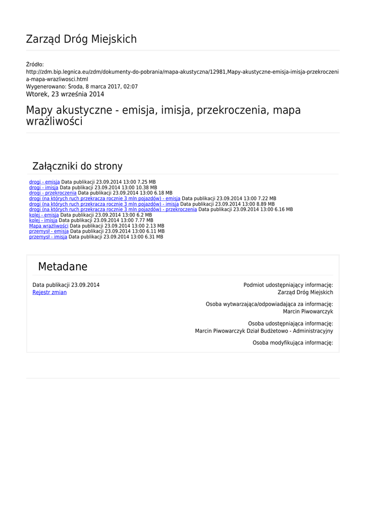 Zarząd Dróg Miejskich Źródło: http://zdm.bip.legnica.eu/zdm/dokumenty-do-pobrania/mapa-akustyczna/12981,Mapy-akustyczne-emisja-imisja-przekroczeni a-mapa-wrazliwosci.html Wygenerowano: Środa, 8 marca 2017, 02:07 Wtorek, 23 września 2014 Mapy akustyczne - emisja, imisja, przekroczenia, mapa wrażliwości Załączniki do strony drogi - emisja Data publikacji 23.09.2014 13:00 7.25 MB drogi - imisja Data publikacji 23.09.2014 13:00 10.38 MB drogi - przekroczenia Data publikacji 23.09.2014 13:00 6.18 MB drogi (na których ruch przekracza rocznie 3 mln pojazdów) - emisja Data publikacji 23.09.2014 13:00 7.22 MB drogi (na których ruch przekracza rocznie 3 mln pojazdów) - imisja Data publikacji 23.09.2014 13:00 8.89 MB drogi (na których ruch przekracza rocznie 3 mln pojazdów) - przekroczenia Data publikacji 23.09.2014 13:00 6.16 MB kolej - emisja Data publikacji 23.09.2014 13:00 6.2 MB kolej - imisja Data publikacji 23.09.2014 13:00 7.77 MB Mapa wrażliwości Data publikacji 23.09.2014 13:00 2.13 MB przemysł - emisja Data publikacji 23.09.2014 13:00 6.11 MB przemysł - imisja Data publikacji 23.09.2014 13:00 6.31 MB Metadane Data publikacji 23.09.2014 Rejestr zmian Podmiot udostępniający informację: Zarząd Dróg Miejskich Osoba wytwarzająca/odpowiadająca za informację: Marcin Piwowarczyk Osoba udostępniająca informację: Marcin Piwowarczyk Dział Budżetowo - Administracyjny Osoba modyfikująca informację: