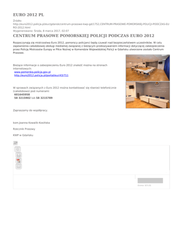 EURO 2012 PL Źródło: http://euro2012.policja.pl/eur/gdansk/centrum-prasowe-kwp-gd/1752,CENTRUM-PRASOWE-POMORSKIEJ-POLICJI-PODCZAS-EU RO-2012.html Wygenerowano: Środa, 8 marca 2017, 02:07 CENTRUM PRASOWE POMORSKIEJ POLICJI PODCZAS EURO 2012 Rozpoczynają się mistrzostwa Euro 2012, pomorscy policjanci będą czuwali nad bezpieczeństwem uczestników. W celu zapewnienia całodobowej obsługi medialnej związanej z bieżącym przekazywaniem informacji dotyczącej zabezpieczenia przez Policję Mistrzostw Europy w Piłce Nożnej w Komendzie Wojewódzkiej Policji w Gdańsku utworzone zostało Centrum Prasowe. Bieżące informacje o zabezpieczeniu Euro 2012 znaleźć można na stronach internetowych: www.pomorska.policja.gov.pl http.//euro2012.policja.pl/portal/eur/43/711 W sprawach związanych z Euro 2012 można kontaktować się również telefonicznie (całodobowo) pod numerami: 601645958 58 3215902 lub 58 3215789 Zapraszamy do współpracy. kom.Joanna Kowalik-Kosińska Rzecznik Prasowy KWP w Gdańsku Ocena: 0/5 (0)