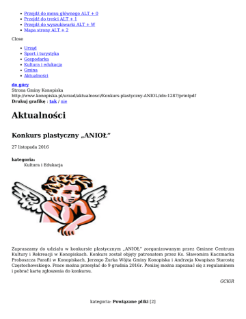 Przejdź do menu głównego ALT + 0 Przejdź do treści ALT + 1 Przejdź do wyszukiwarki ALT + W Mapa strony ALT + 2 Close Urząd Sport i turystyka Gospodarka Kultura i edukacja Gmina Aktualności do góry Strona Gminy Konopiska http://www.konopiska.pl/urzad/aktualnosci/Konkurs-plastyczny-ANIOL/idn:1287/printpdf Drukuj grafikę : tak / nie Aktualności Konkurs plastyczny „ANIOŁ” 27 listopada 2016 kategoria: Kultura i Edukacja Zapraszamy do udziału w konkursie plastycznym „ANIOŁ” zorganizowanym przez Gminne Centrum Kultury i Rekreacji w Konopiskach. Konkurs został objęty patronatem przez Ks. Sławomira Kaczmarka Proboszcza Parafii w Konopiskach, Jerzego Żurka Wójta Gminy Konopiska i Andrzeja Kwapisza Starostę Częstochowskiego. Prace można przesyłać do 9 grudnia 2016r. Poniżej można zapoznać się z regulaminem i pobrać kartę zgłoszenia do konkursu. GCKiR kategoria: Powiązane pliki [2] format Nazwa pliku Data publikacji Rozmiar Pobierz pdf Regulamin konkursu "Anioł" 2016 16-11-18 12:44 408.22KB pobierz plik: Regulamin konkursu "Anioł" 2016 pdf Karta zgłoszenia do konkursu "ANIOŁ" 2016 16-11-18 12:44 490.09KB pobierz plik: Karta zgłoszenia do konkursu "ANIOŁ" 2016 powrót do listy aktualności